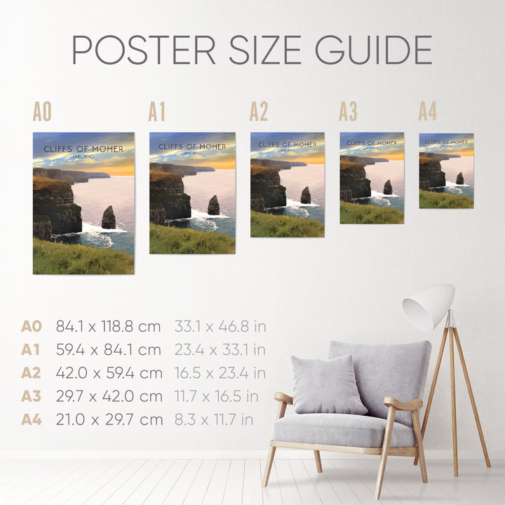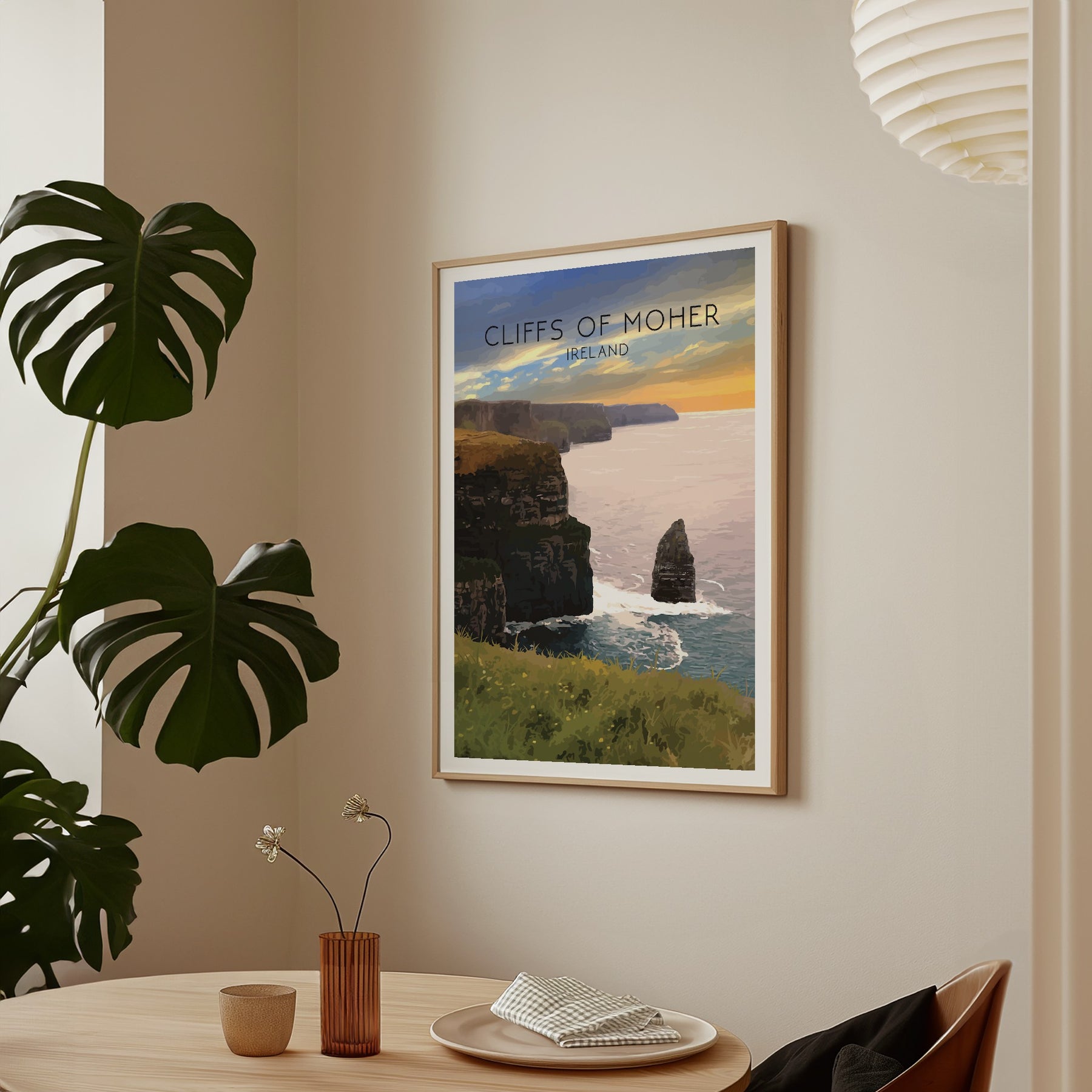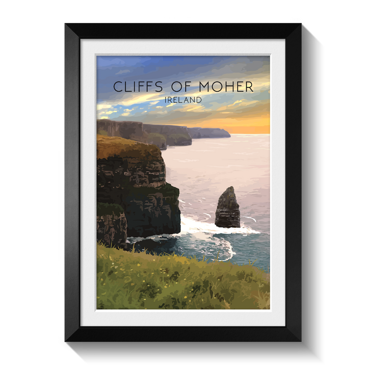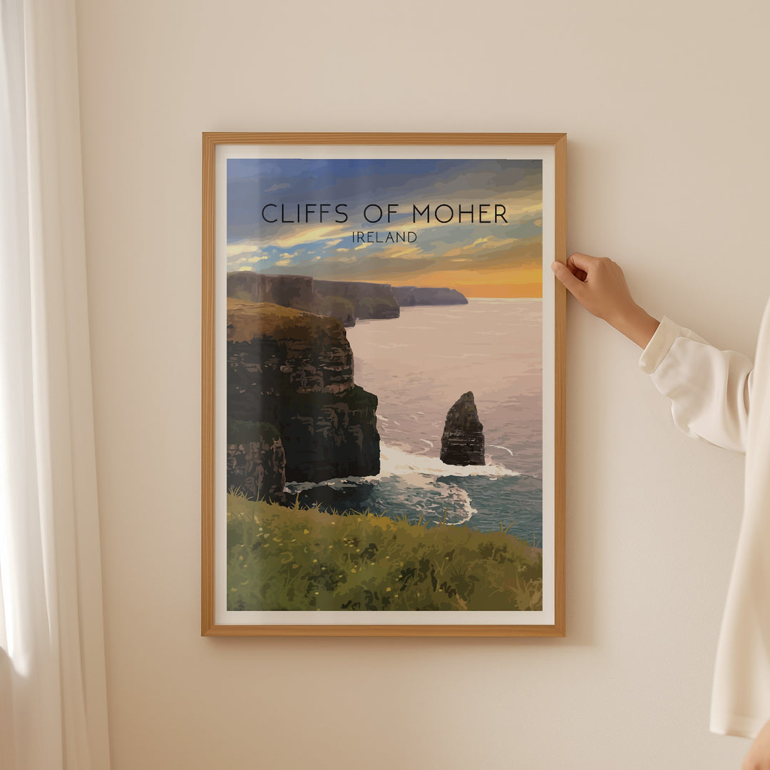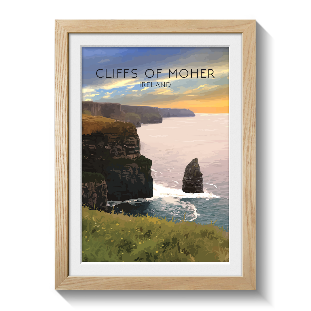 This is an original travel poster of Ireland's Cliffs of Moher in the Burren region of County Clare.