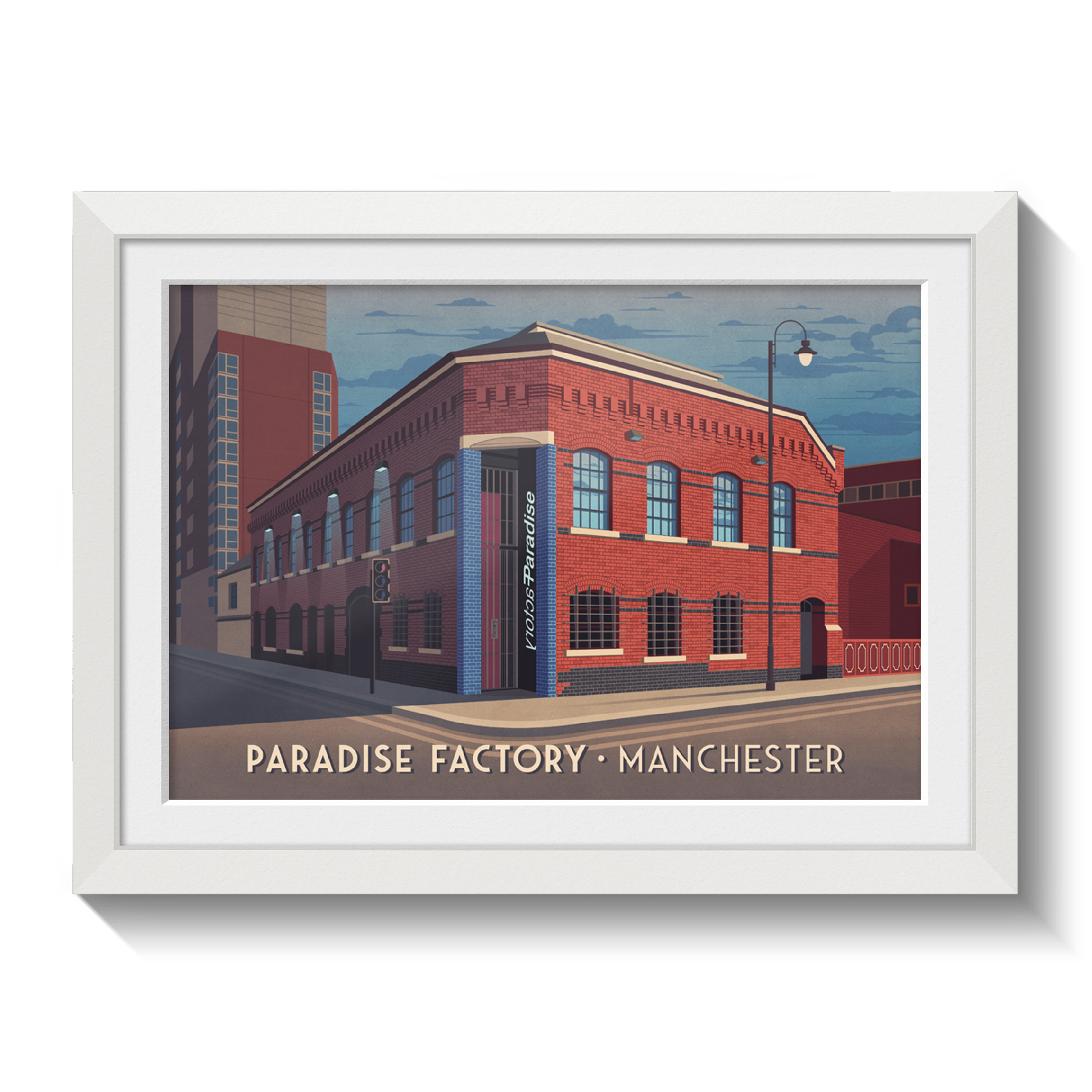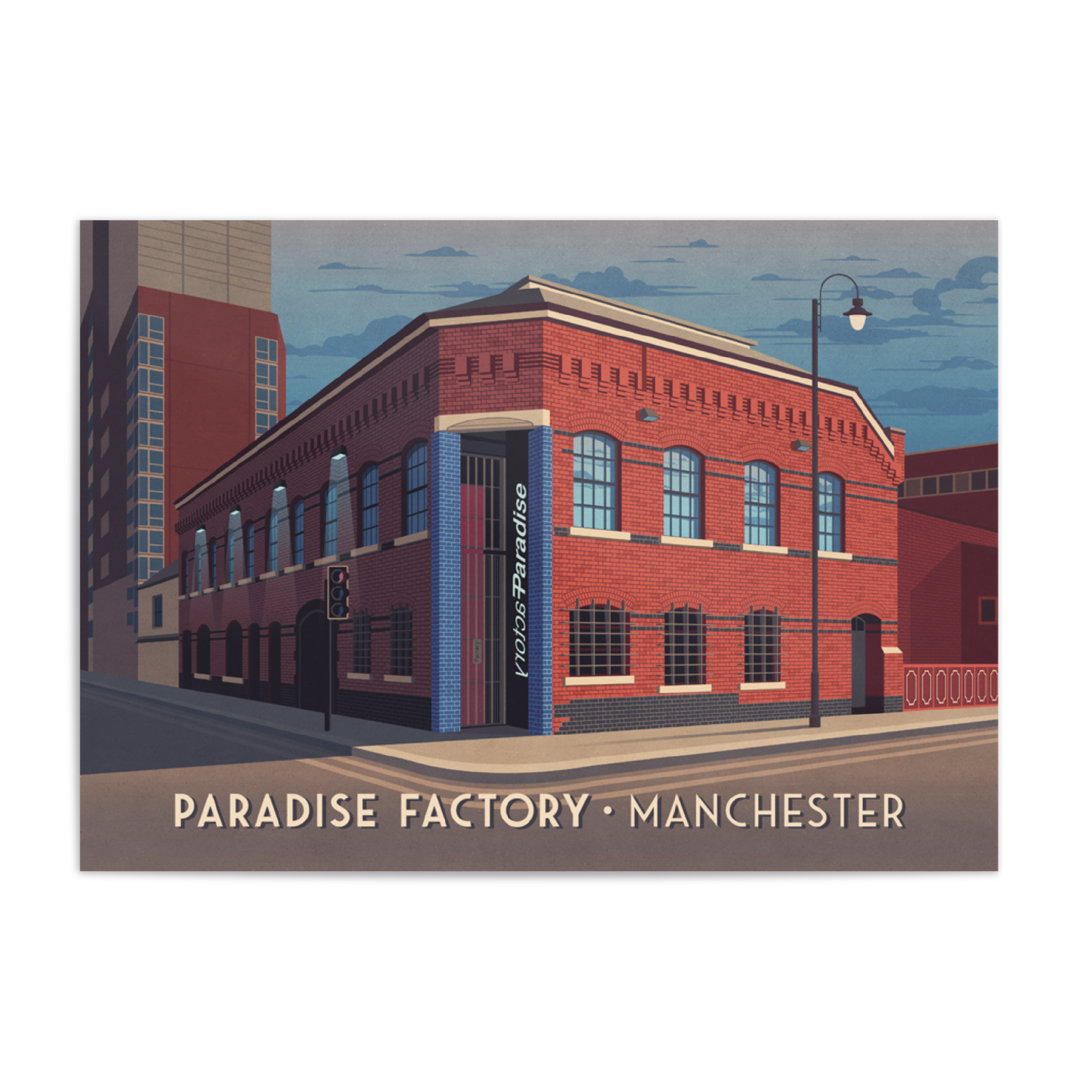 This Paradise Factory travel poster captures the vibrant spirit of Manchester’s iconic nightclub. Perfect for music lovers and nightlife enthusiasts, it brings a piece of the city's energetic club scene into any space. Celebrating Manchester’s cultural history, this print is a stylish tribute to an unforgettable nightlife landmark.