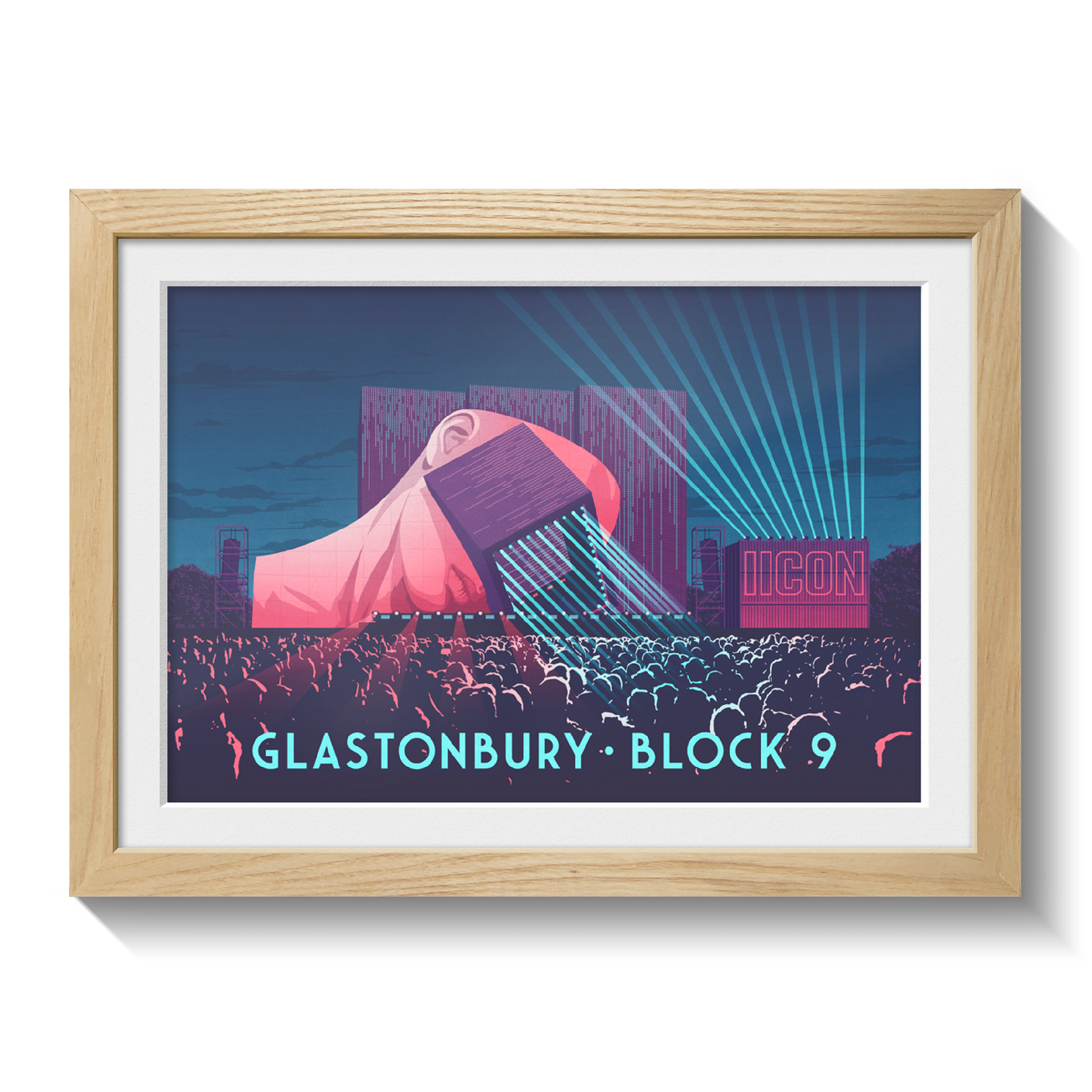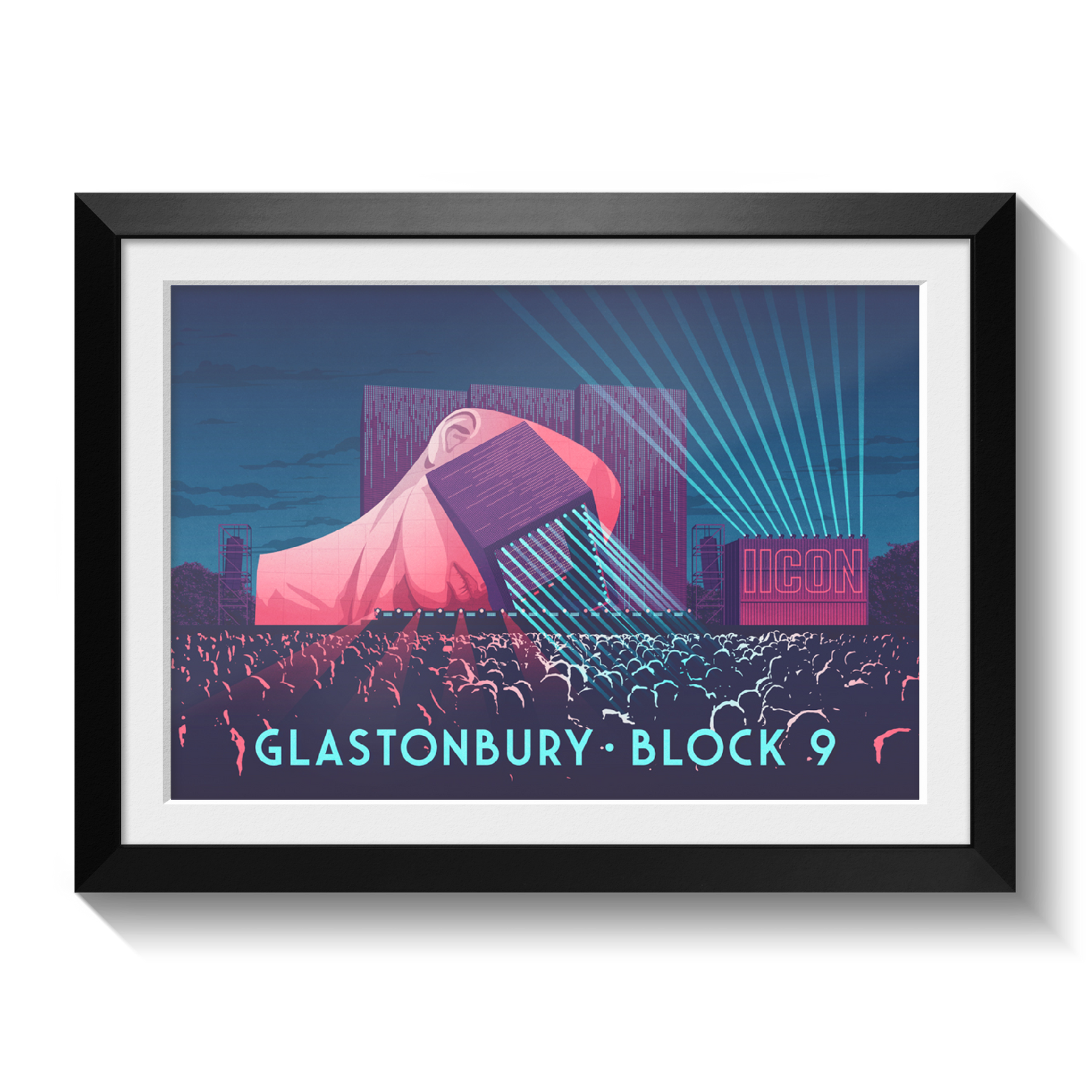 An original travel poster featuring the iconic Block 9 in Glastonbury's South East Corner. The poster features the imposing IICON stage.