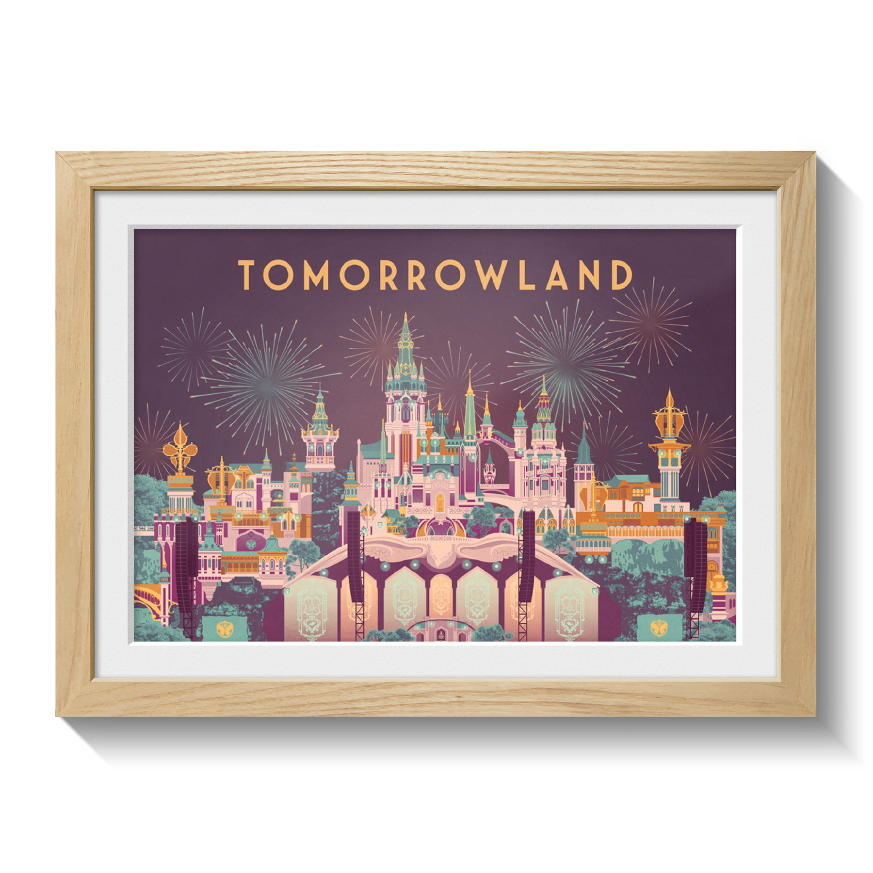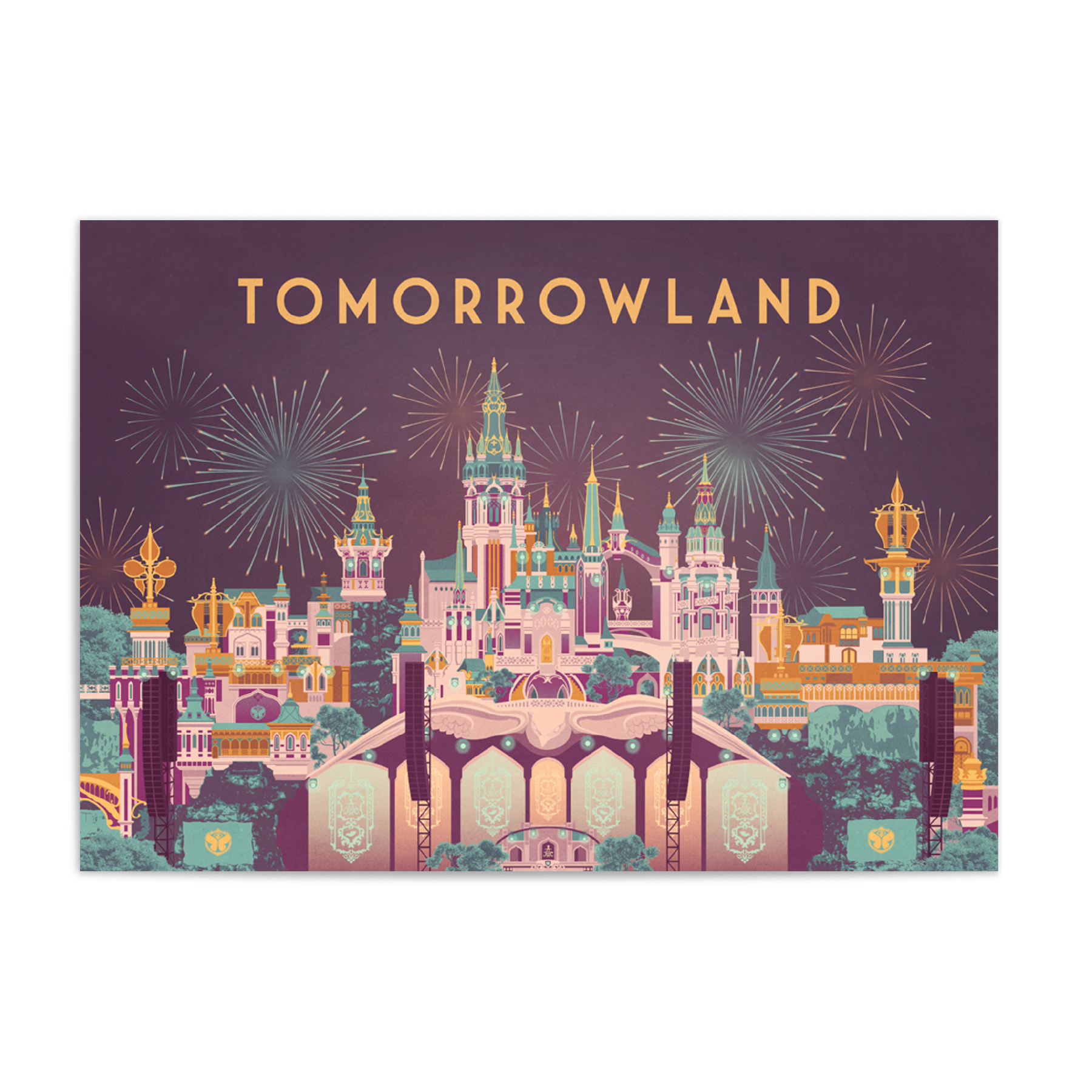 An original travel print featuring the 2023 main stage at legendary Electronic Dance Music festival, Tomorrowland.