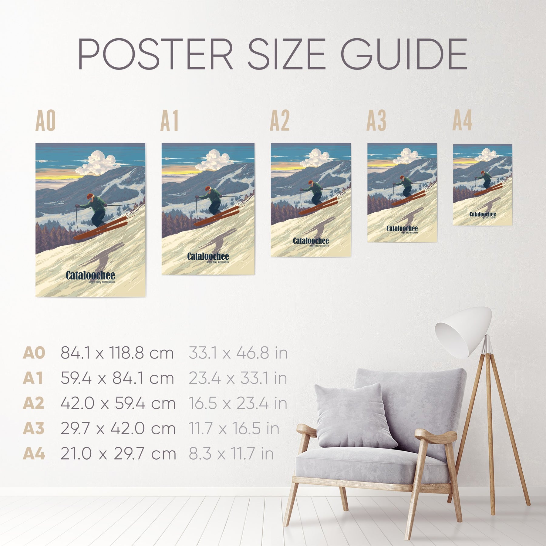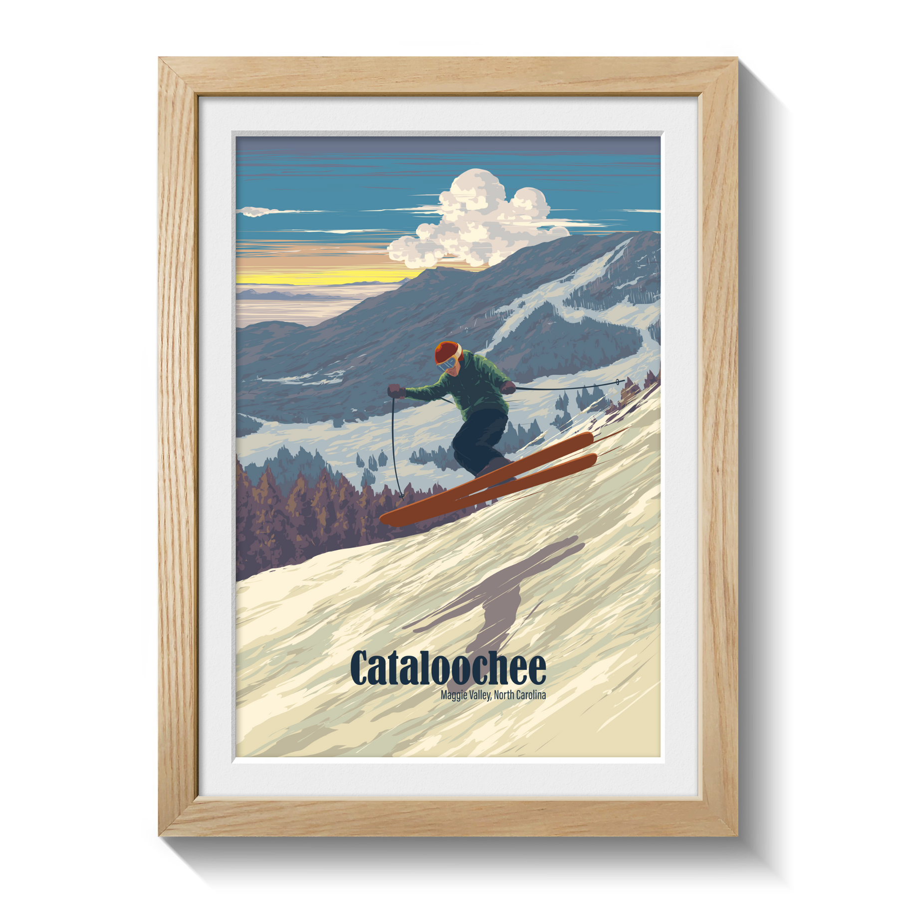 This Cataloochee Ski Area travel poster showcases the winter charm of North Carolina’s beloved resort in Maggie Valley. Perfect for skiers, snowboarders, and mountain lovers, it highlights the Blue Ridge Mountains' snowy slopes and family-friendly vibe. A stylish decor piece celebrating the Southern Appalachian beauty of Cataloochee Ski Resort.