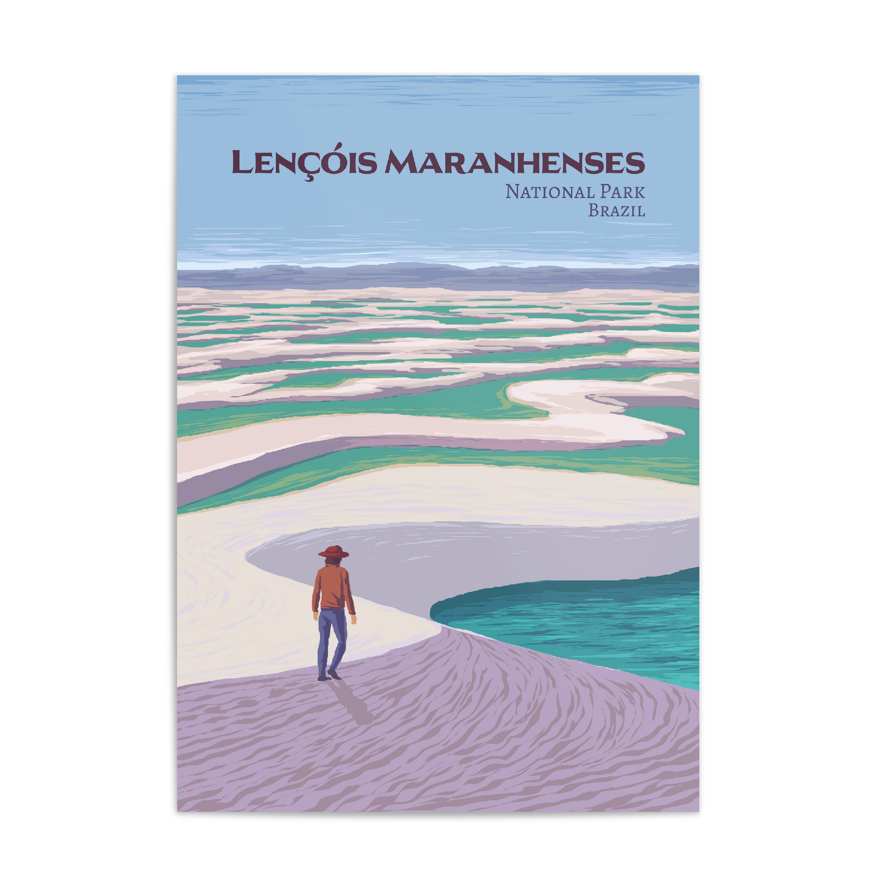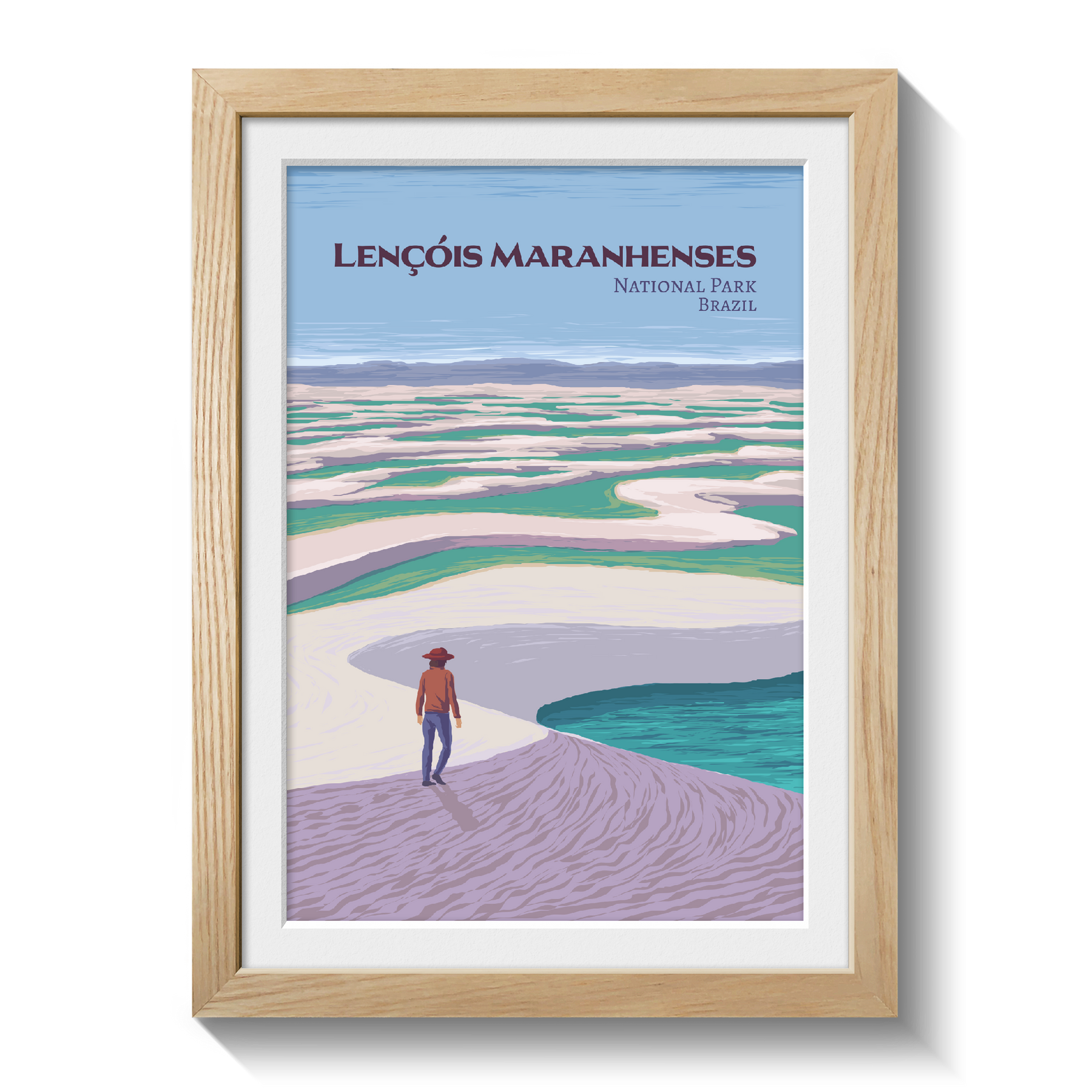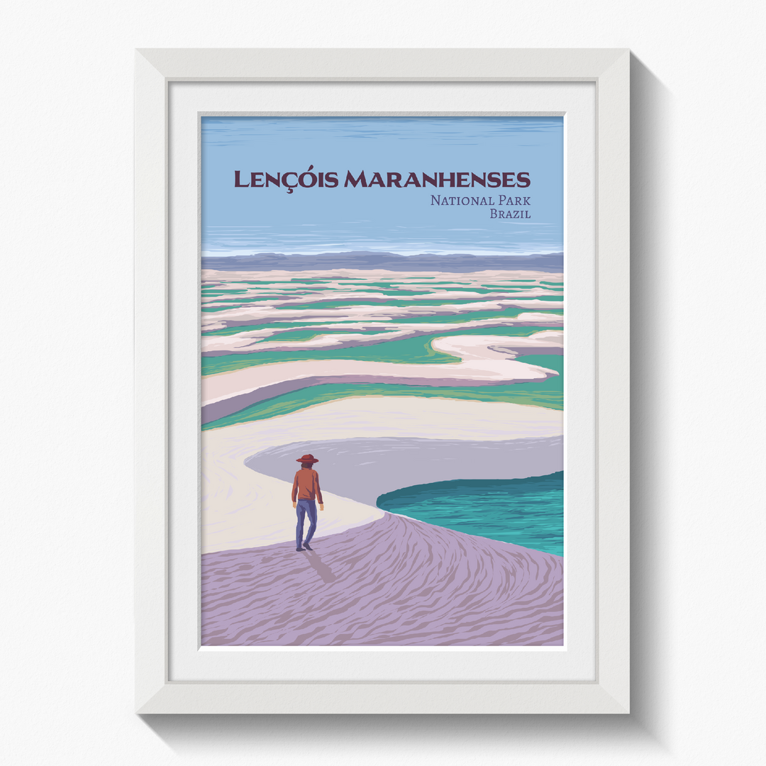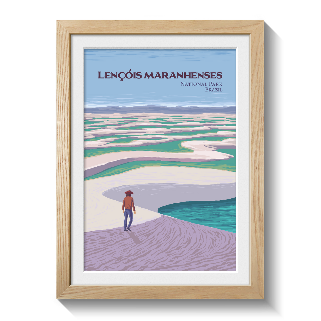 An original travel print featuring Lençóis Maranhenses National Park, Brazil.