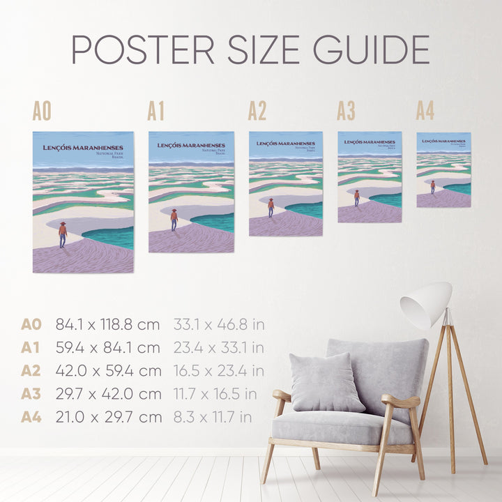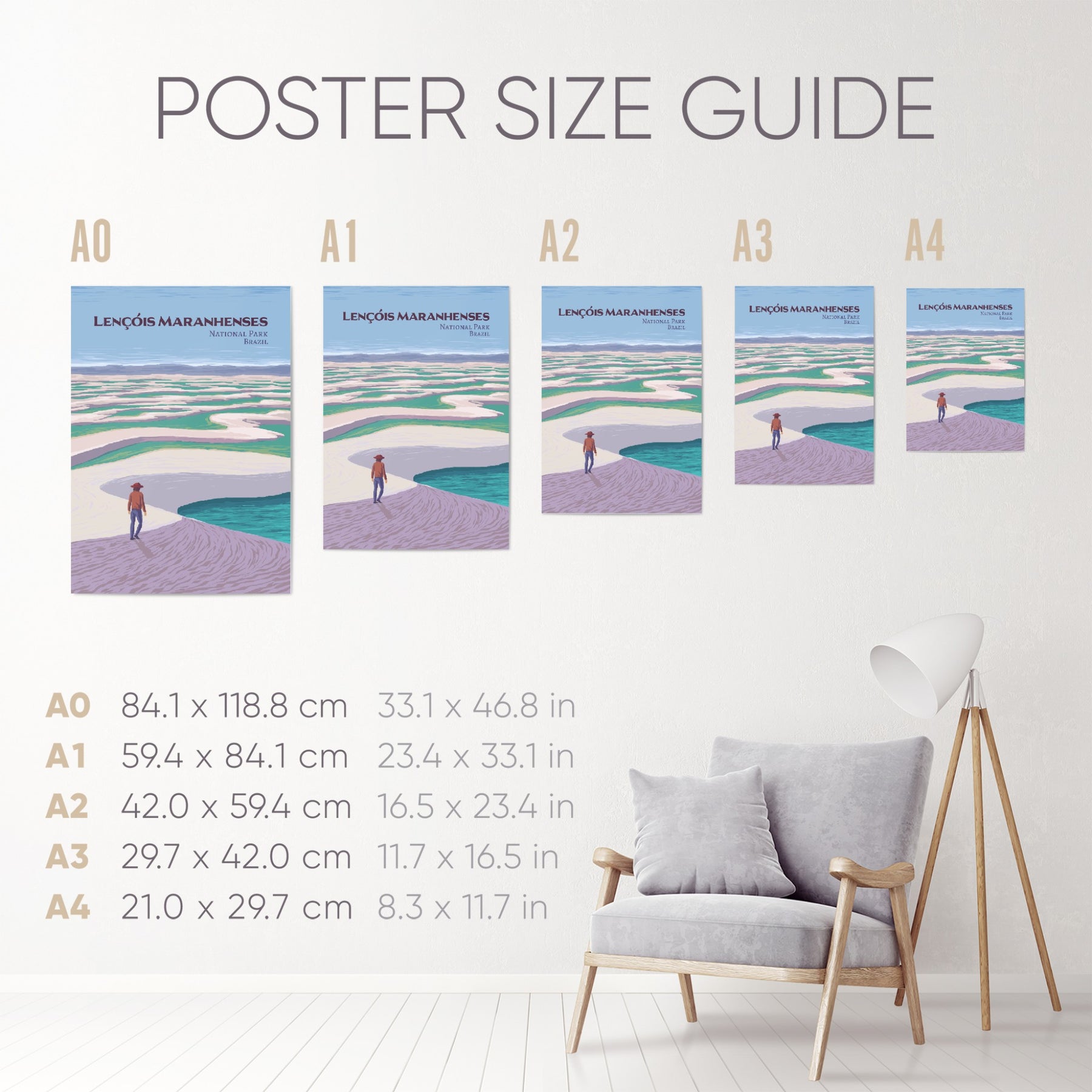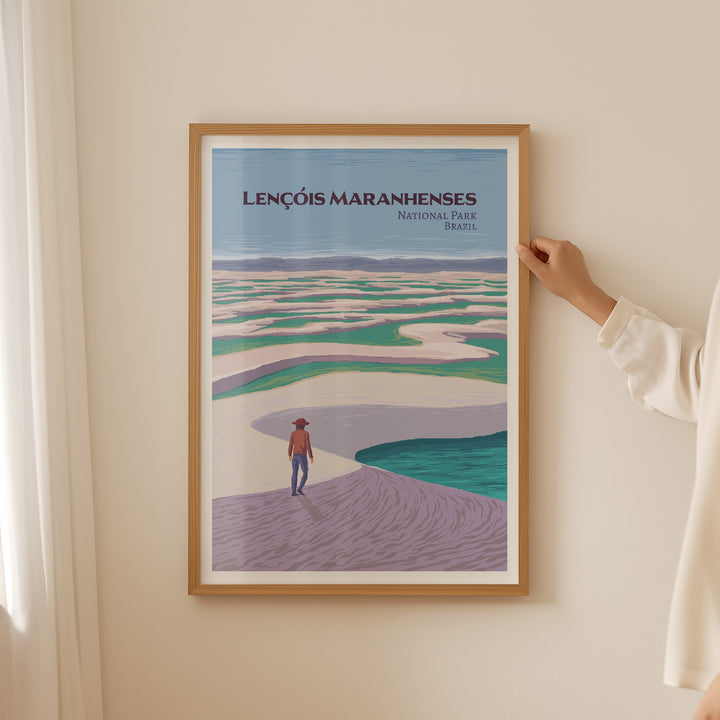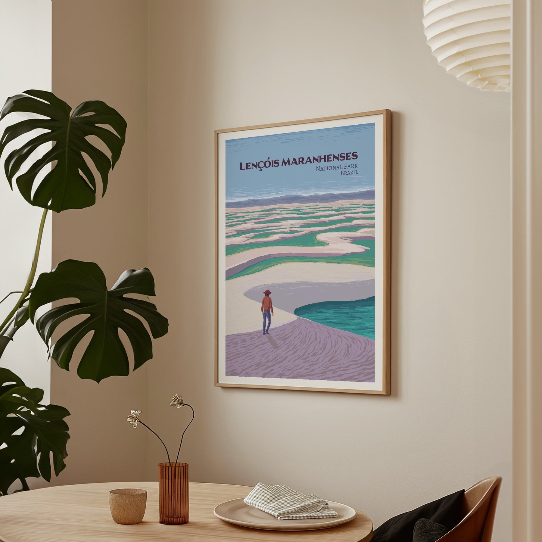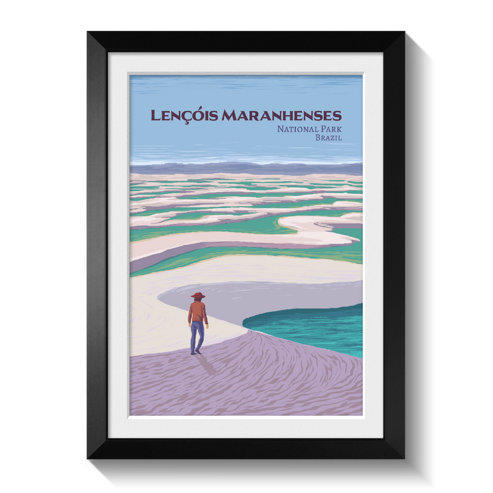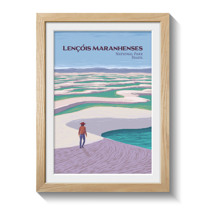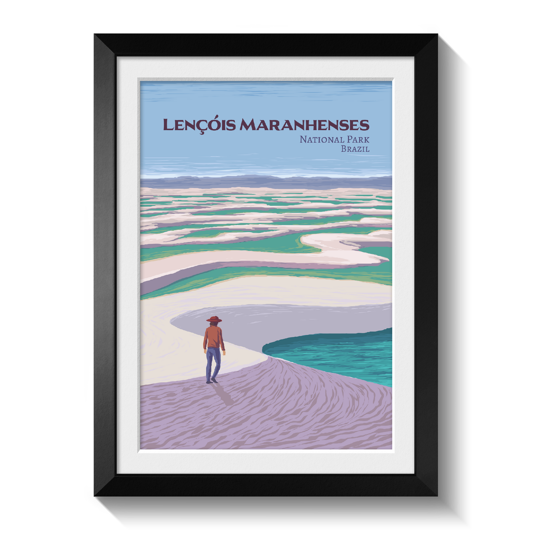 An original travel print featuring Lençóis Maranhenses National Park, Brazil.