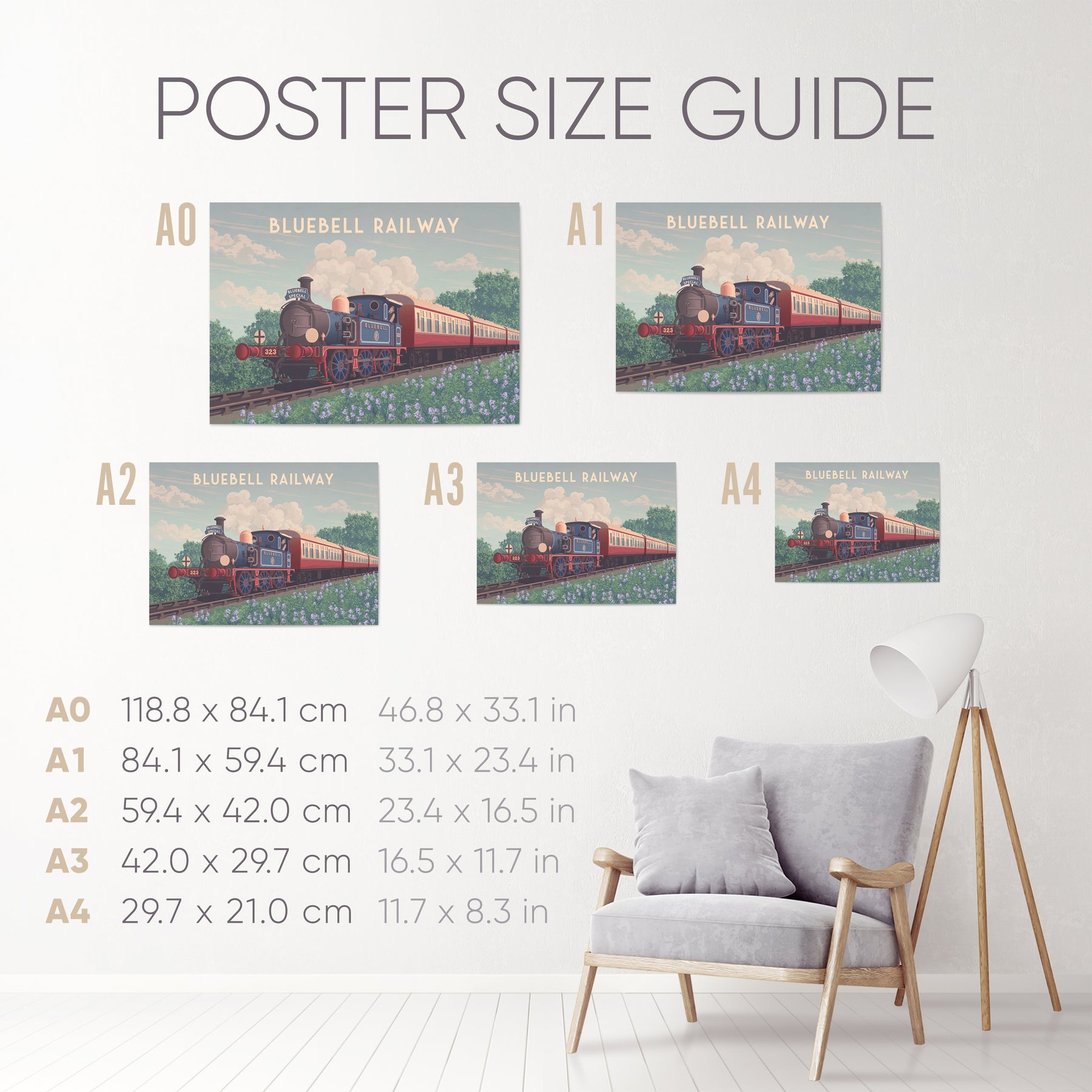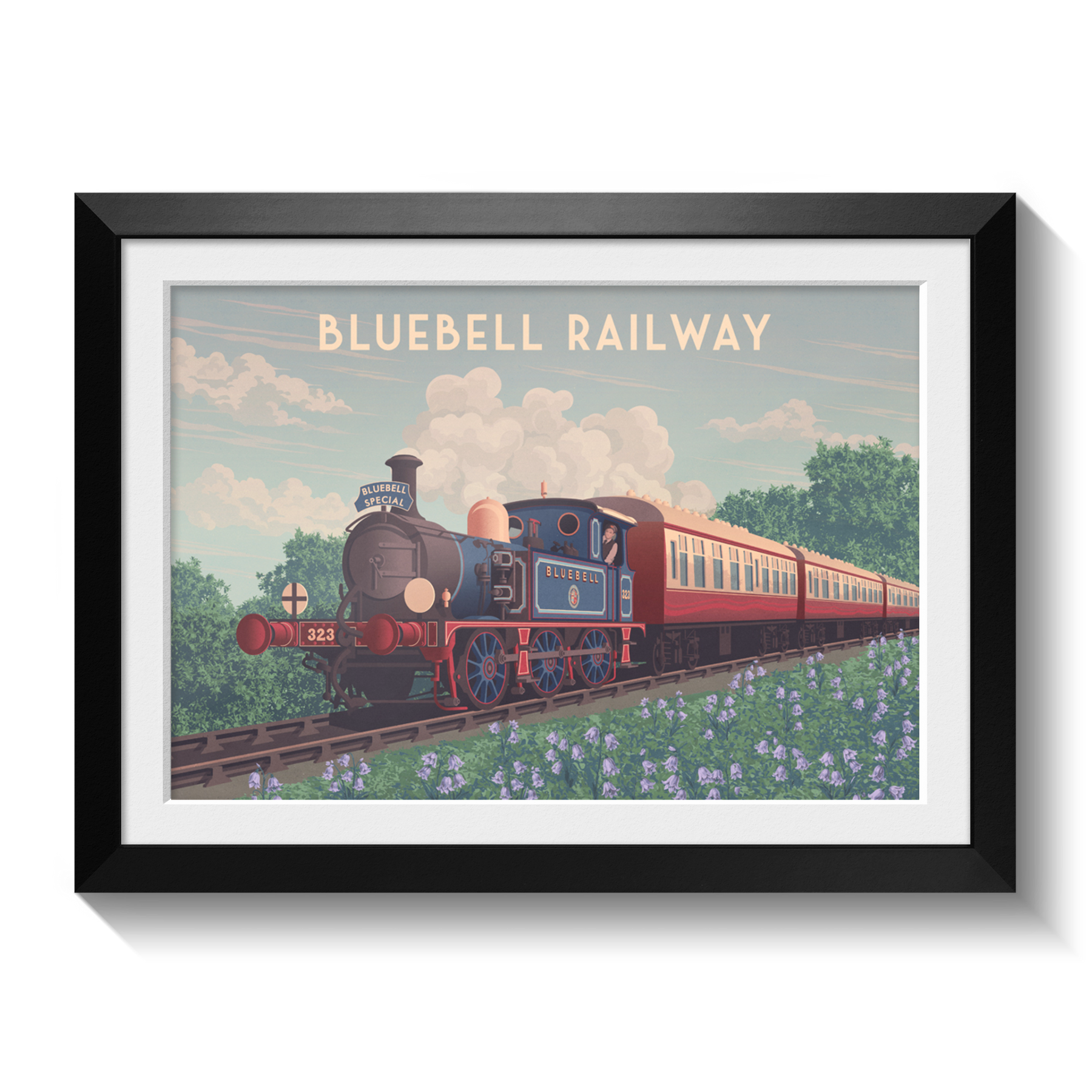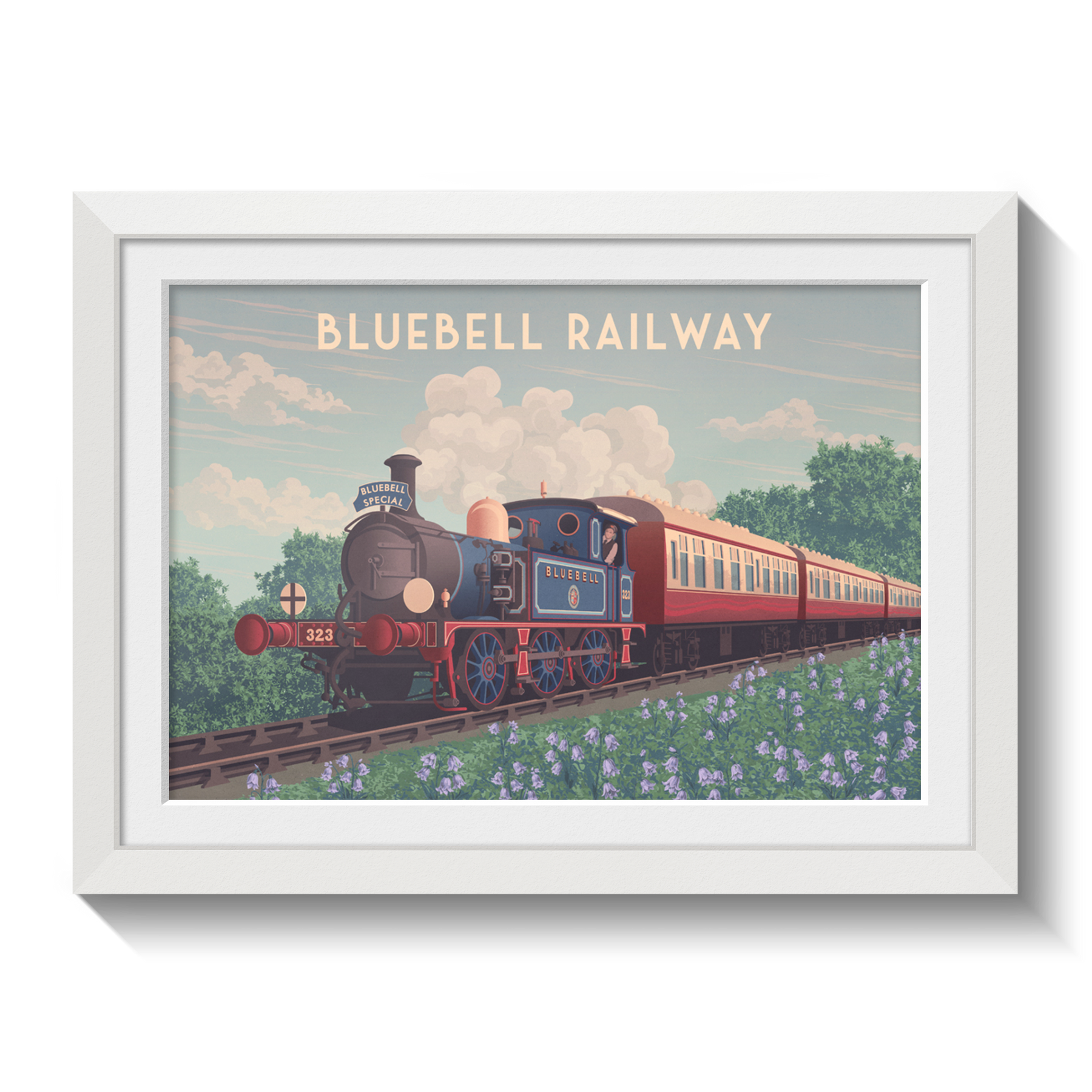 This Bluebell Railway travel poster captures the nostalgic charm of one of England’s first preserved heritage railways in West Sussex. Featuring classic steam locomotives and scenic countryside, it’s perfect for train enthusiasts and history lovers. A stylish decor piece celebrating the timeless appeal and beauty of the Bluebell Railway.