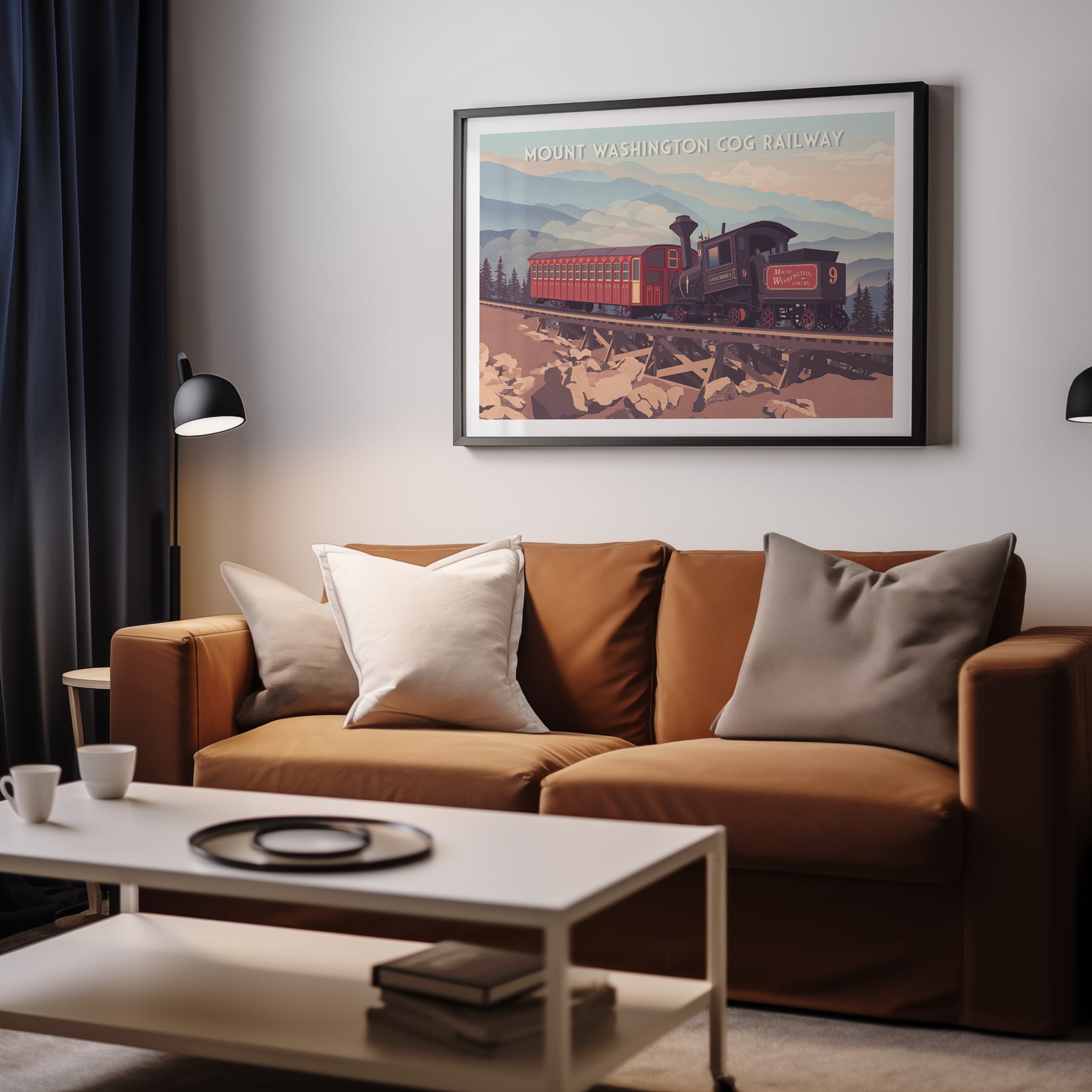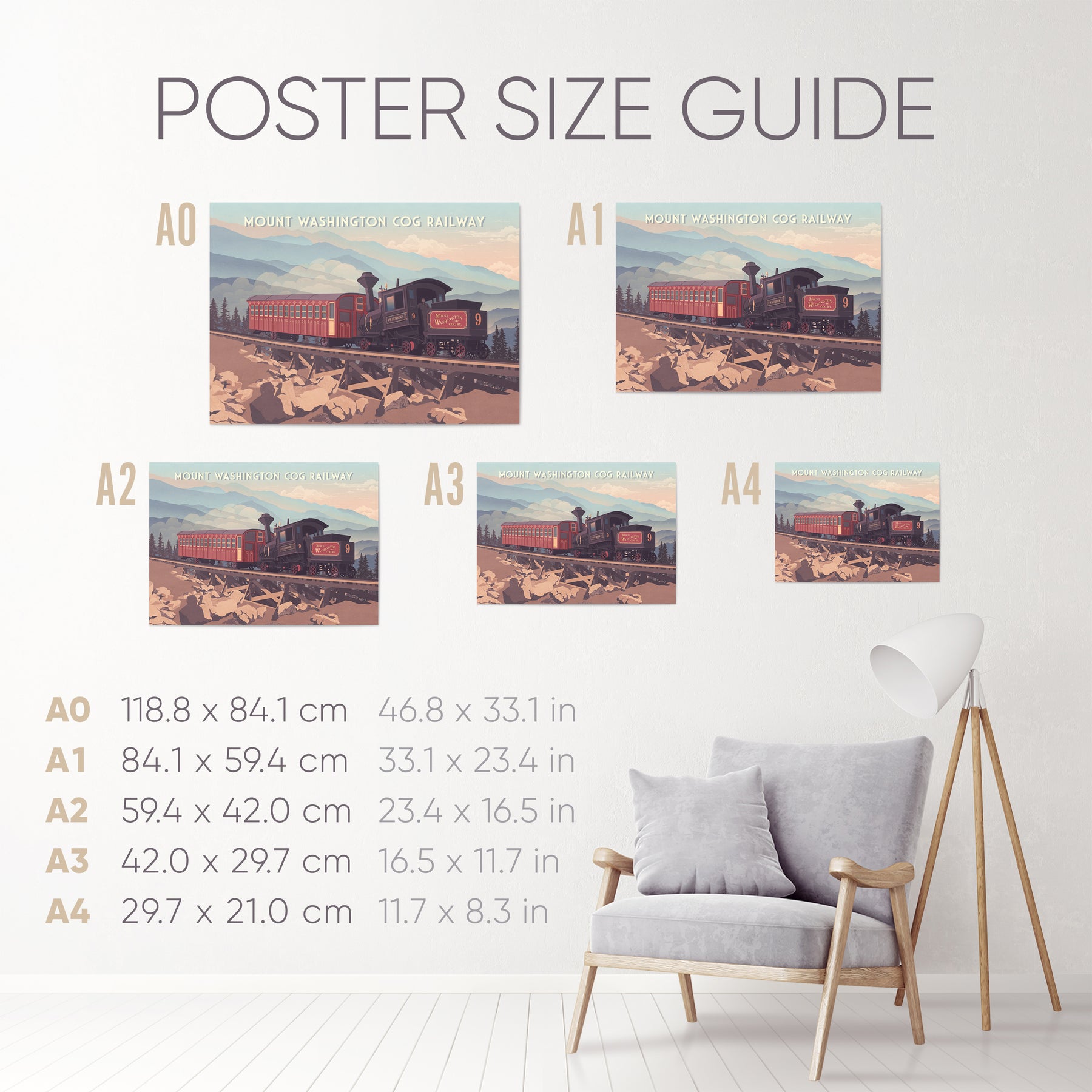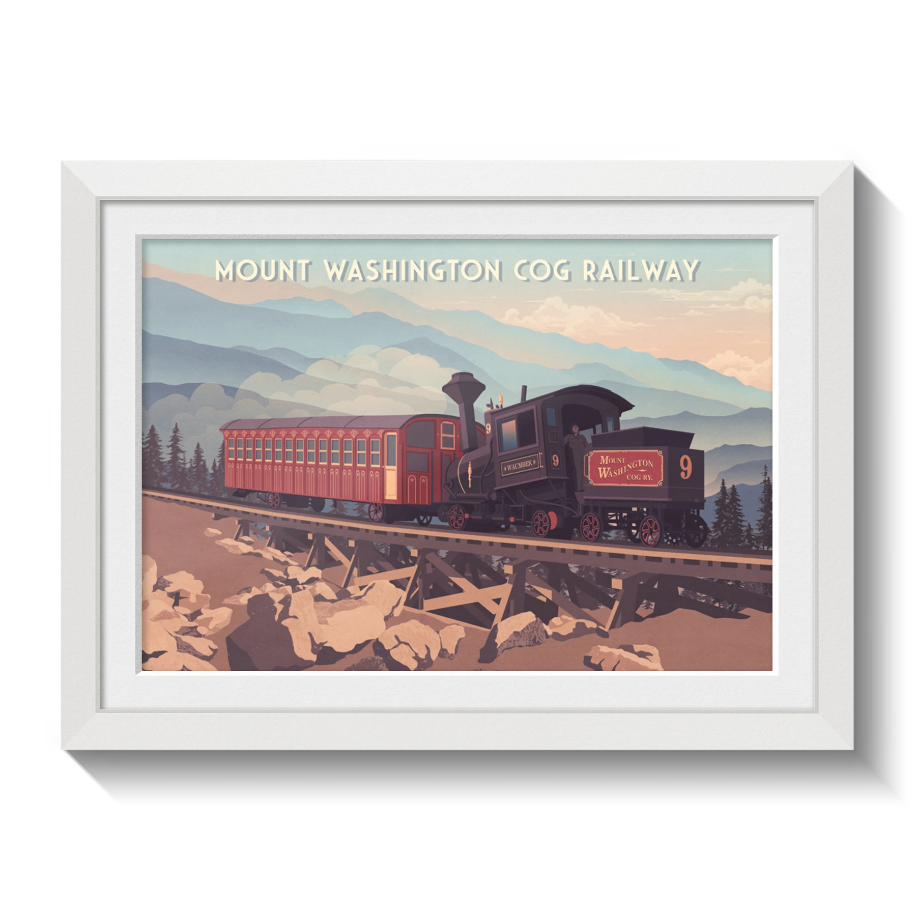 This Mount Washington Cog Railway travel poster captures the charm of the historic railway climbing New Hampshire’s highest peak. Perfect for train enthusiasts and mountain lovers, it showcases scenic views and classic engineering. A stylish decor piece celebrating the adventure, history, and beauty of the Mount Washington Cog Railway experience.