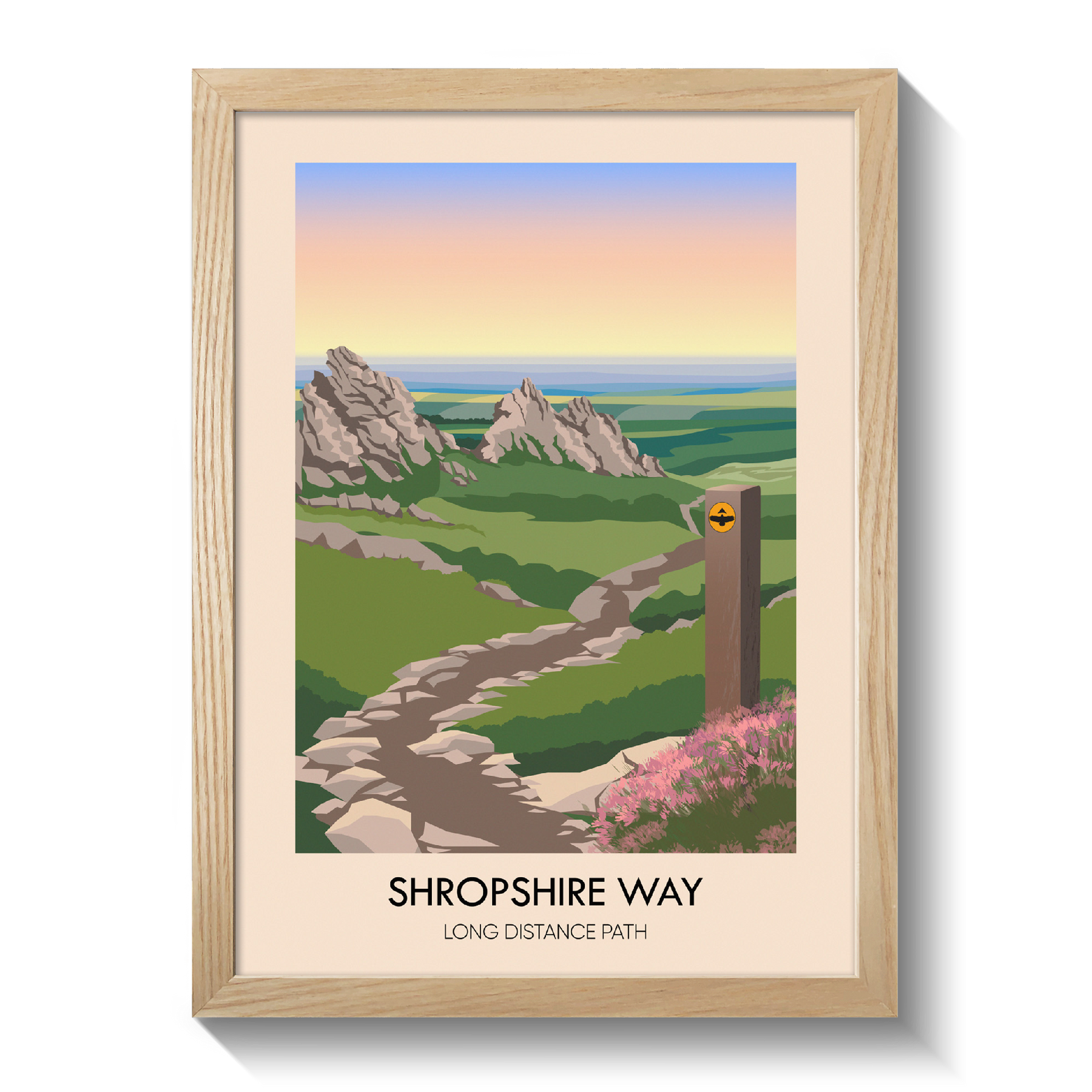 This original print features the Shropshire Way, a Long distance hiking trail in England. The Shropshire Way main route is around 200 miles long and links Shrewsbury with the historic towns and villages of Bishop's Castle, Clun, Ludlow, Much Wenlock, Ironbridge and Wellington.