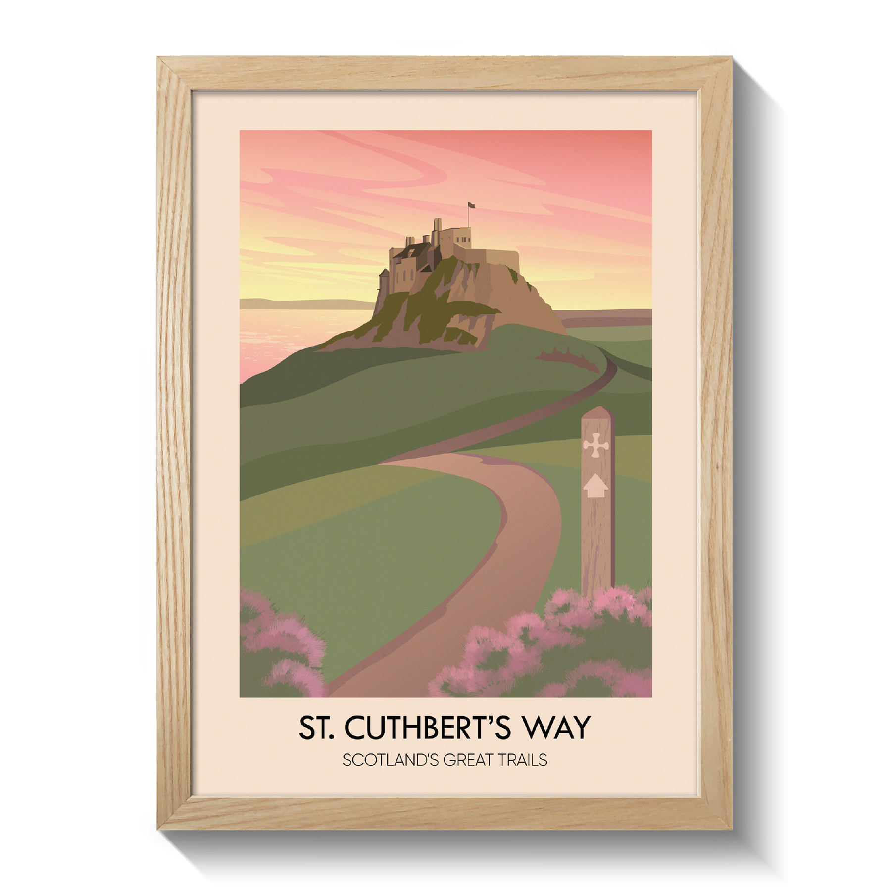 This original travel print features St Cuthbert's Way hiking route. St Cuthbert's Way is a 62.5 mile trail and goes from Melrose Abbey in the Scottish Borders to Holy Island in Northumberland. In the poster you can see Lindisfarne Castle on Holy Island.