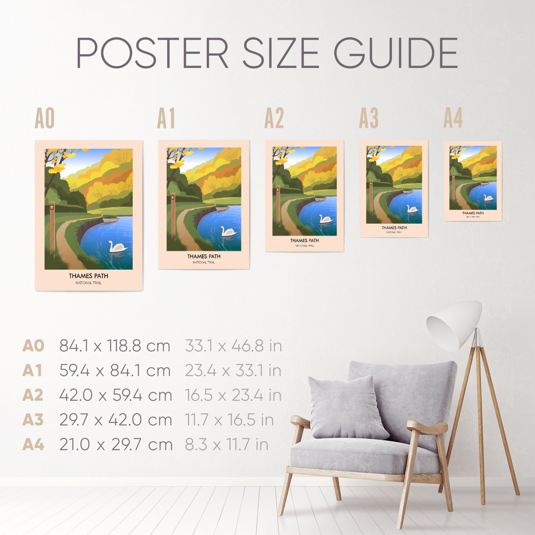 An original print featuring the Thames Path National Trail. One of Britain's most popular hiking trails, the Thames Path follows the UK's most famous river from its source in Gloucestershire to the Thames Barrier in Charlton.