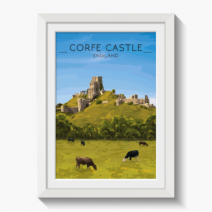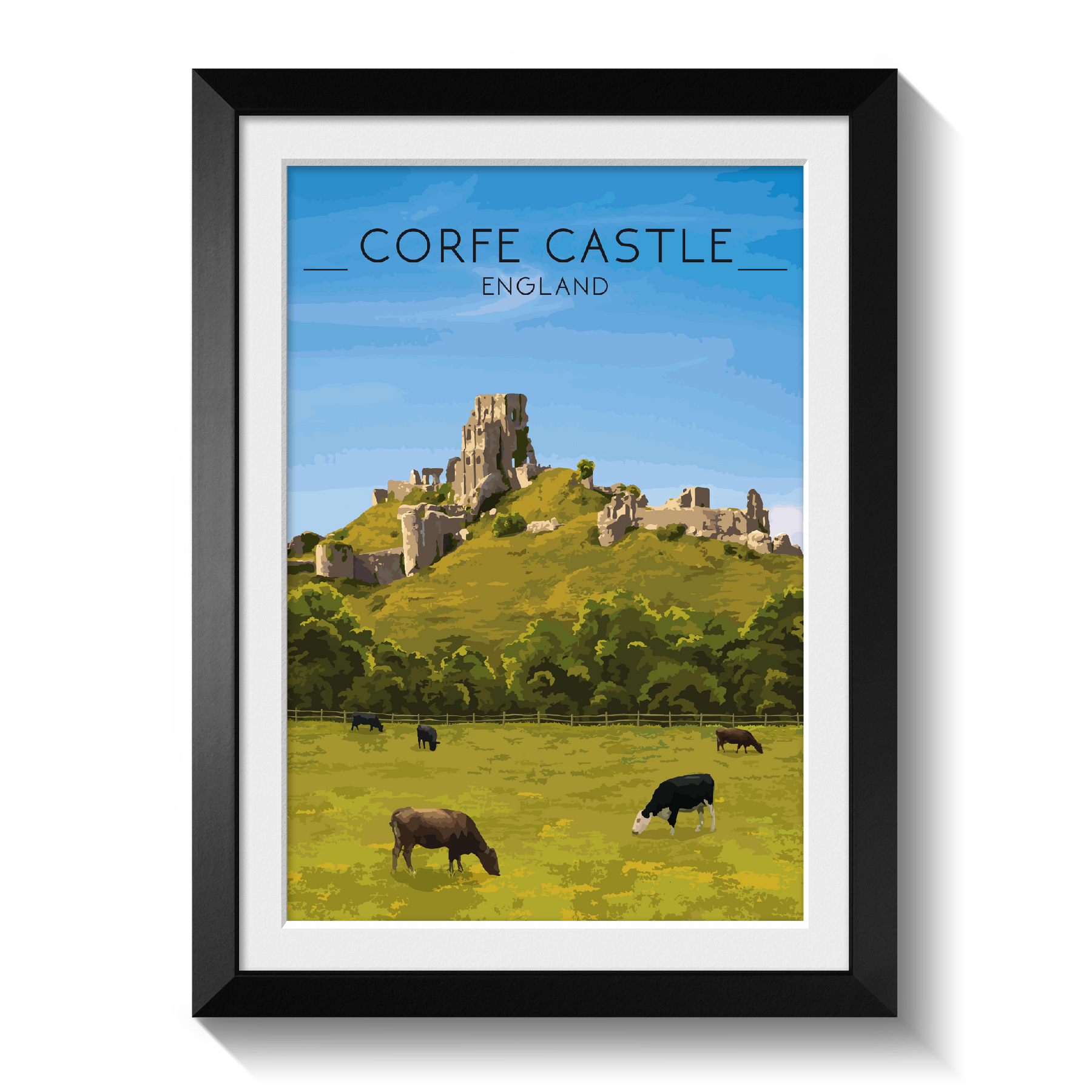 Original print featuring the famous hilltop ruin, Corfe Castle, just outside of Swanage in Dorset.