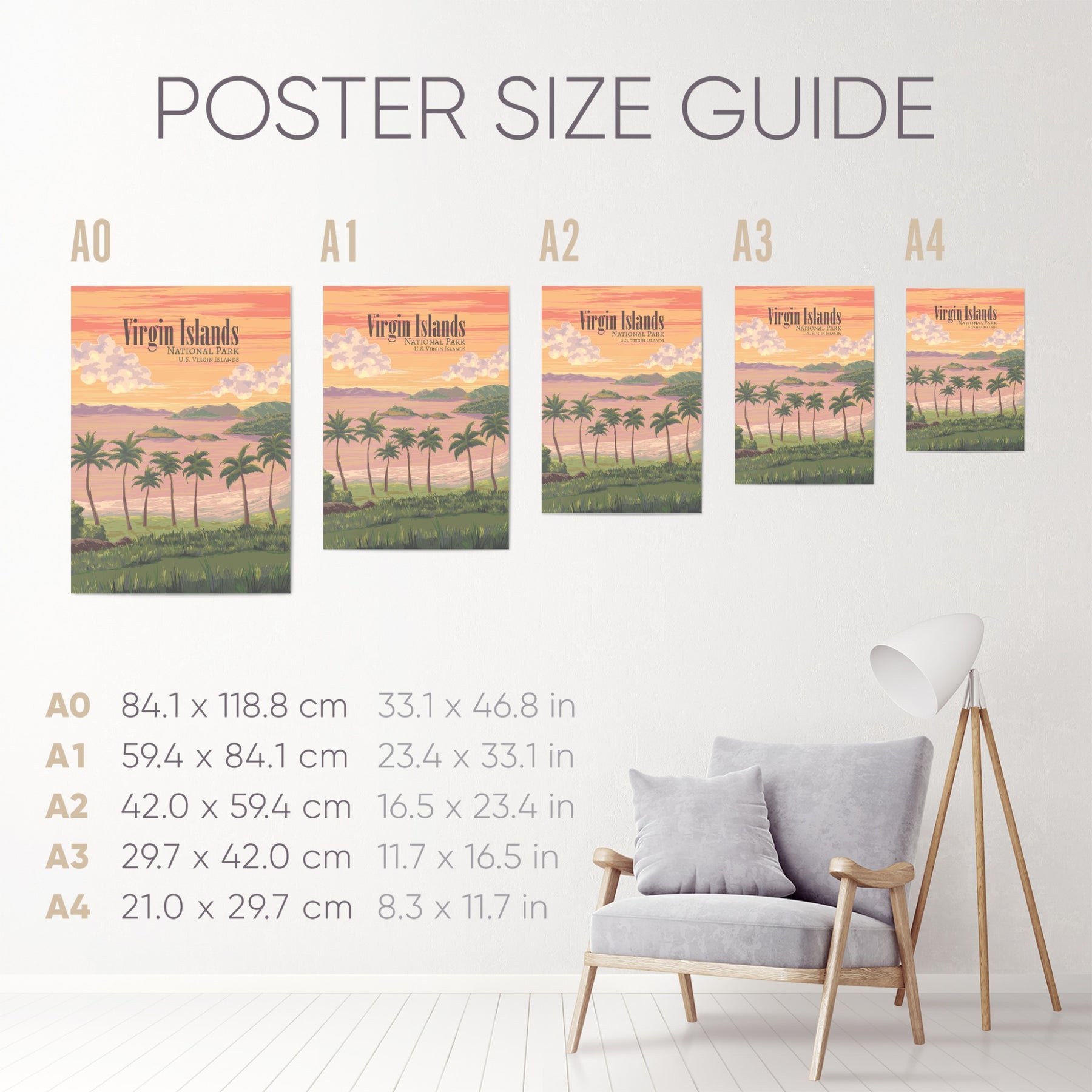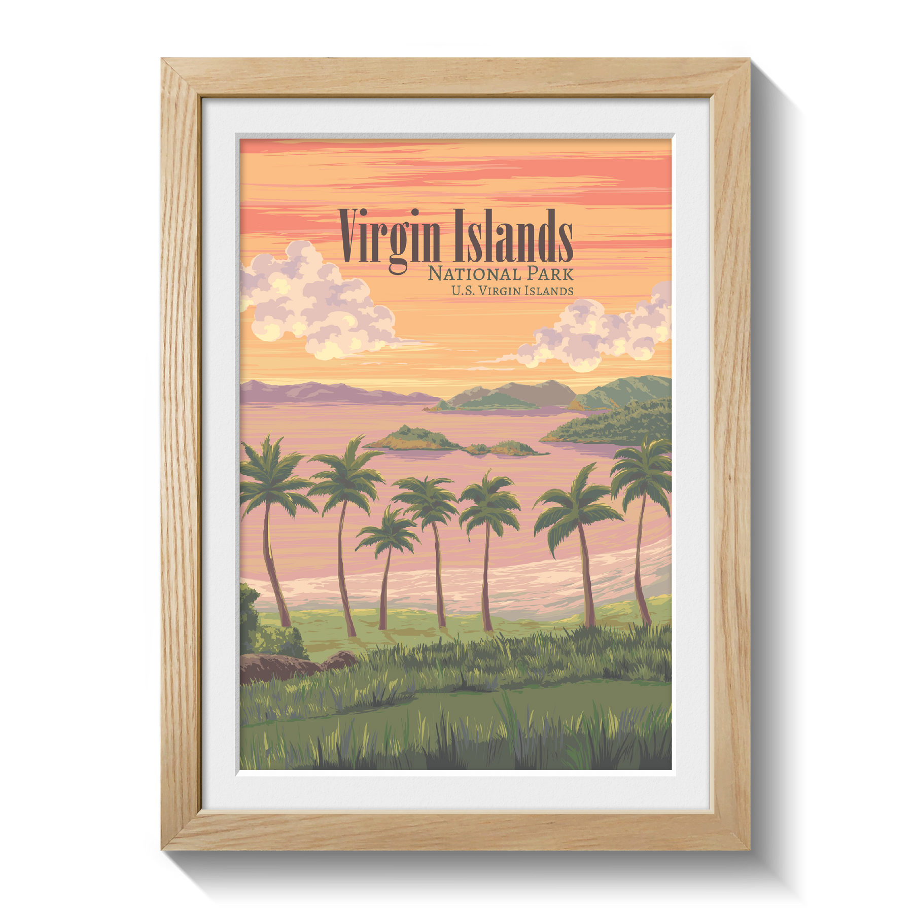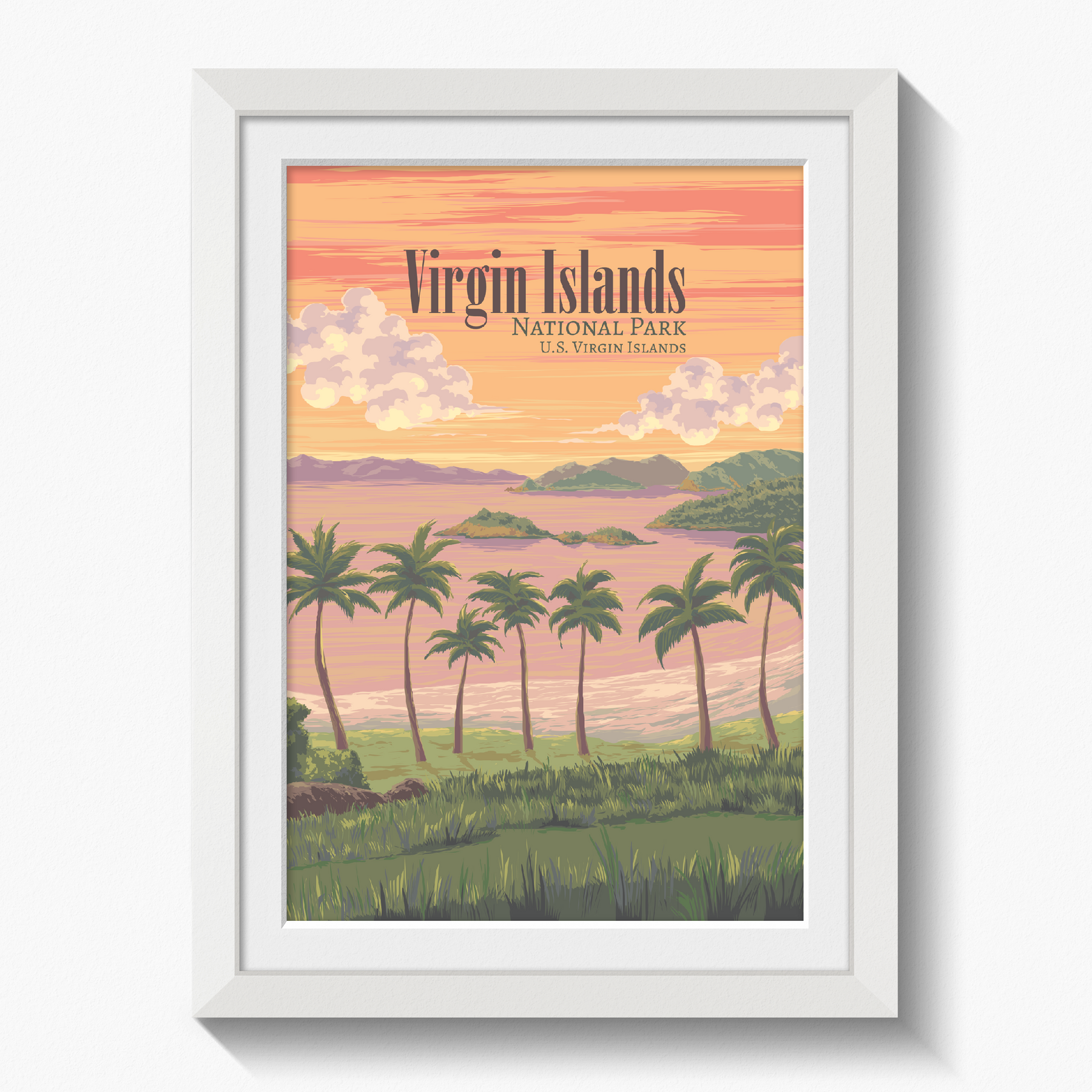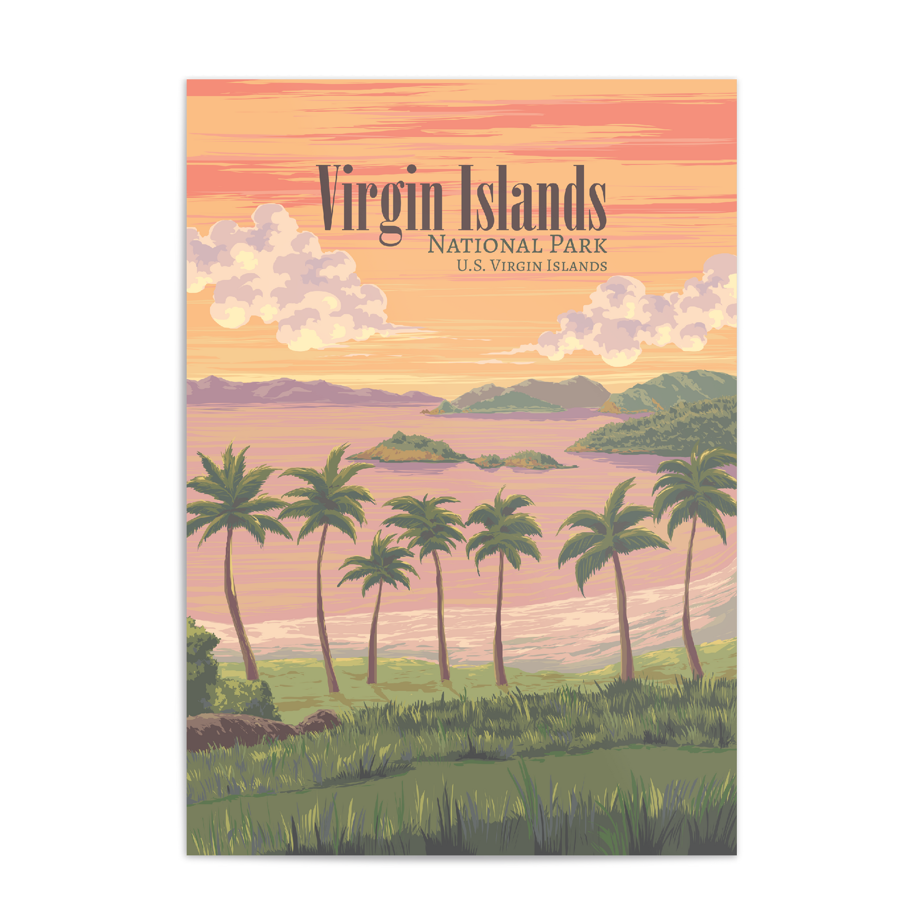An original travel poster featuring Virgin Islands National Park in the U.S. Virgin Islands. The National Park occupies most of the island of St John and is surrounded by coral reefs.