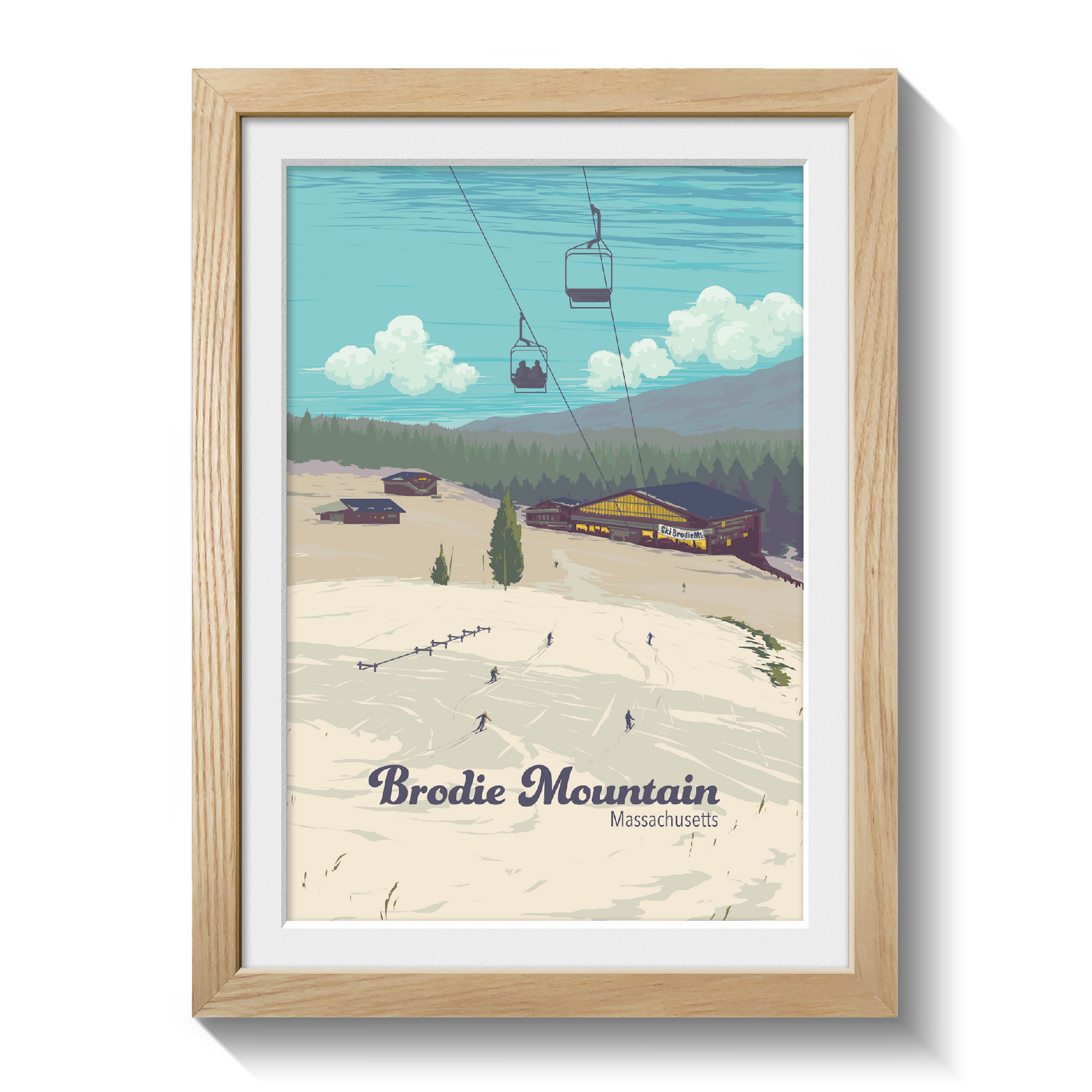 This is an original travel poster featuring Brodie Mountain, Massachusetts. Known for its stunning slopes and breathtaking views, Brodie Mountain offers excellent skiing experiences. Perfect for winter sports enthusiasts and families, this destination promises thrilling adventures in a picturesque New England setting.
