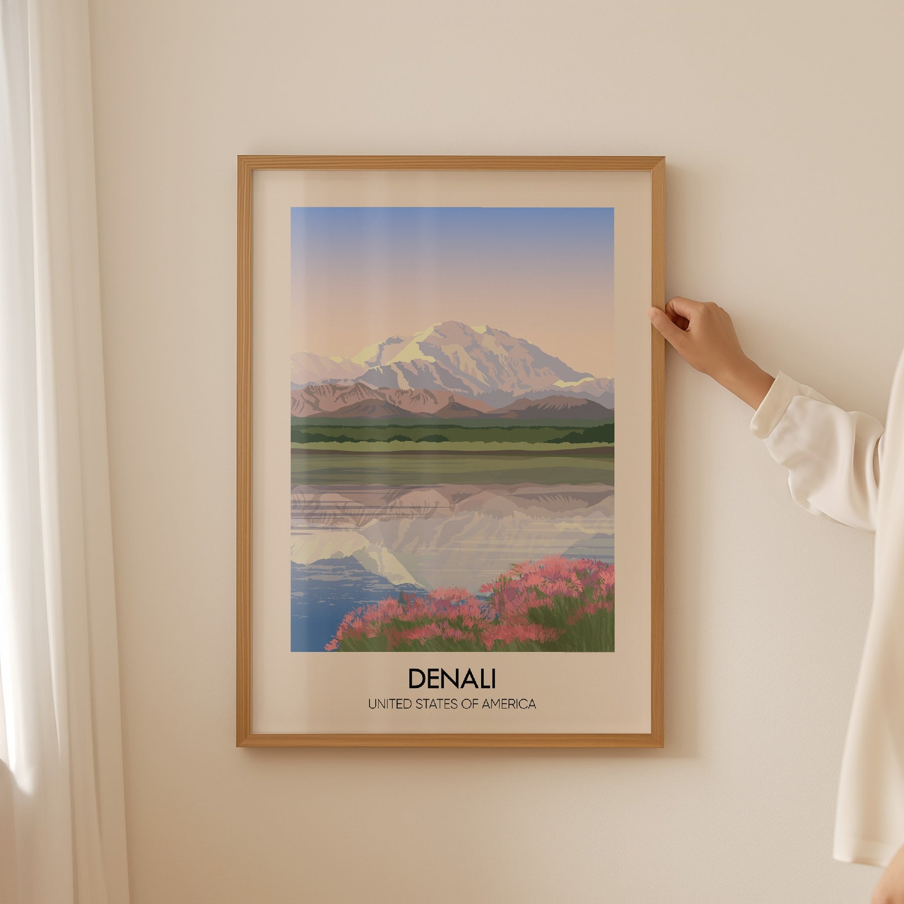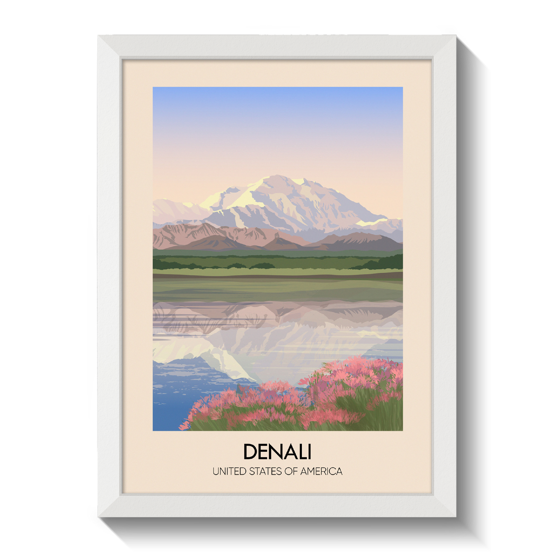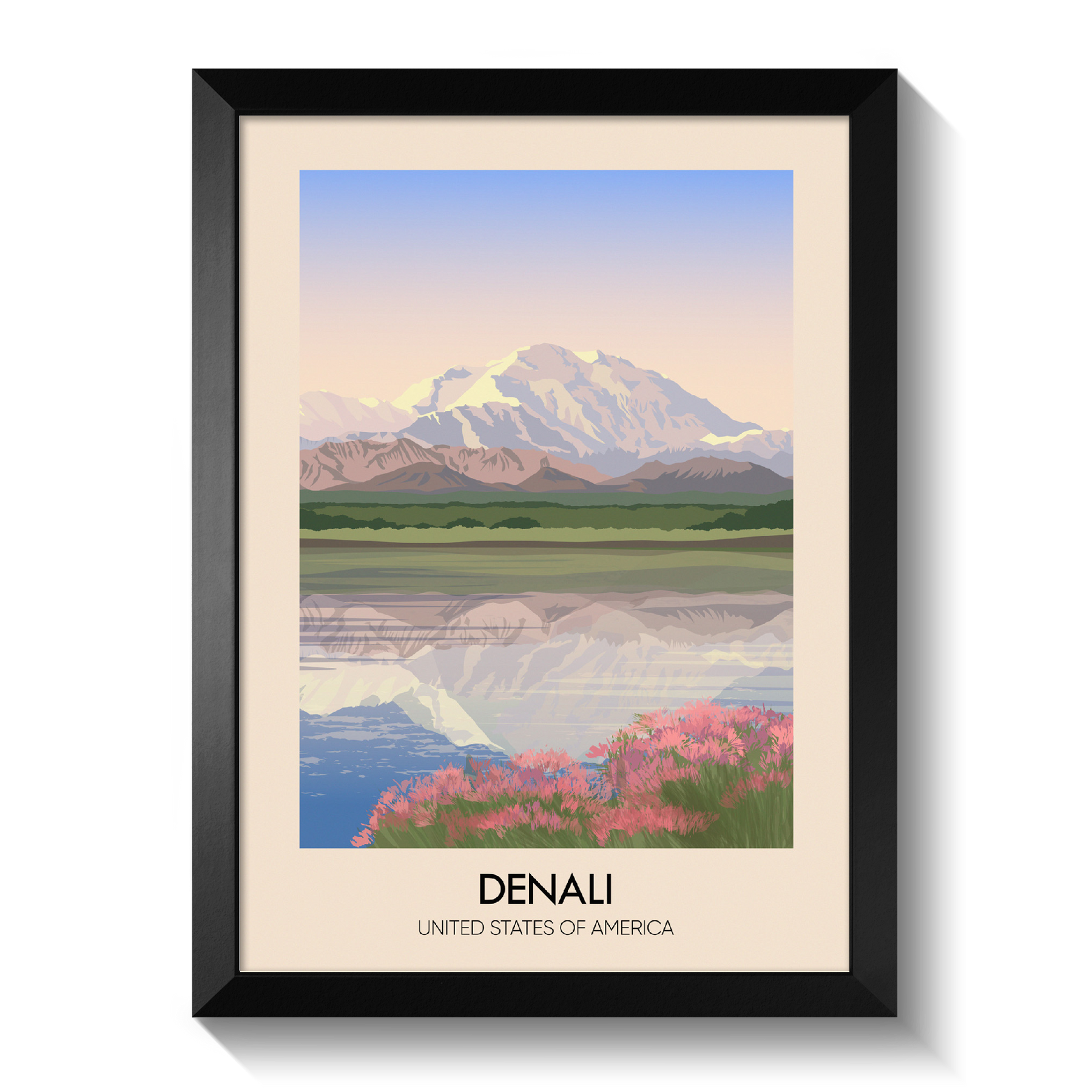 Original artwork featuring the USA's highest mountain, the magnificent Denali located in Alaska. Also known as Mount McKinley, it is the highest mountain in North America. Here, it is pictured from the North with the spectacular Wonder Lake in the foreground.