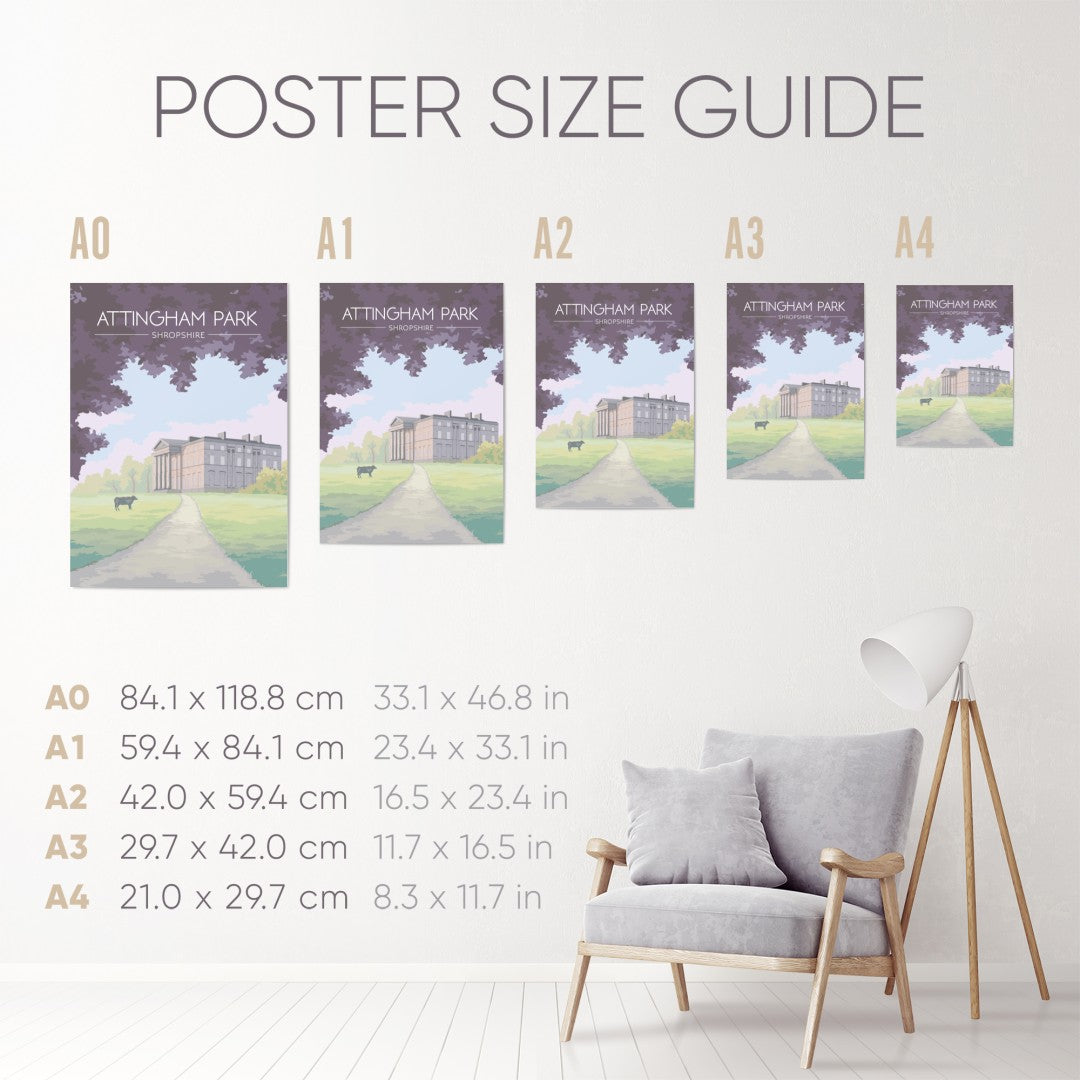 This Attingham Park Shropshire poster showcases the elegance of the historic estate, featuring its grand mansion, landscaped gardens, and roaming deer park. Perfect for heritage lovers and nature enthusiasts, it captures the beauty and tranquillity of this National Trust treasure. A stylish decor piece celebrating the charm of Attingham Park.