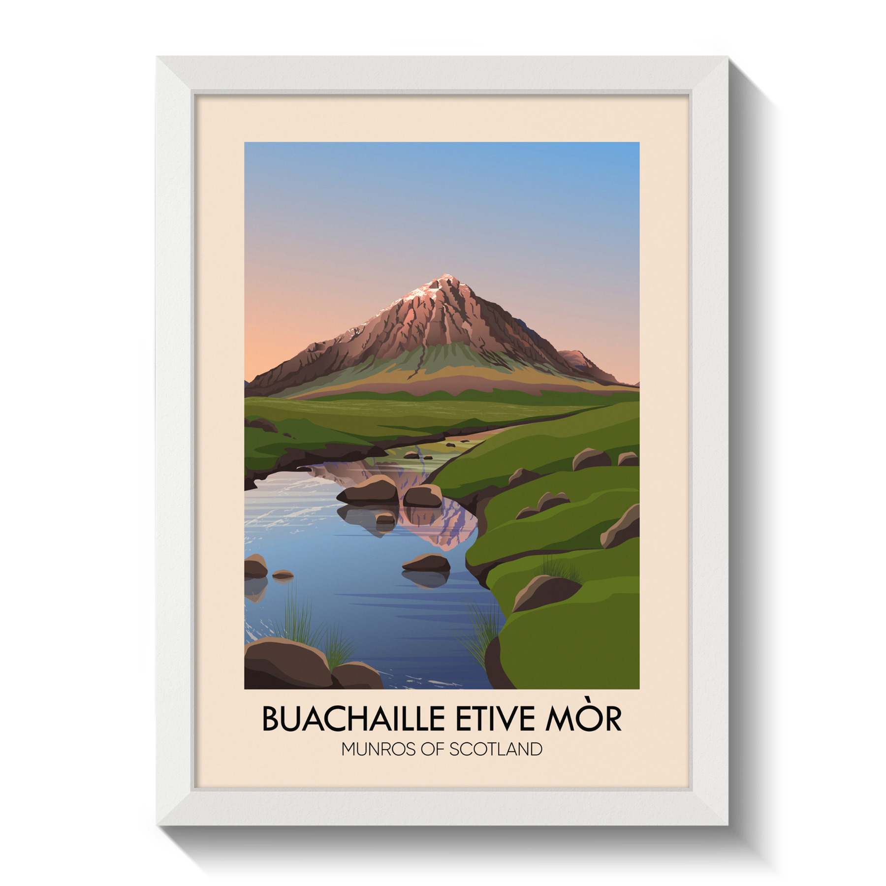 This Buachaille Etive Mòr travel poster captures the dramatic silhouette of one of Scotland’s most iconic Munros, standing proudly at the entrance to Glencoe. Perfect for hikers, climbers, and lovers of Highland scenery. Part of our Munros of Scotland collection, it’s a striking tribute to Scotland’s wild mountain beauty.