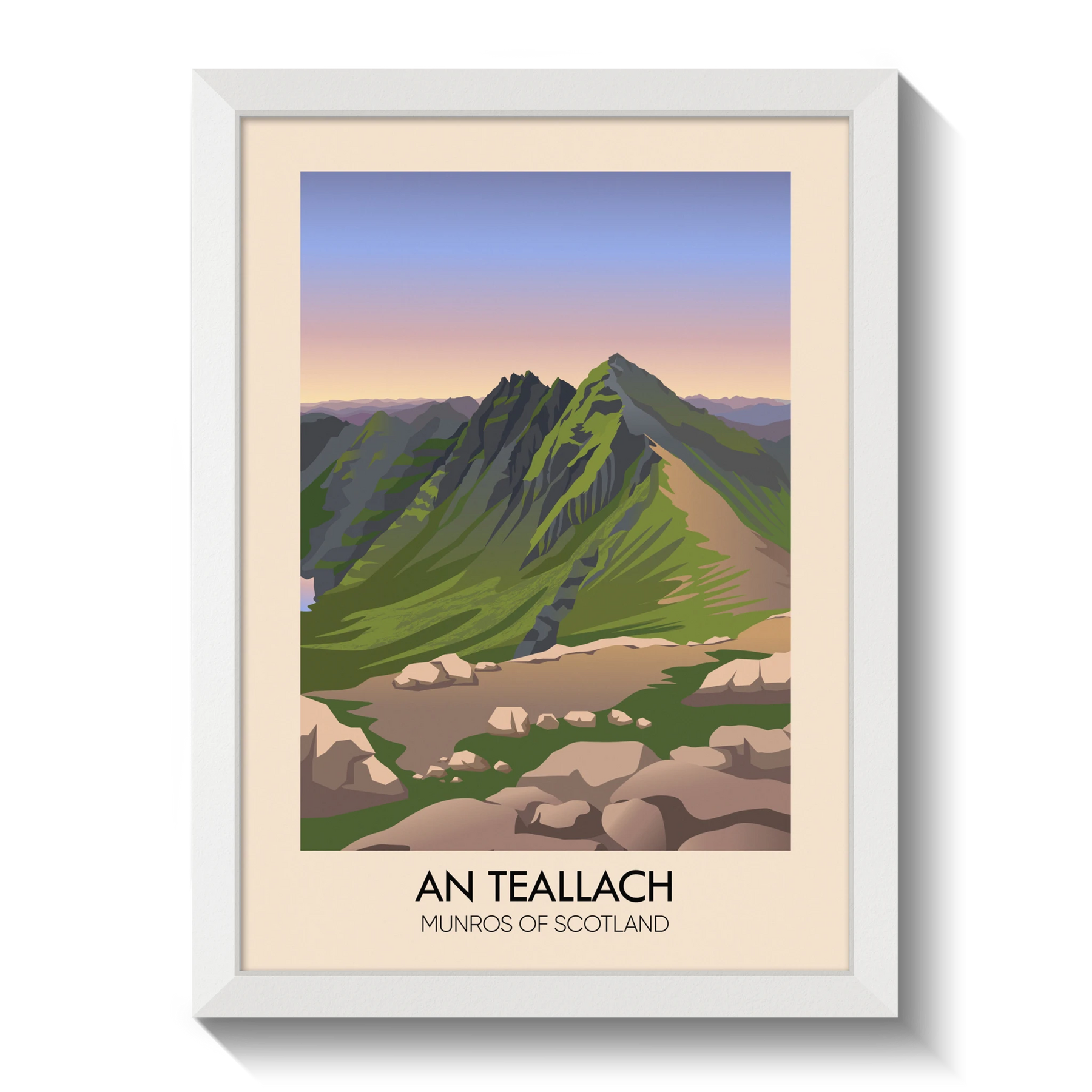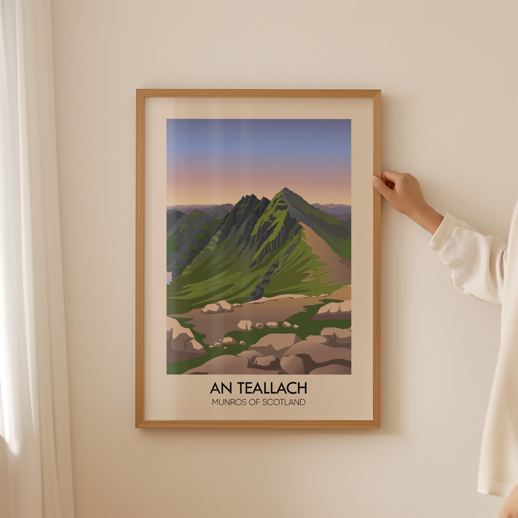 This An Teallach travel poster showcases the dramatic ridges and rugged peaks of one of Scotland’s most iconic Munros. Perfect for experienced hikers and mountain lovers, it captures the wild beauty of the Northwest Highlands. A striking decor piece celebrating the adventure, challenge, and scenery of An Teallach in Scotland.