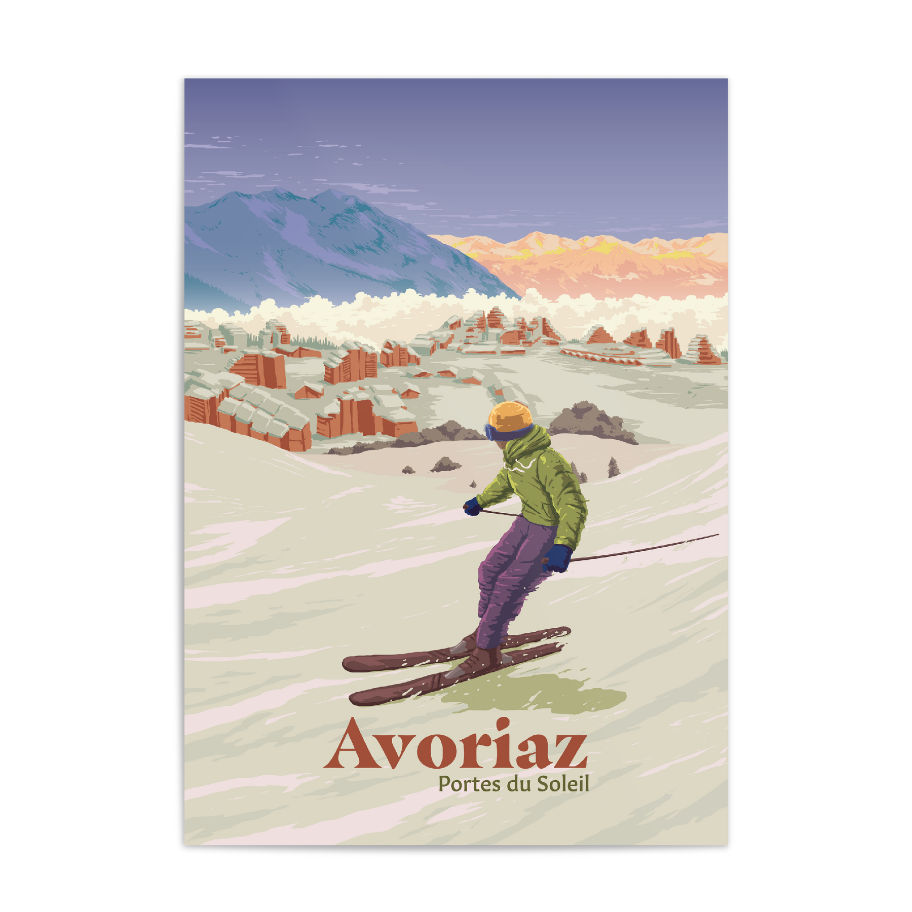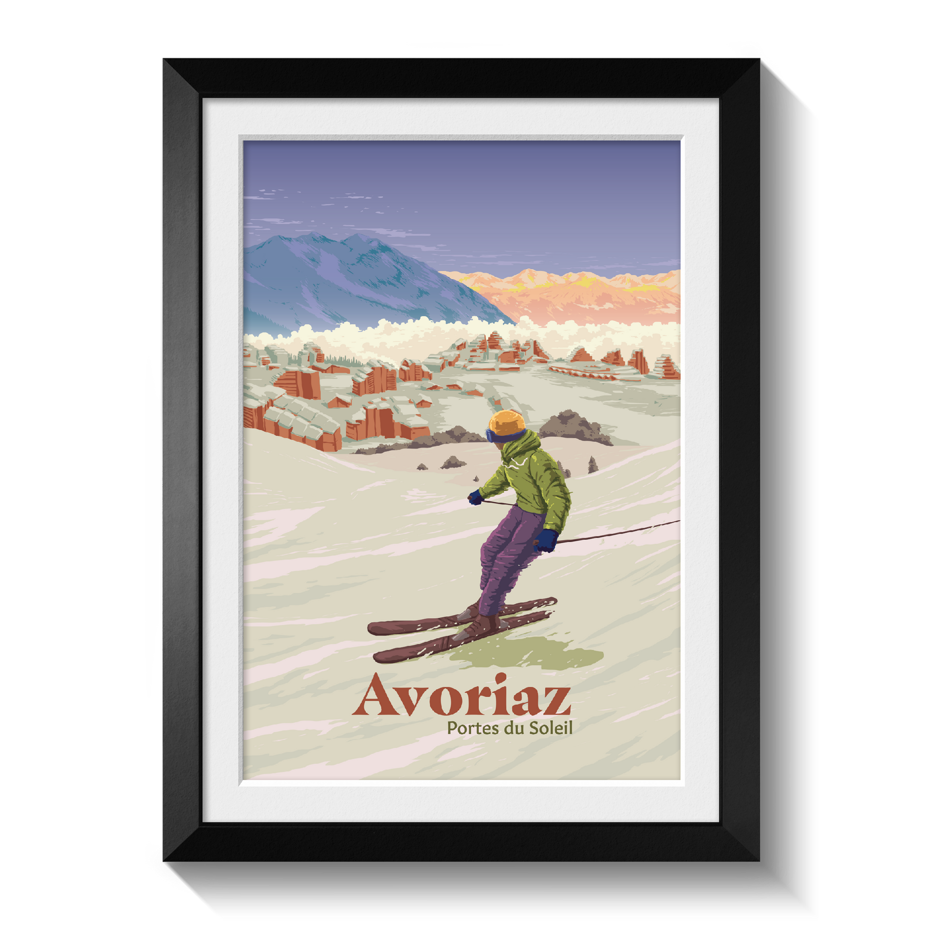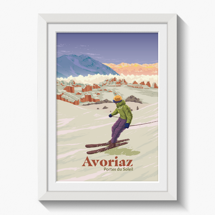 This is an original travel poster featuring the popular French ski resort of Avoriaz in the Portes du Soleil area of the French Alps.