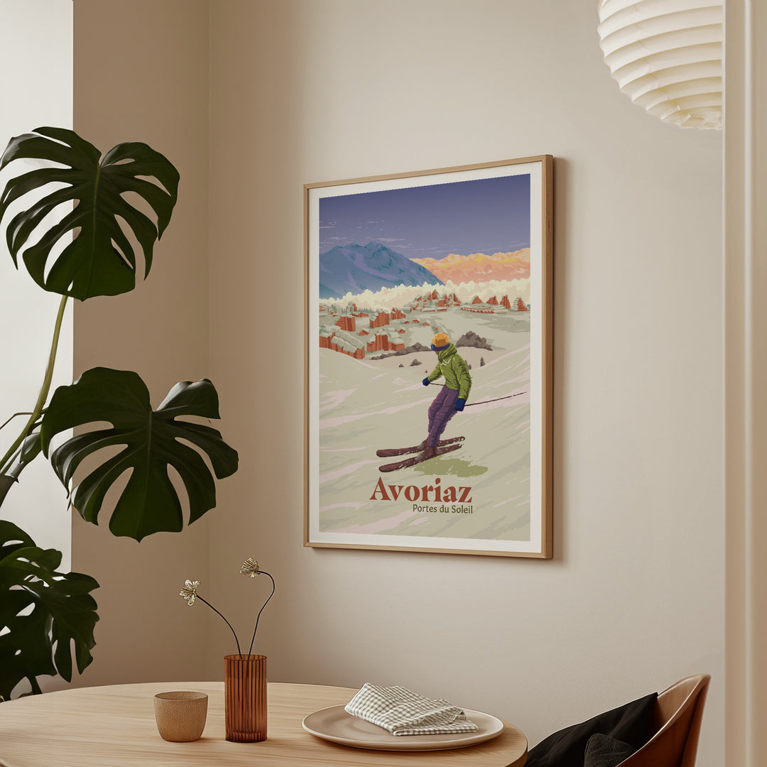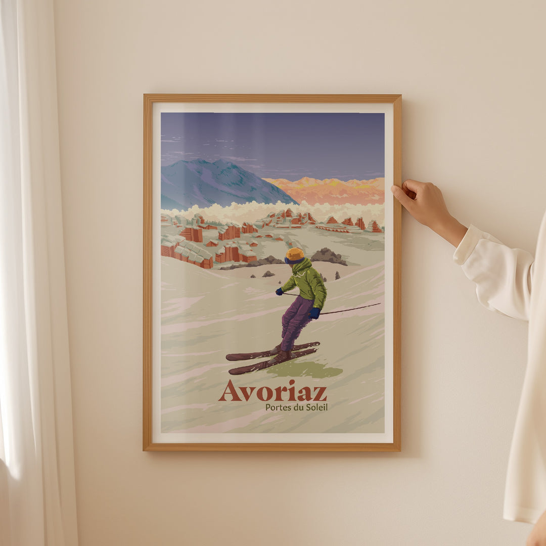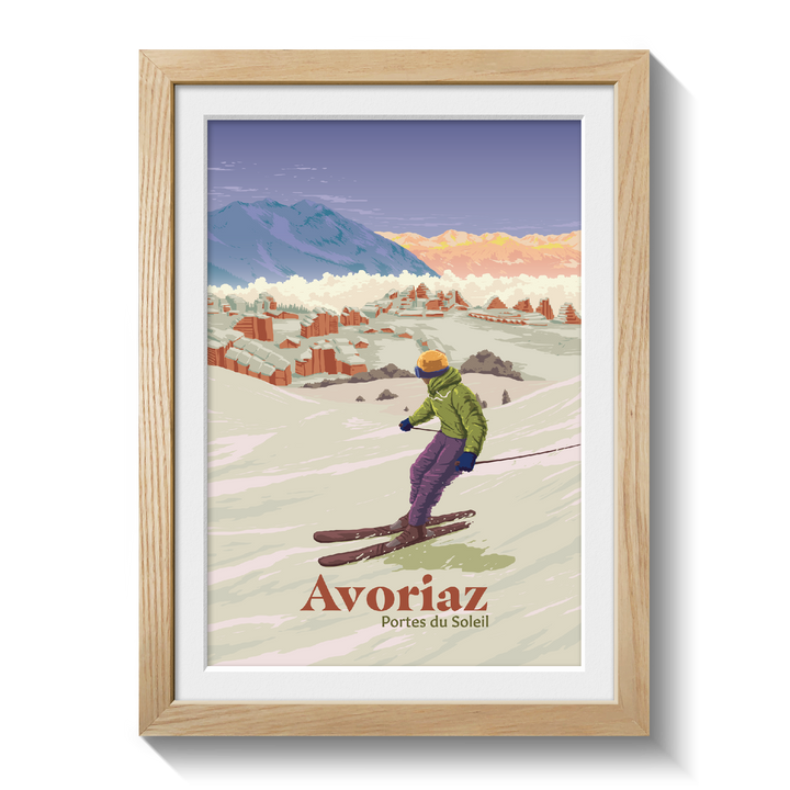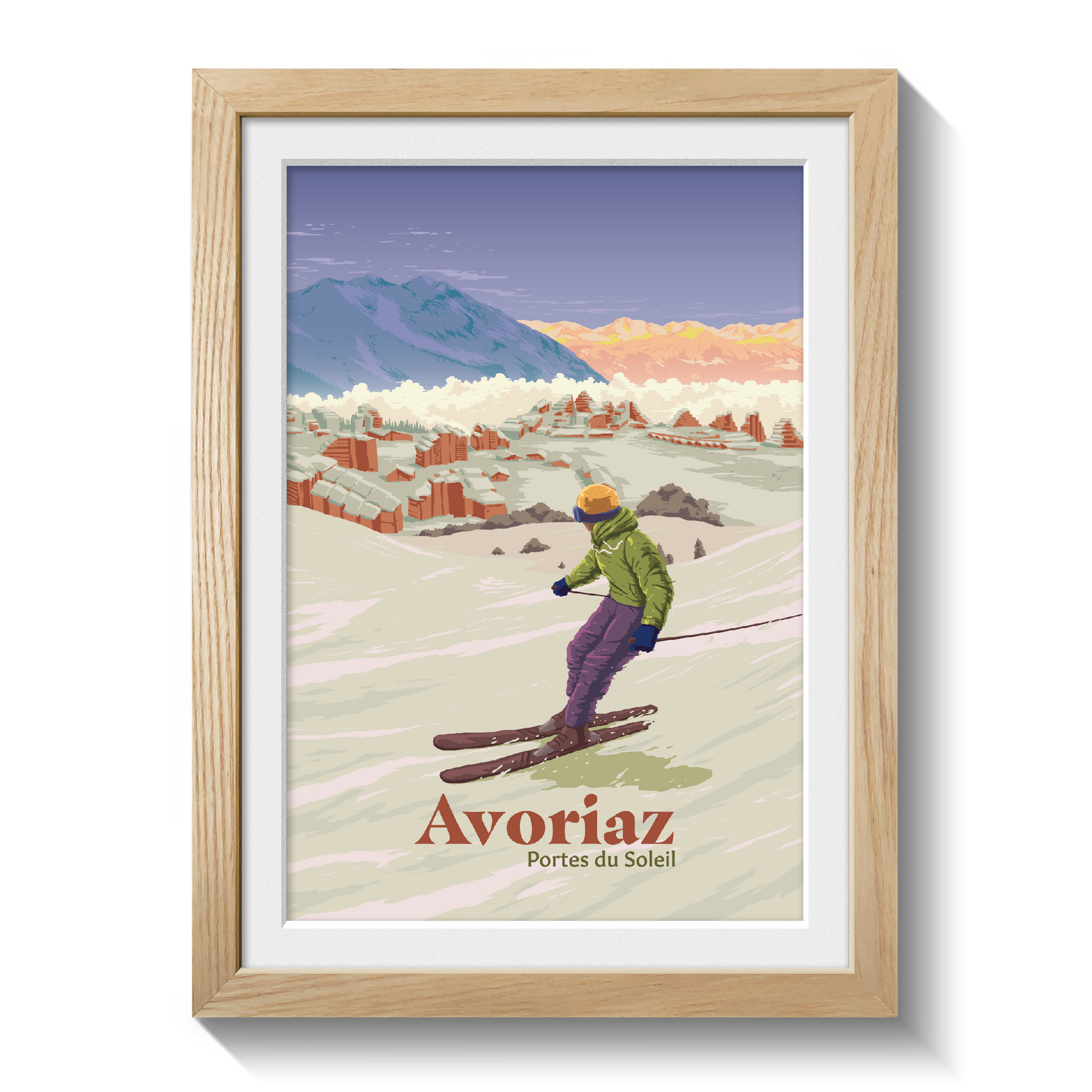 This is an original travel poster featuring the popular French ski resort of Avoriaz in the Portes du Soleil area of the French Alps.