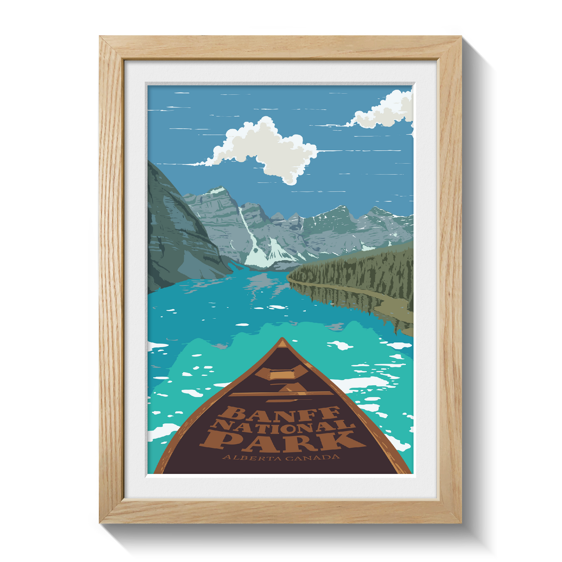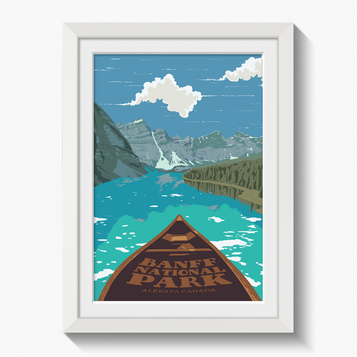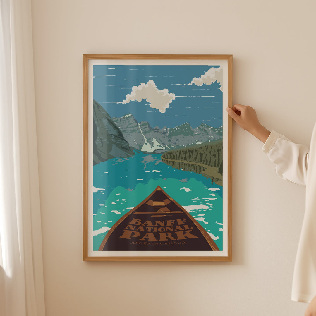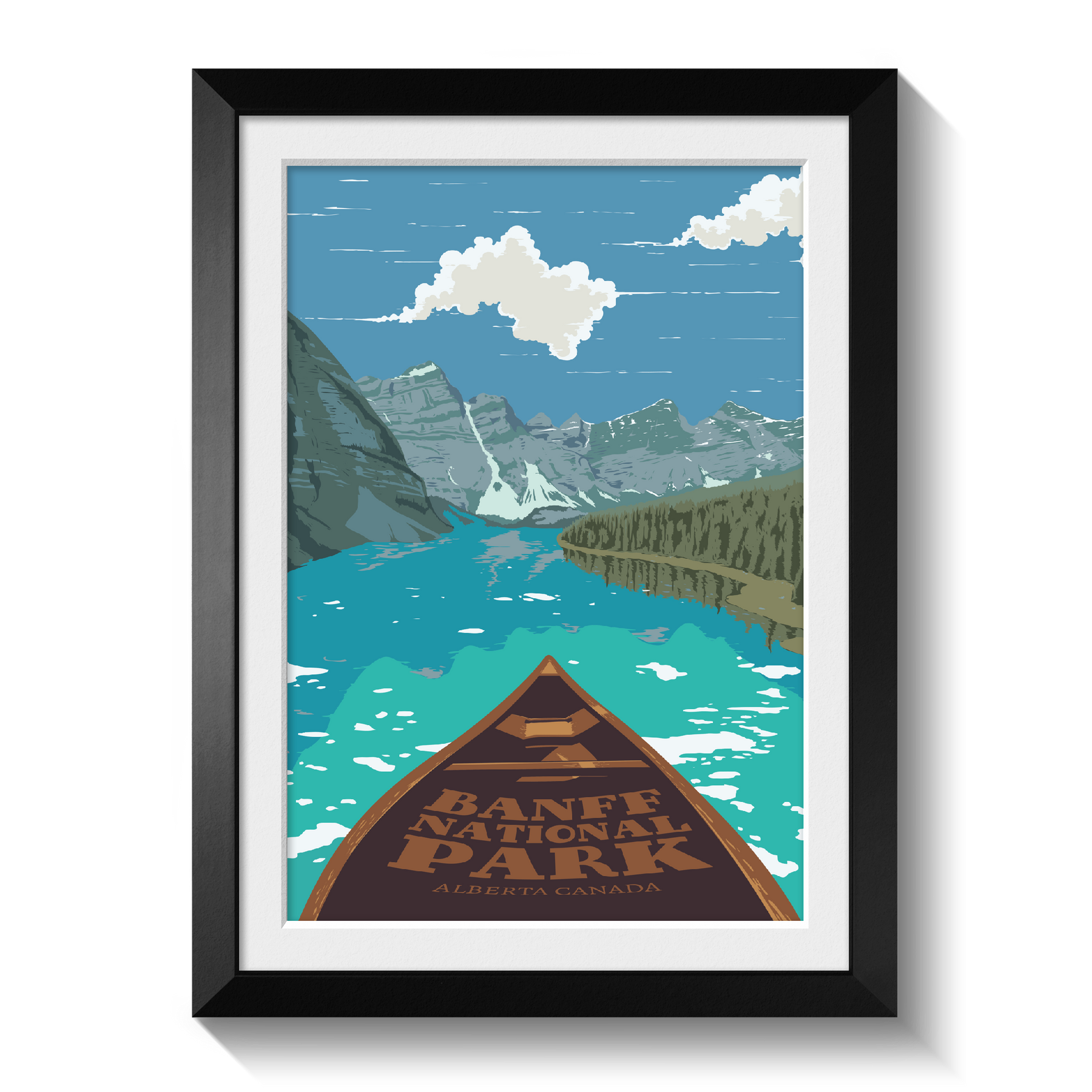 This is an original travel poster of Banff National Park in the heart of the Rocky Mountains, Canada. It features a canoe setting out into the mystical turquoise waters of Moraine Lake with an awesome mountain backdrop.