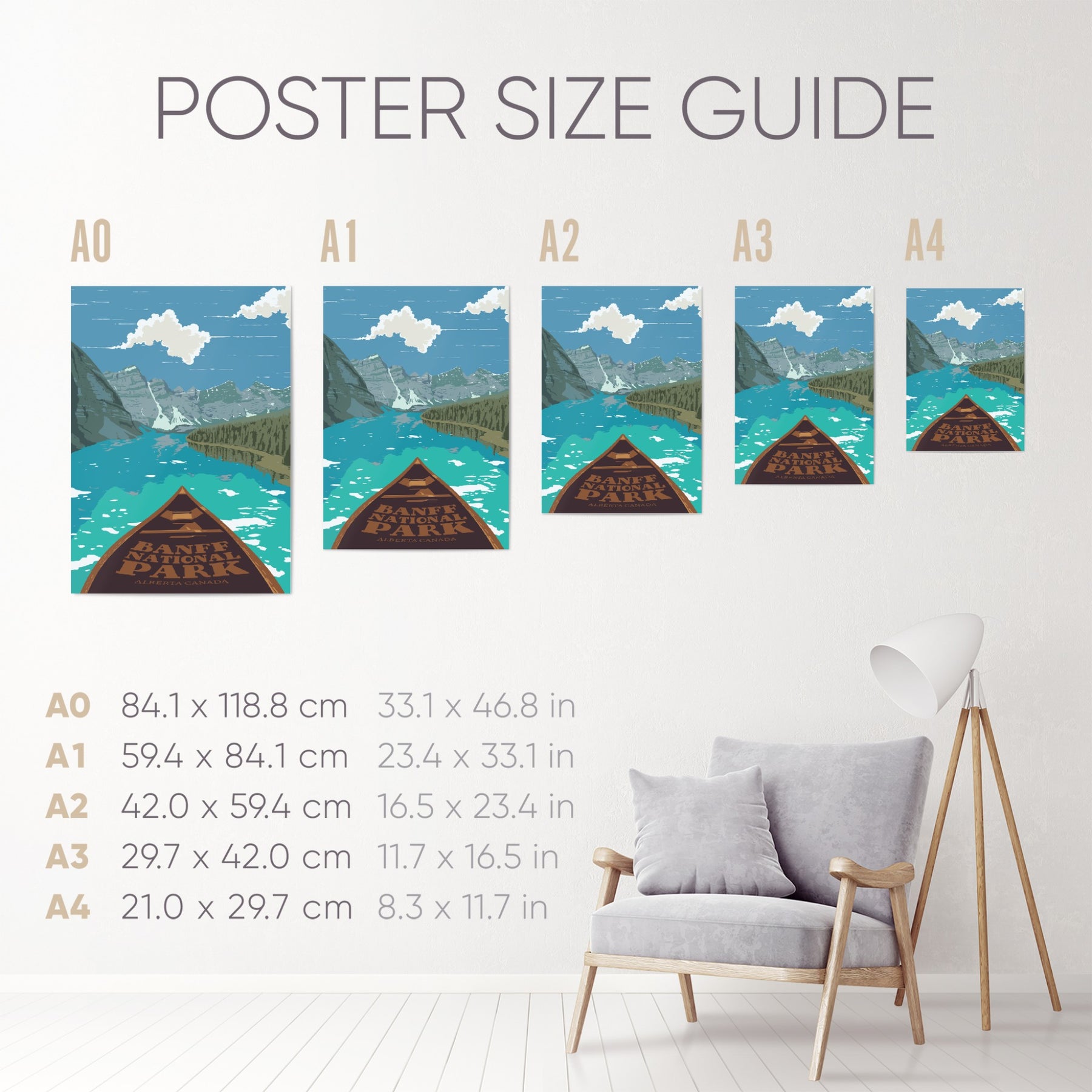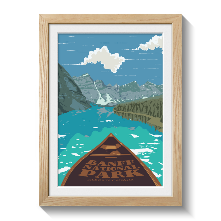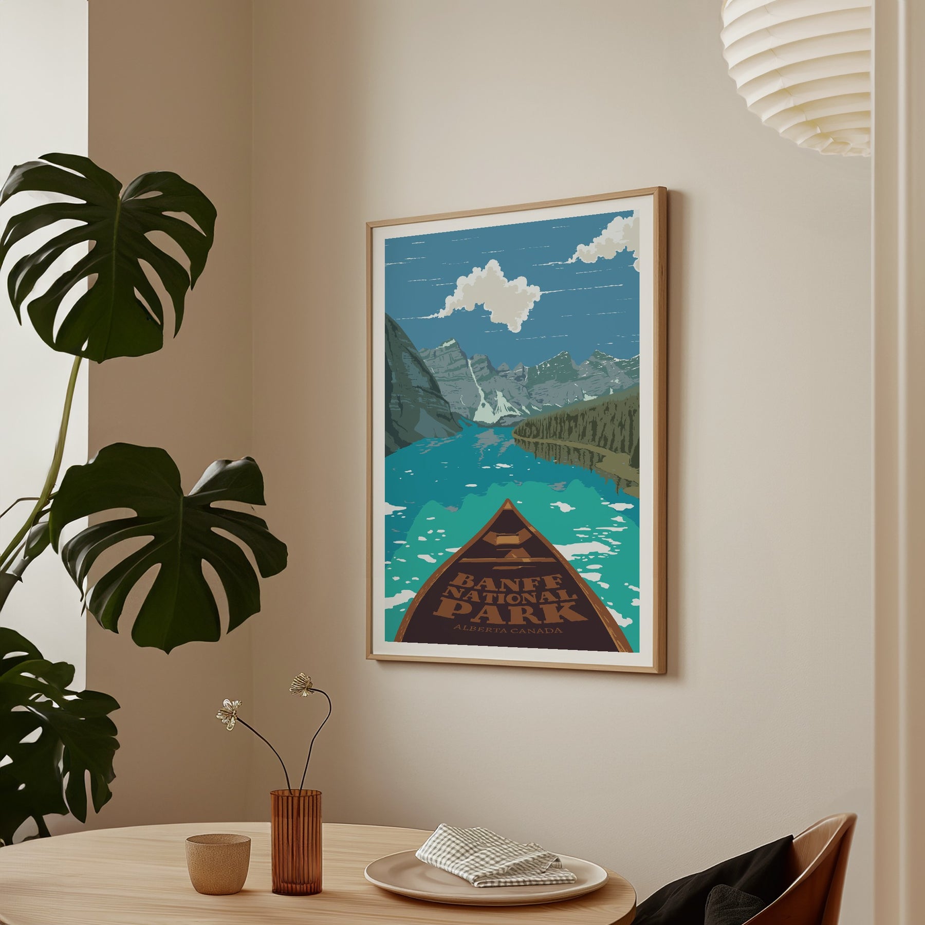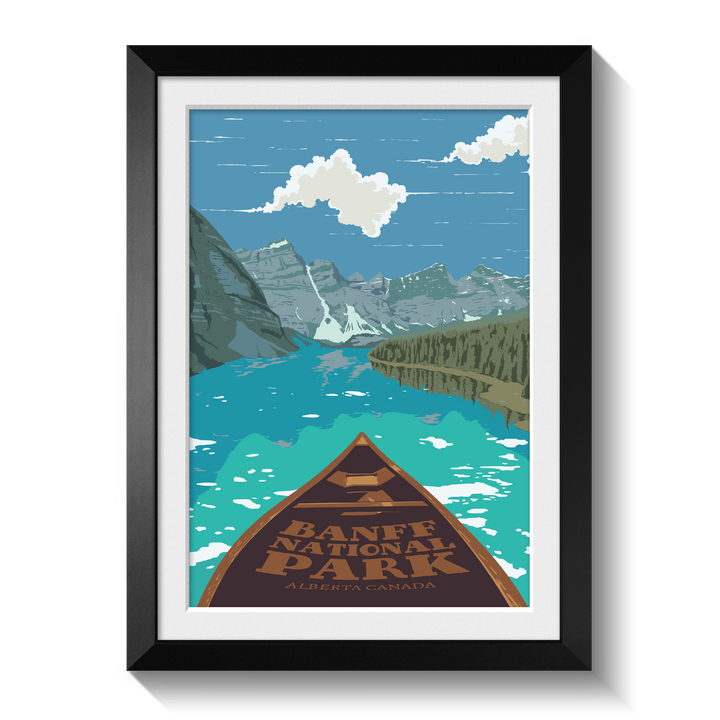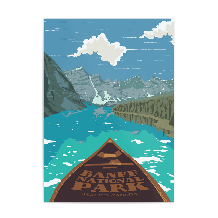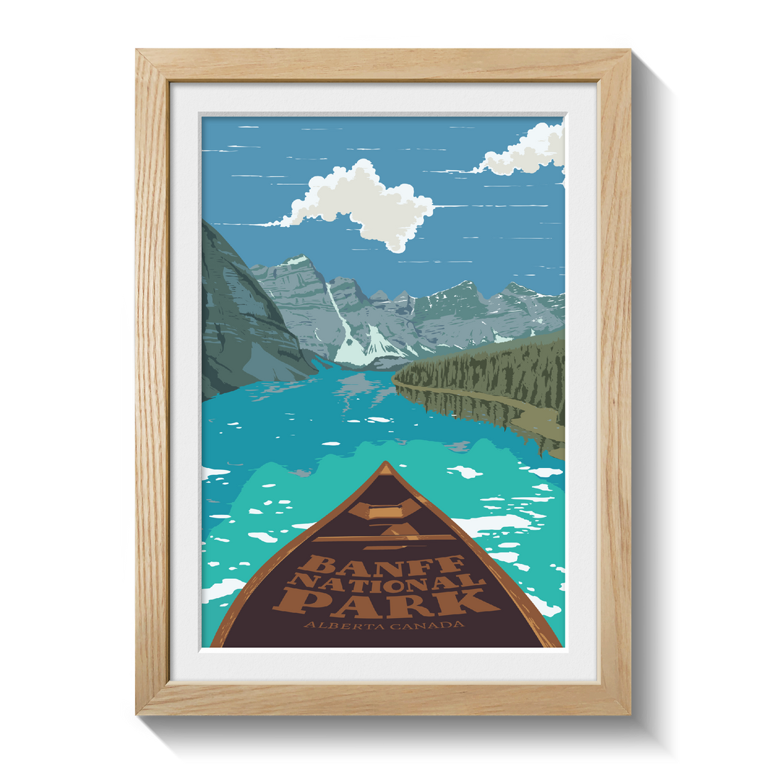 This is an original travel poster of Banff National Park in the heart of the Rocky Mountains, Canada. It features a canoe setting out into the mystical turquoise waters of Moraine Lake with an awesome mountain backdrop.