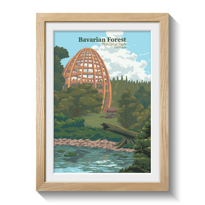 An original travel poster featuring Germany's first National Park, the Bavarian Forest National Park or the Bayerischer Wald. The wooden egg like structure in the travel poster is one of the largest tree top walks in the world.