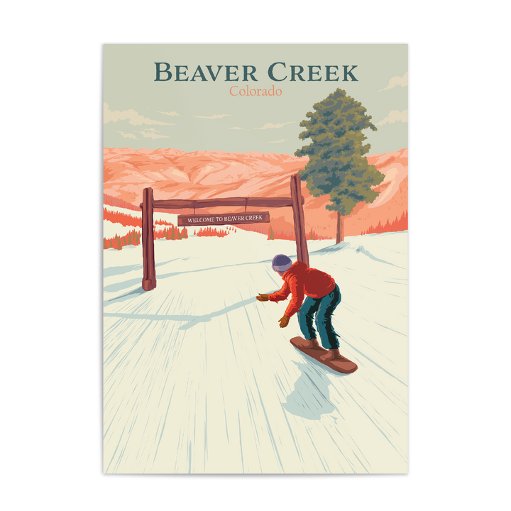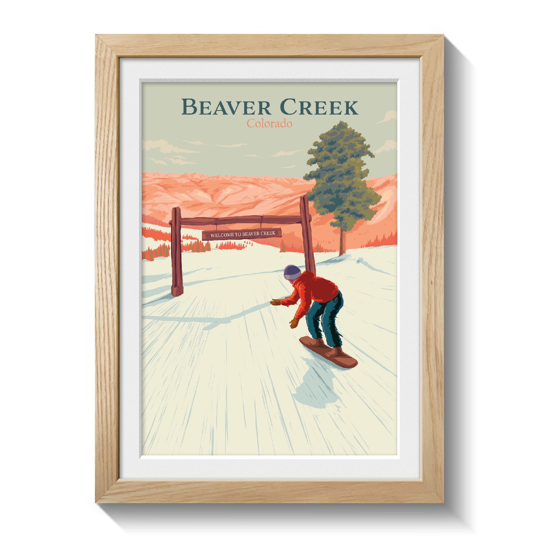An original skiing print featuring the ski resort of Beaver Creek in the Rocky Mountains of Colorado, USA.