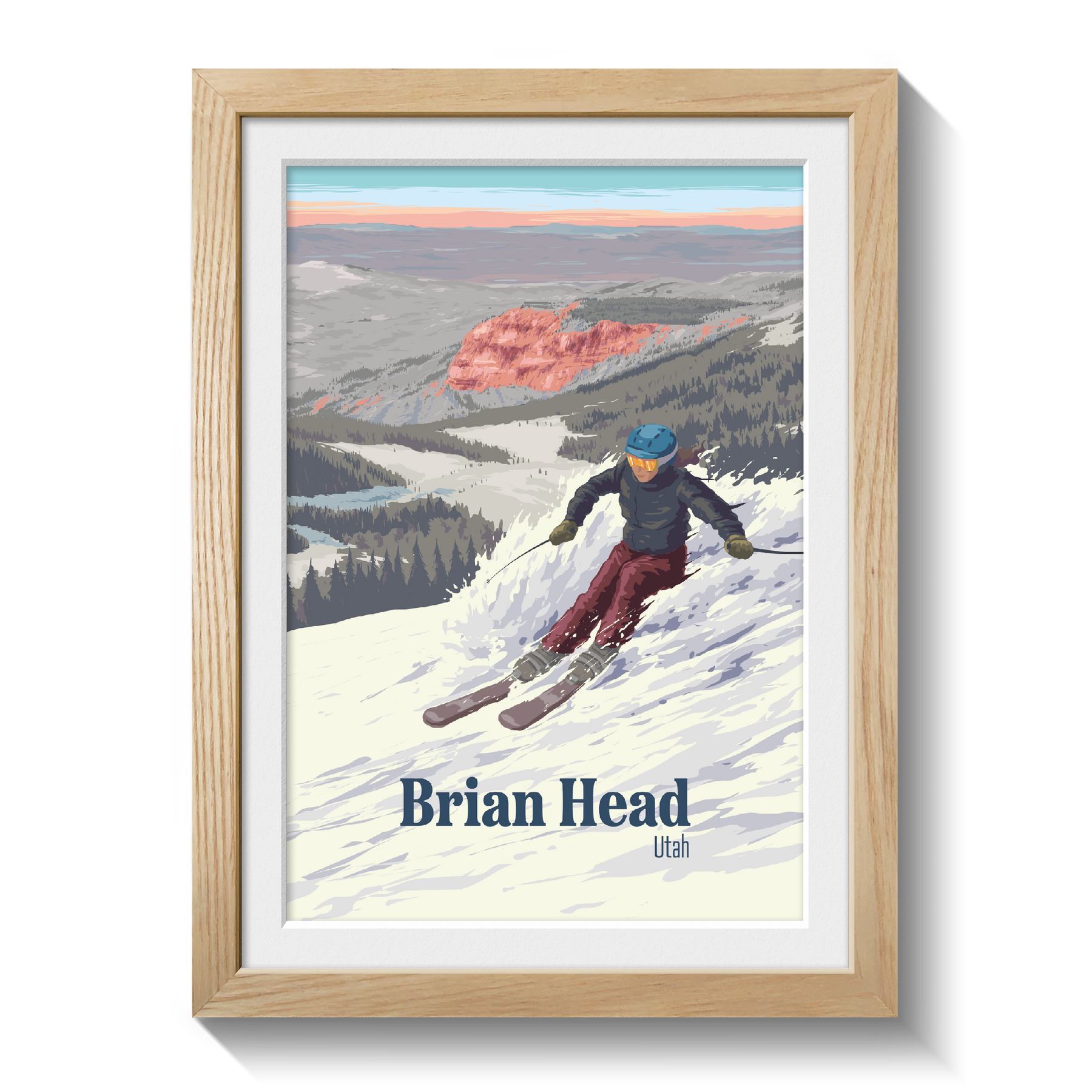 An original skiing print featuring the popular resort of Brian Head, a peak in the Colorado Plateau in Southern Utah.