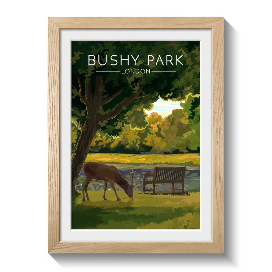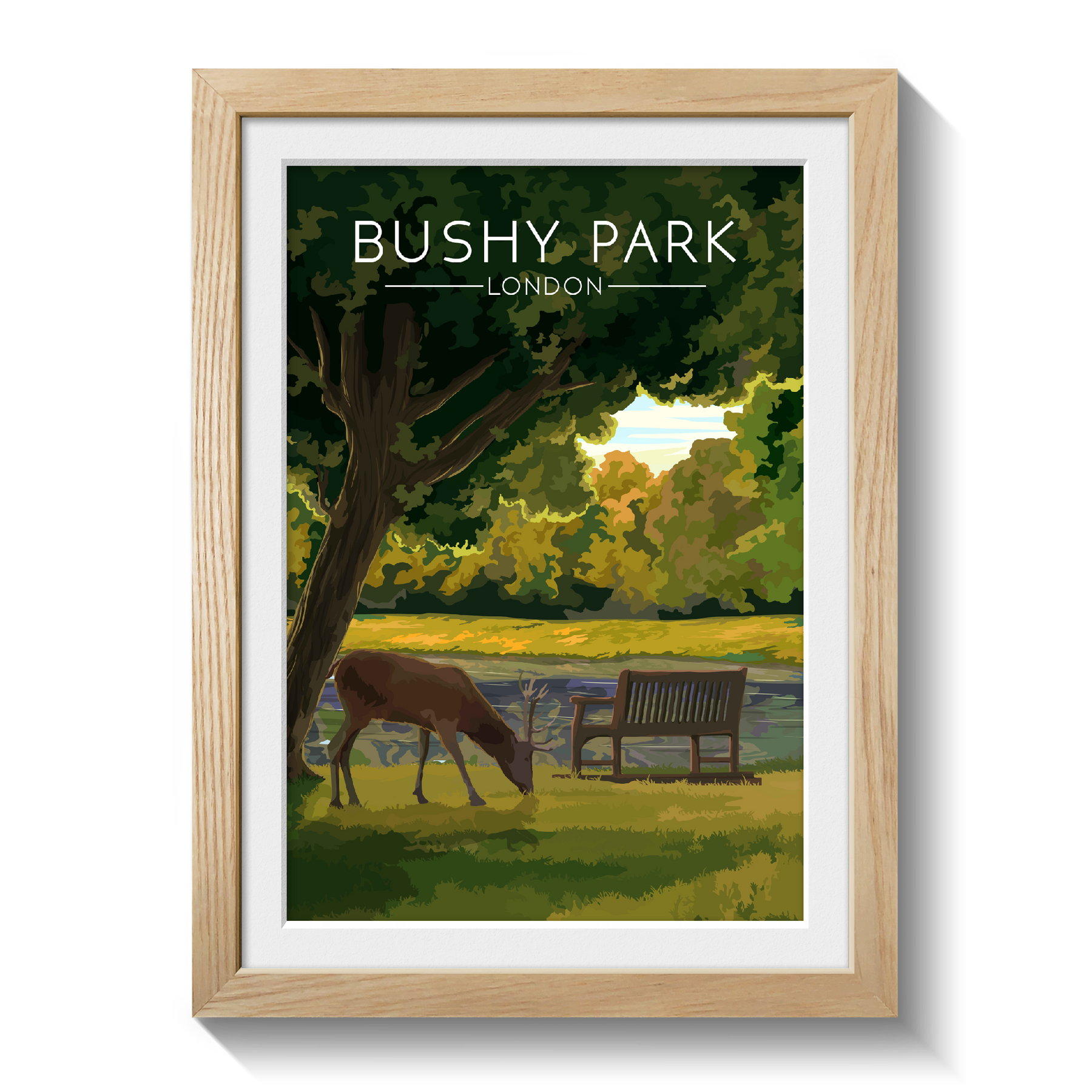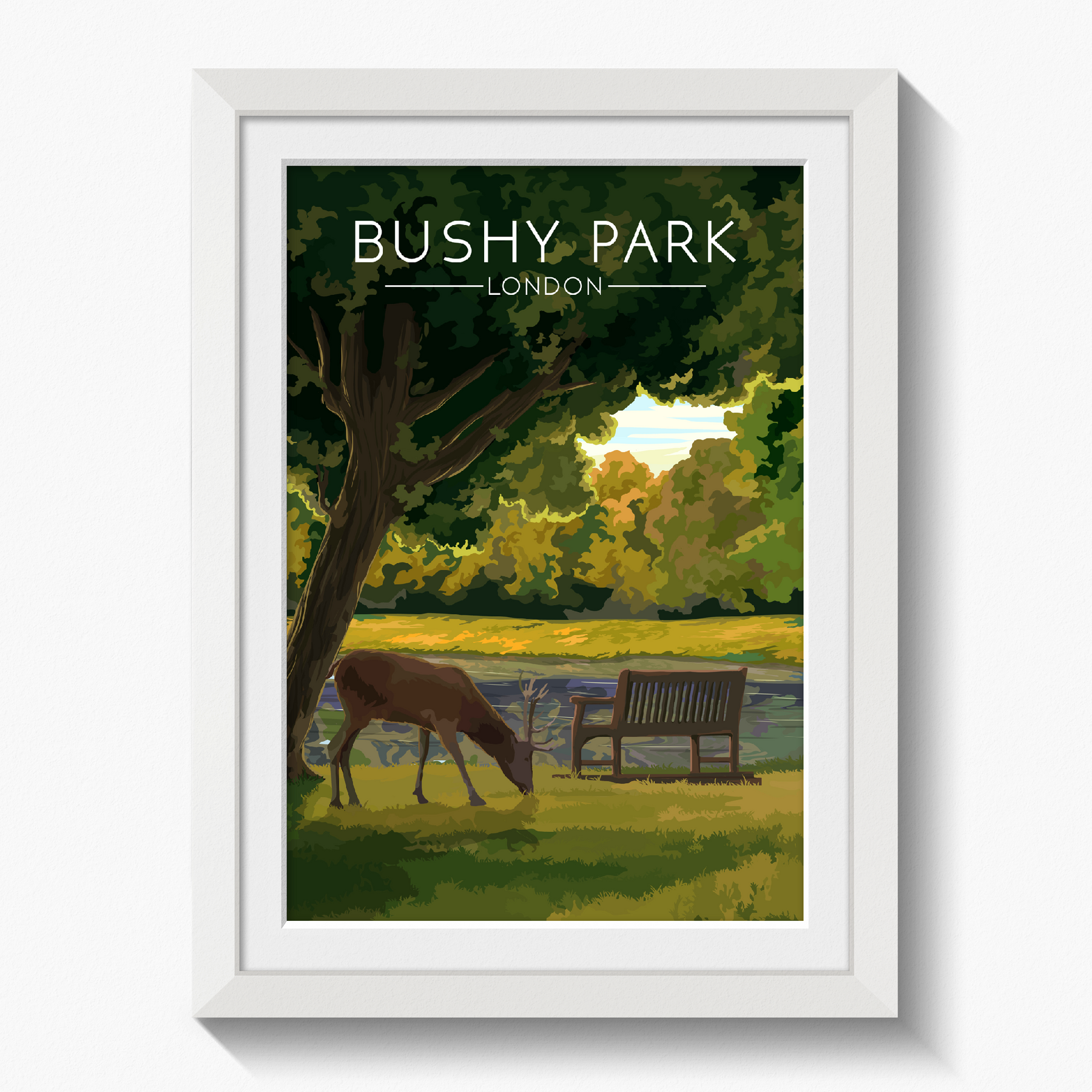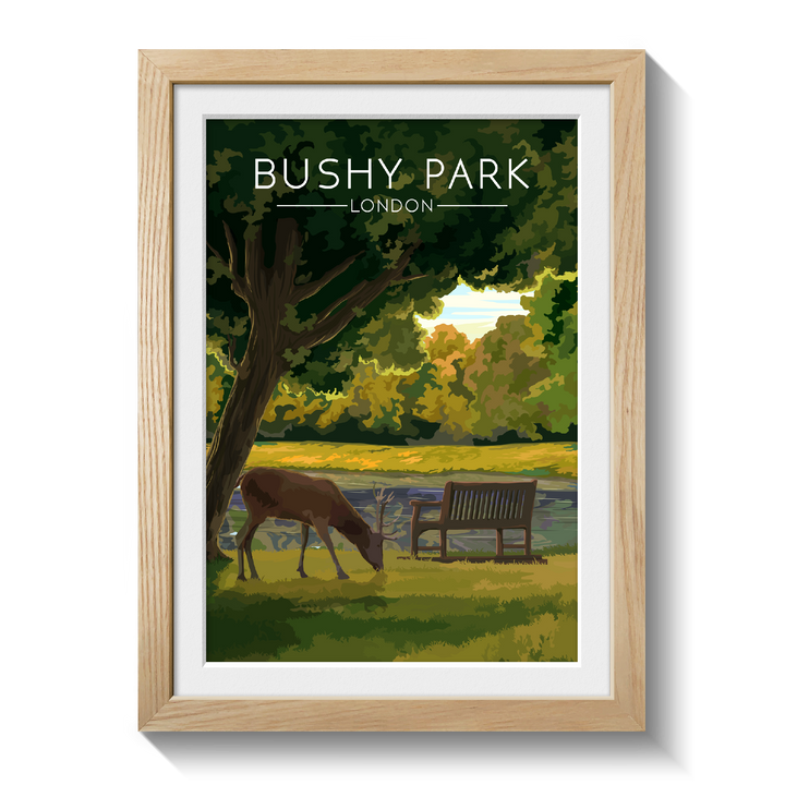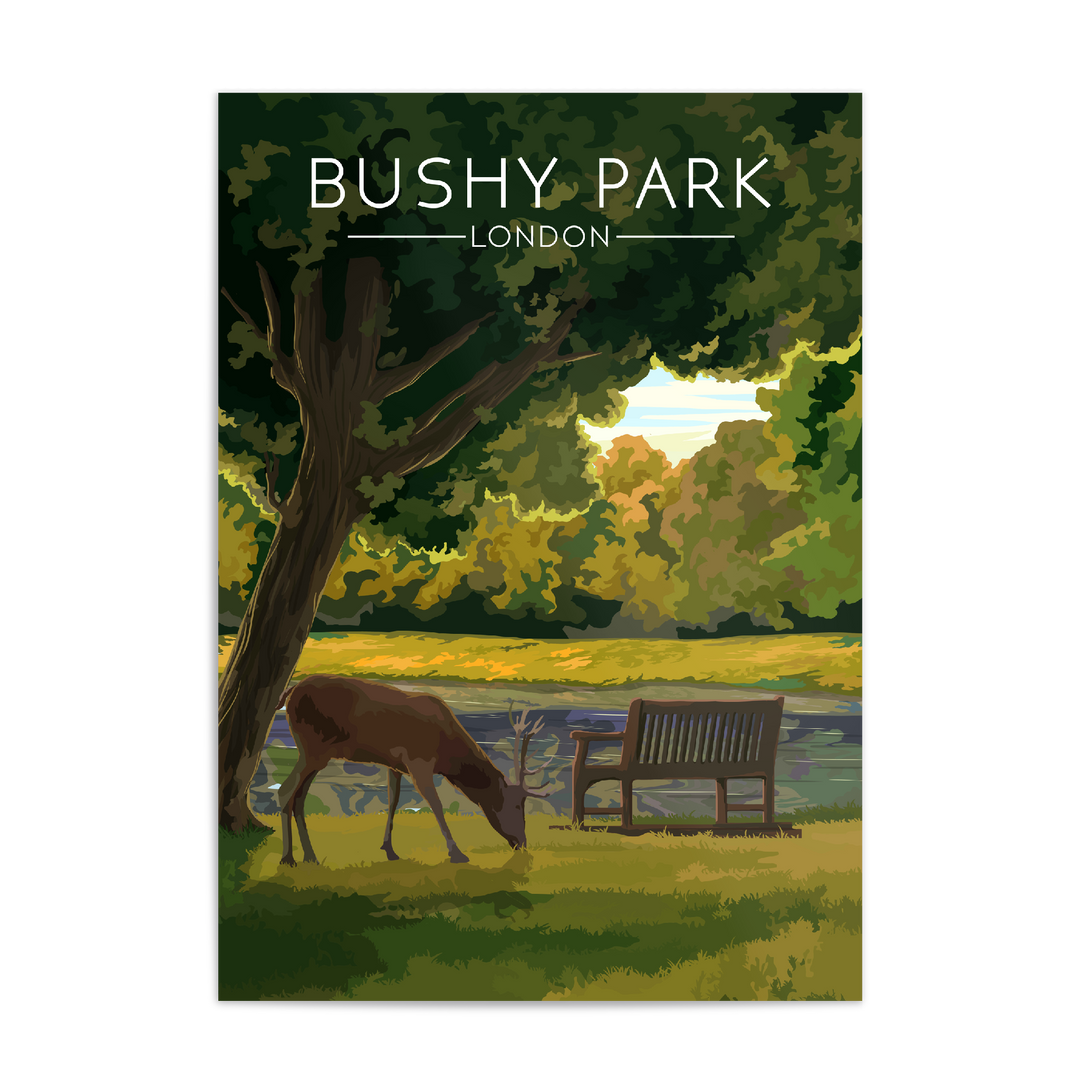 A full colour print featuring a typical peaceful Bushy Park scene. A deer grazes next to a park bench overlooking a tranquil pond.