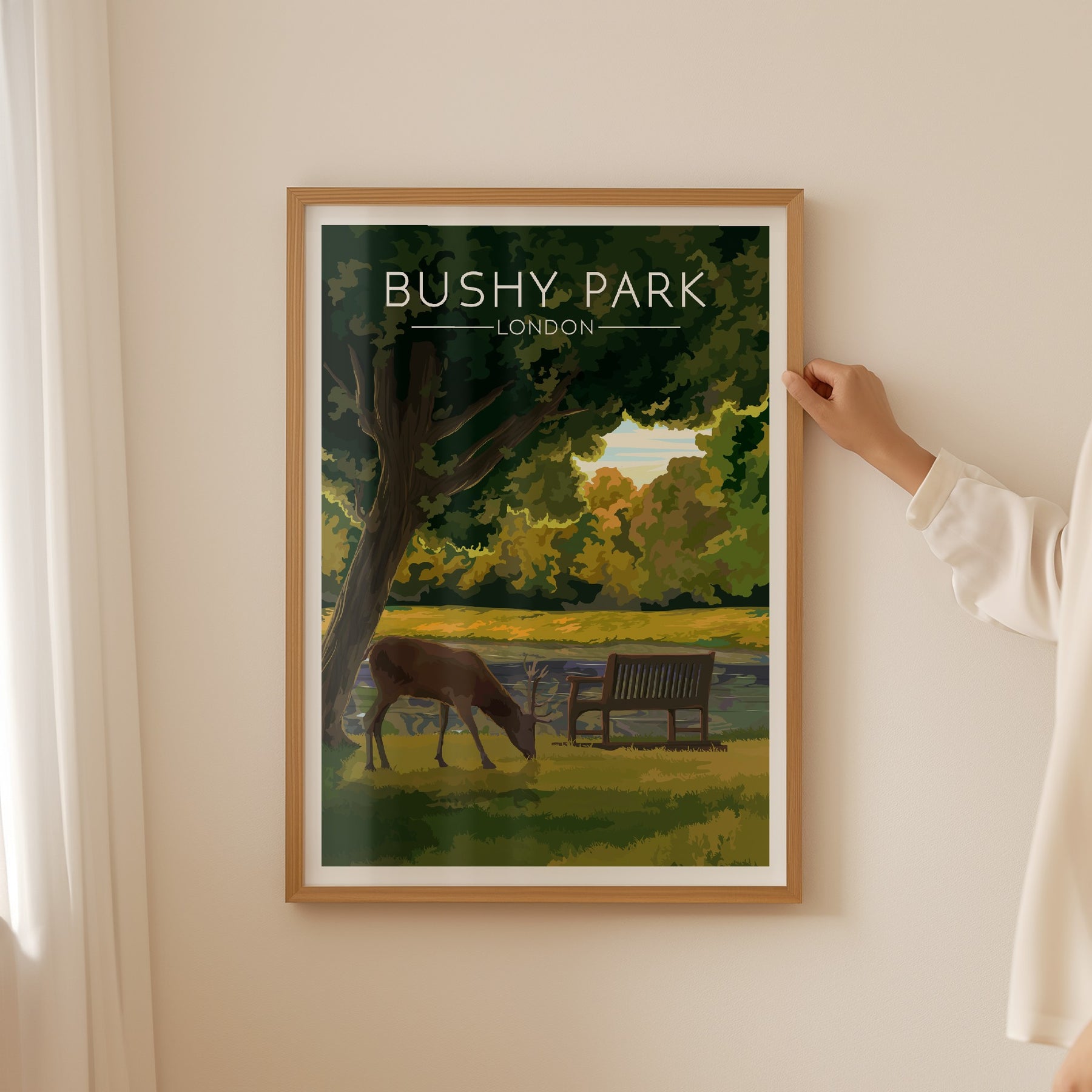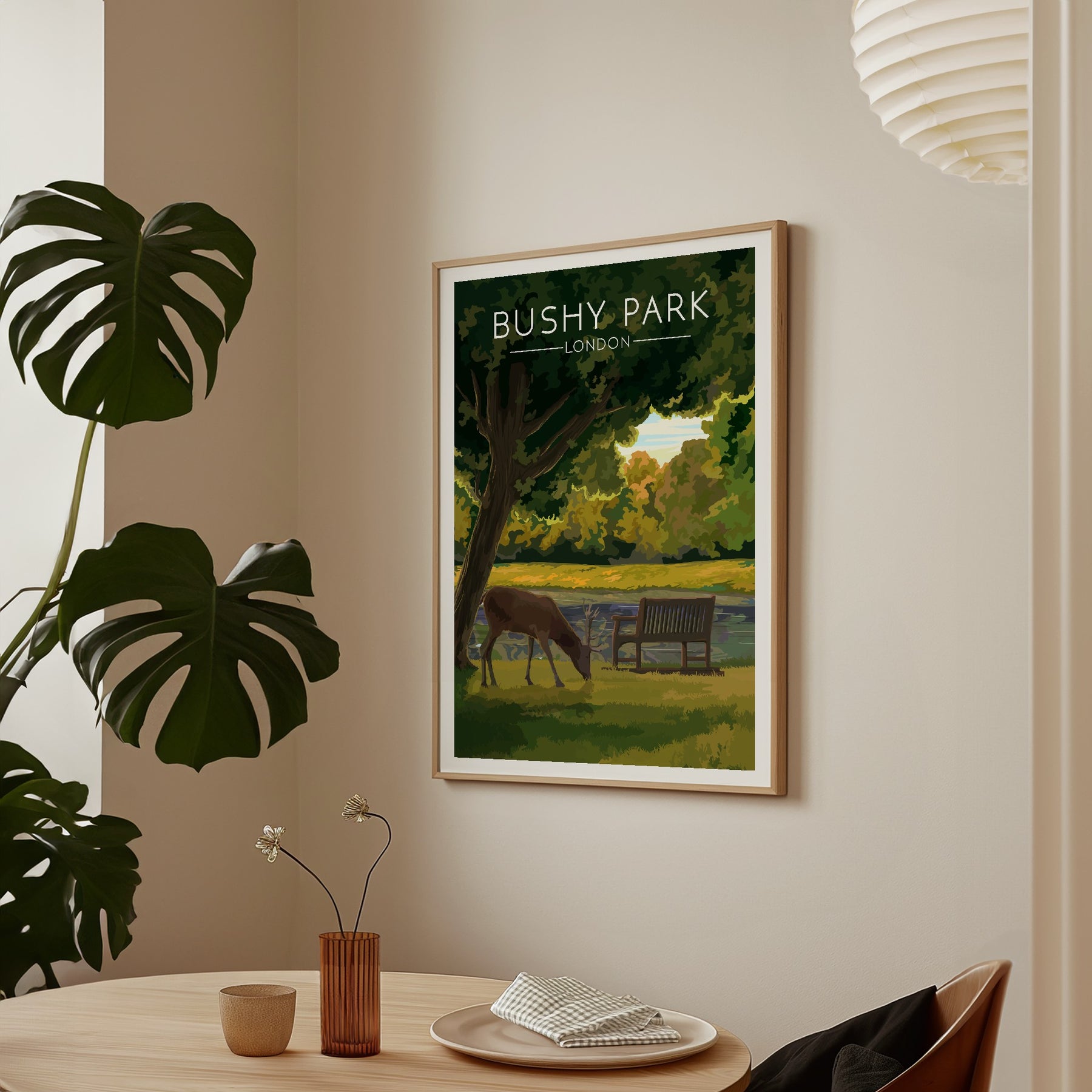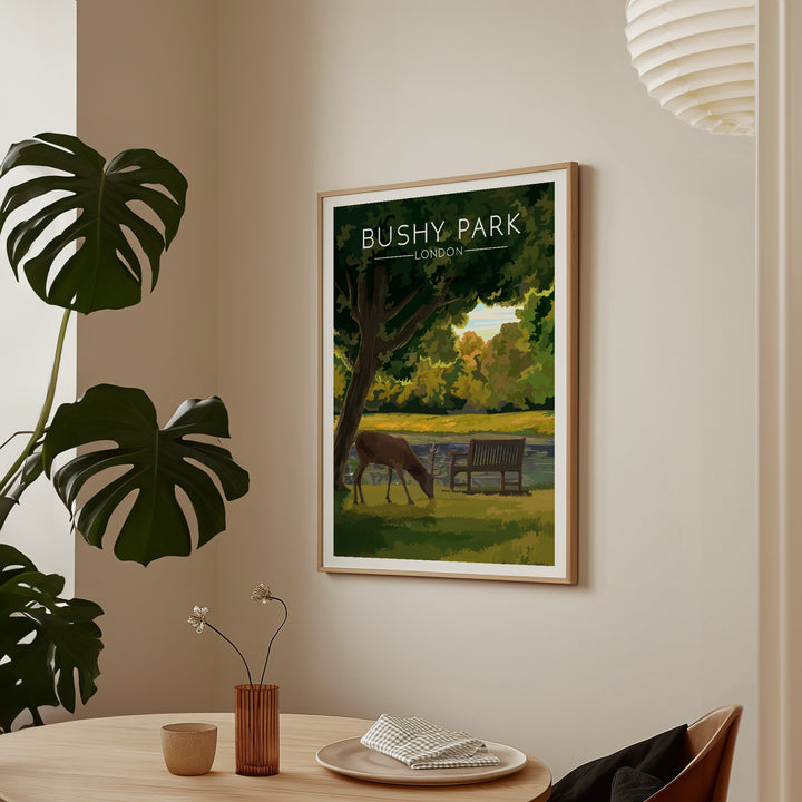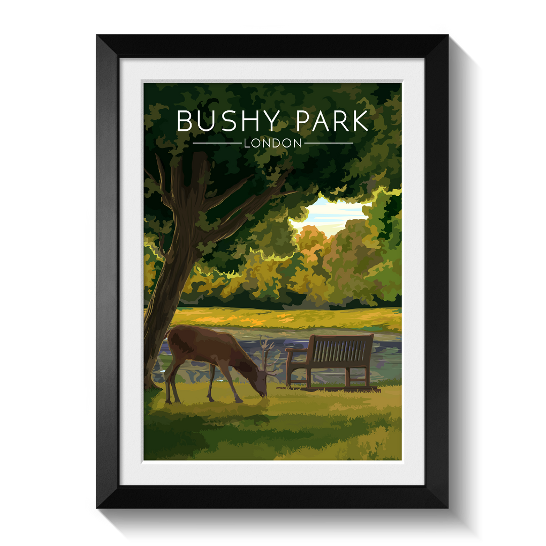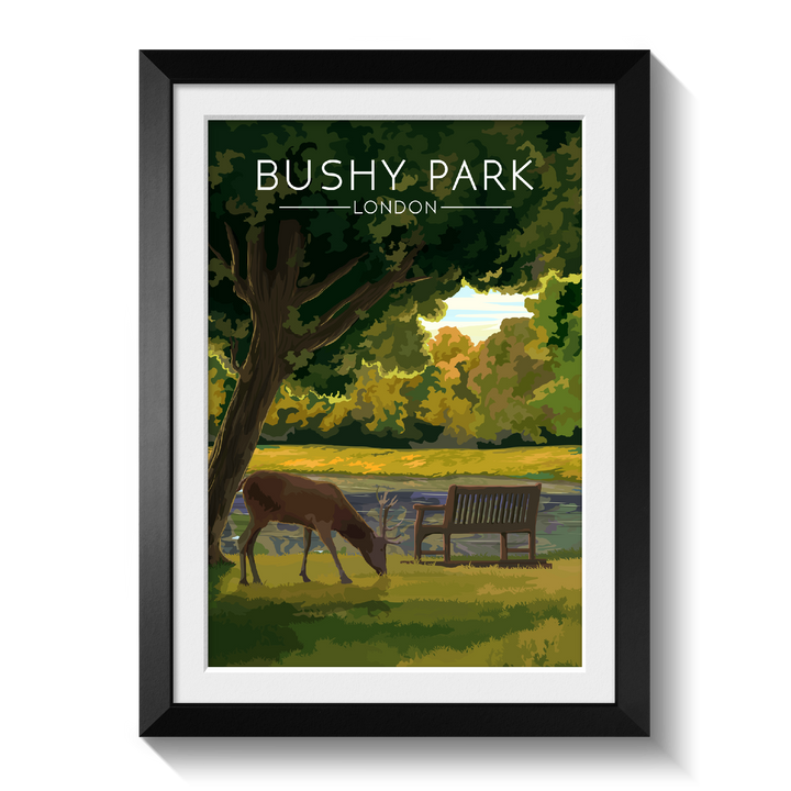 A full colour print featuring a typical peaceful Bushy Park scene. A deer grazes next to a park bench overlooking a tranquil pond.
