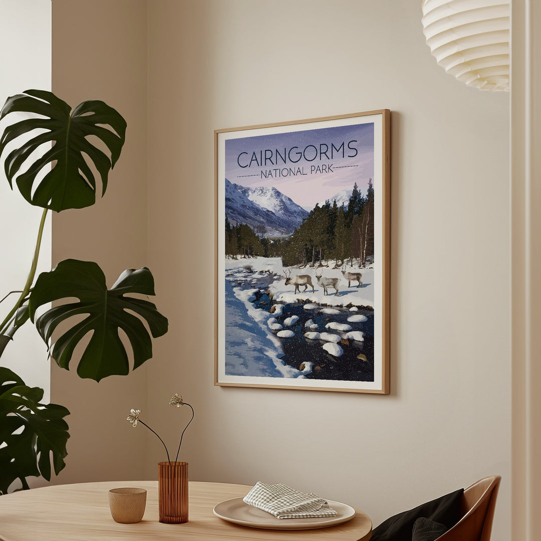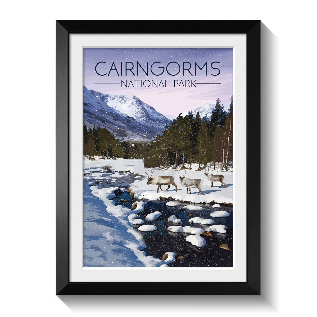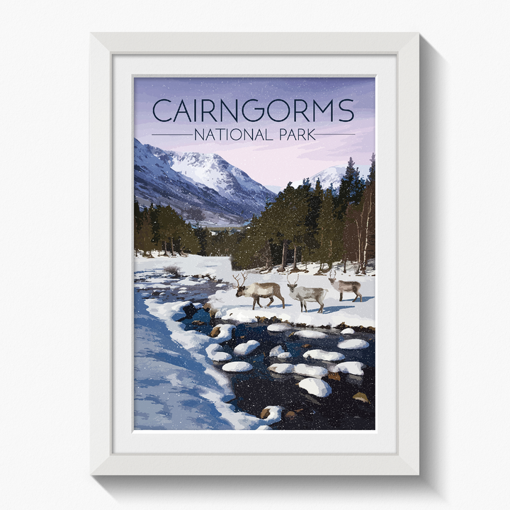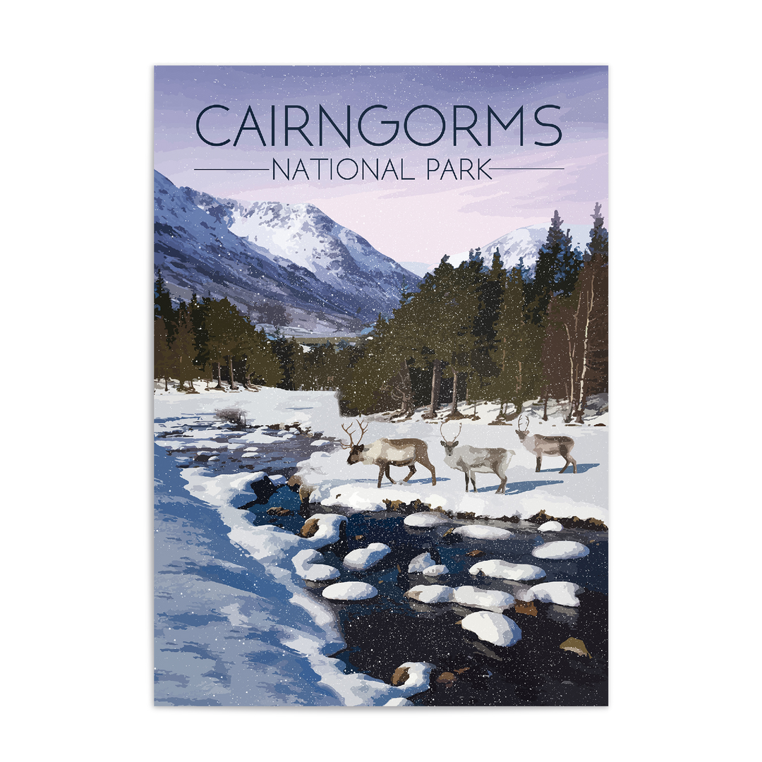 Original travel poster featuring an image from the beautiful Cairngorms National Park in Winter. The Cairngorms is home to the only wild, free roaming herd of Reindeer in the UK.
