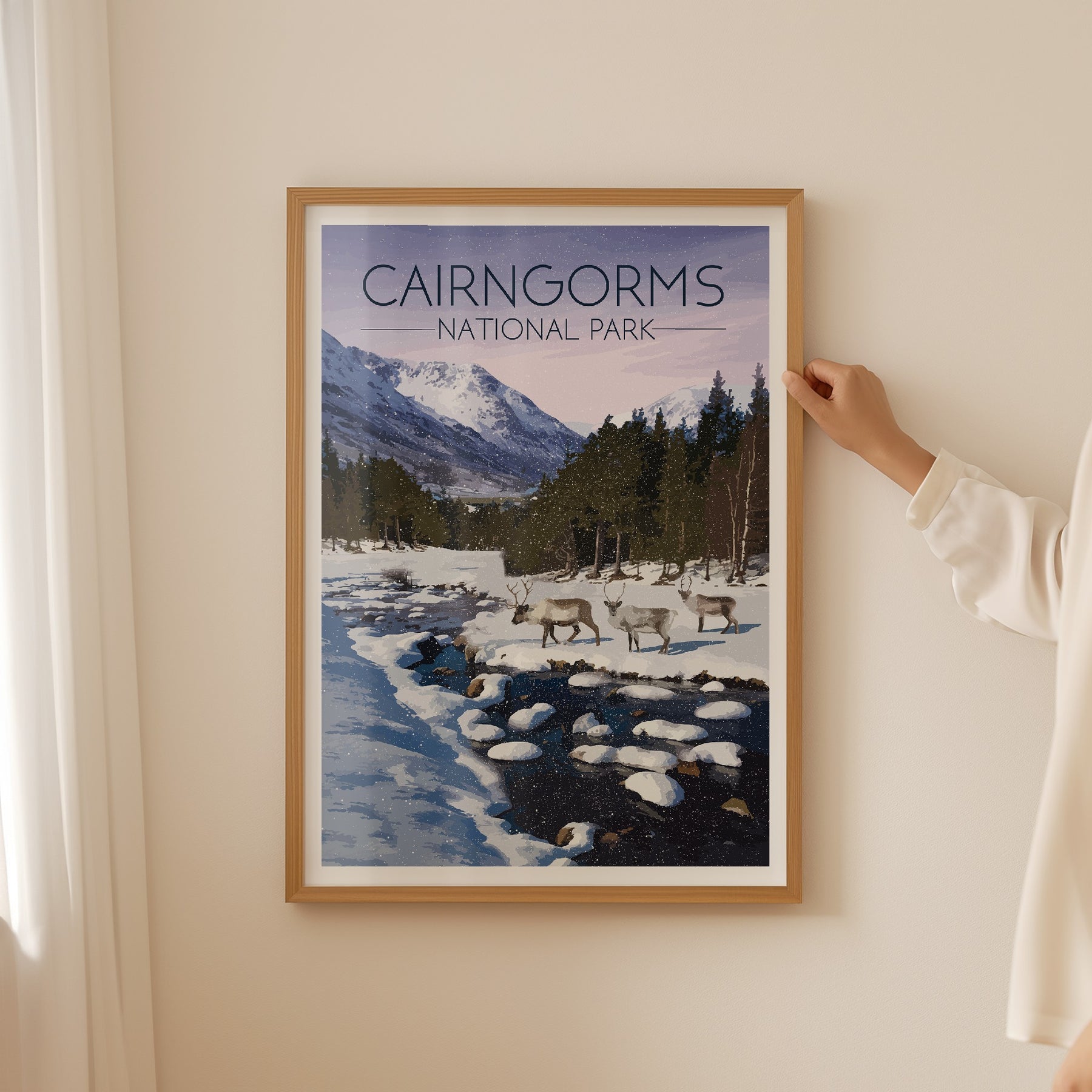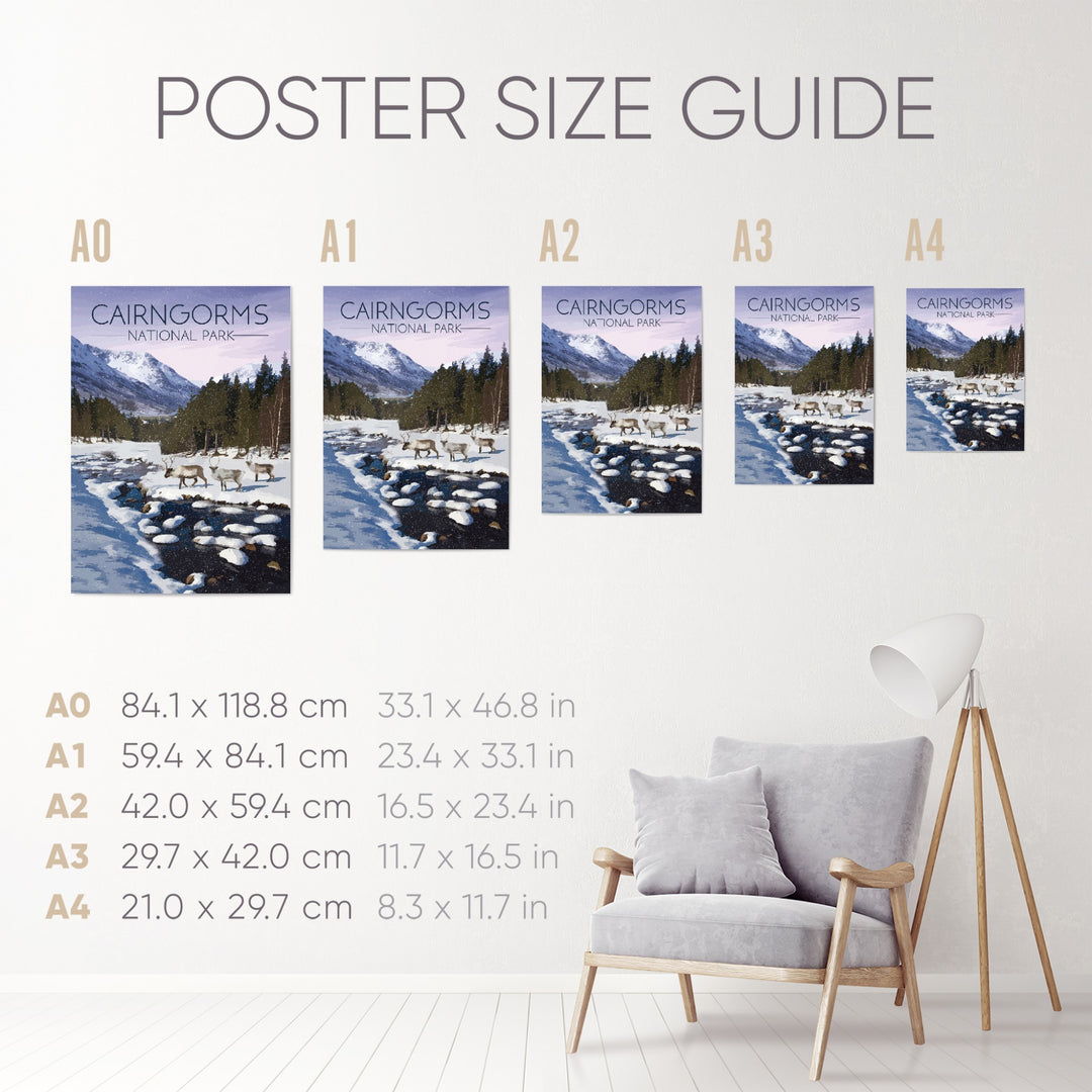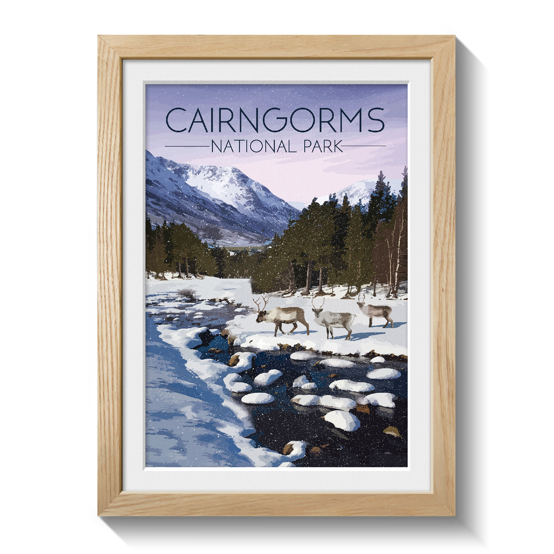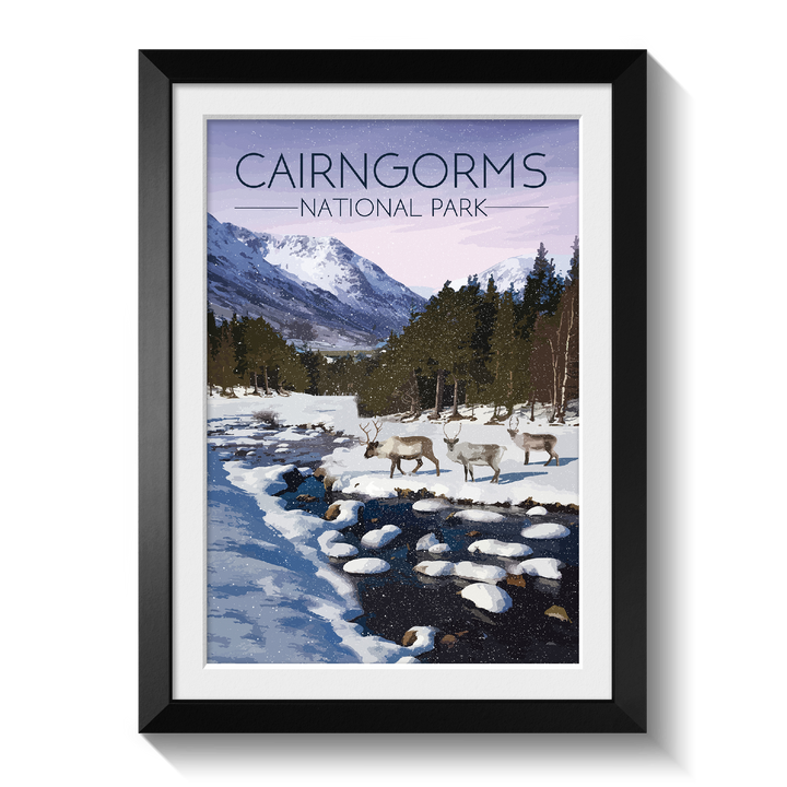 Original travel poster featuring an image from the beautiful Cairngorms National Park in Winter. The Cairngorms is home to the only wild, free roaming herd of Reindeer in the UK.