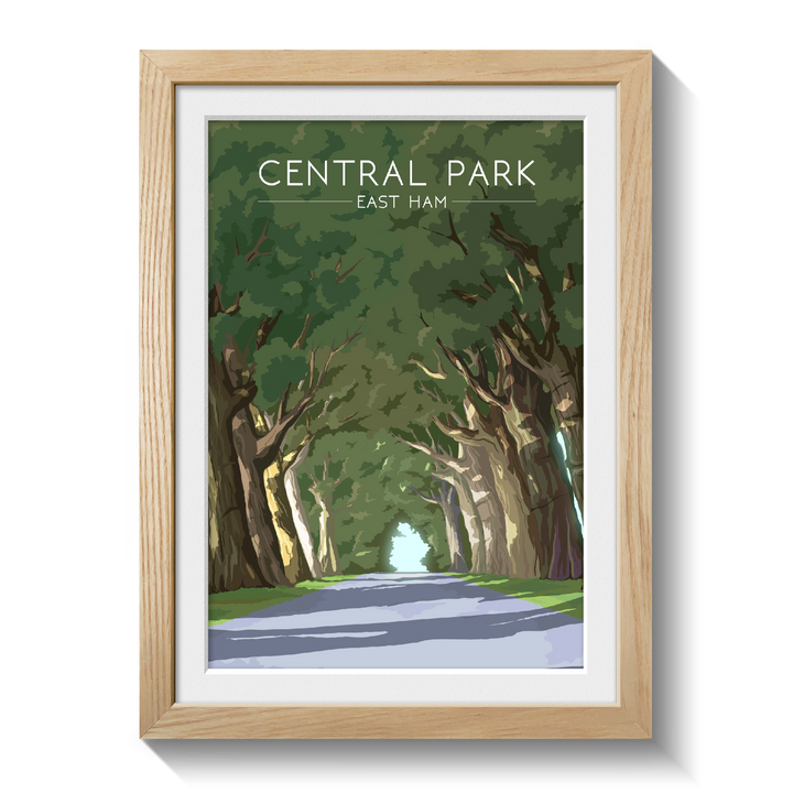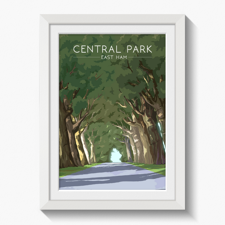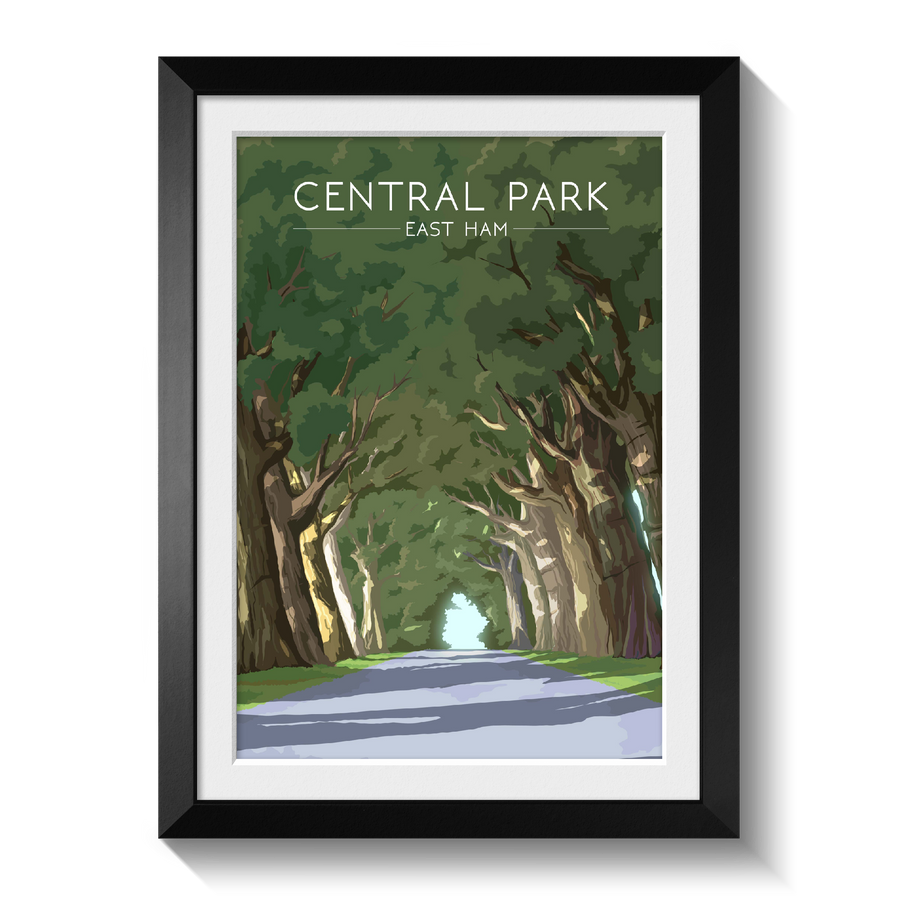 An original print featuring Central Park East Ham, London. This small park, much loved by locals, features several gardens, a playground and a nice cafe.
