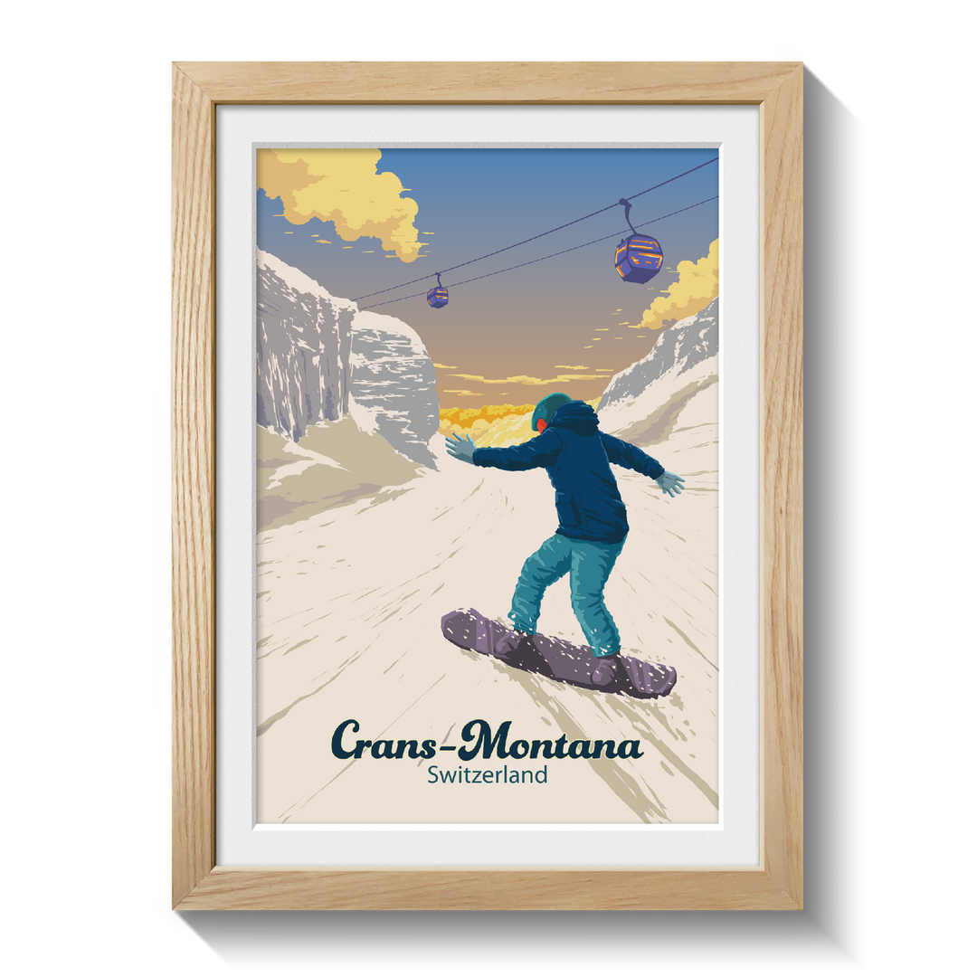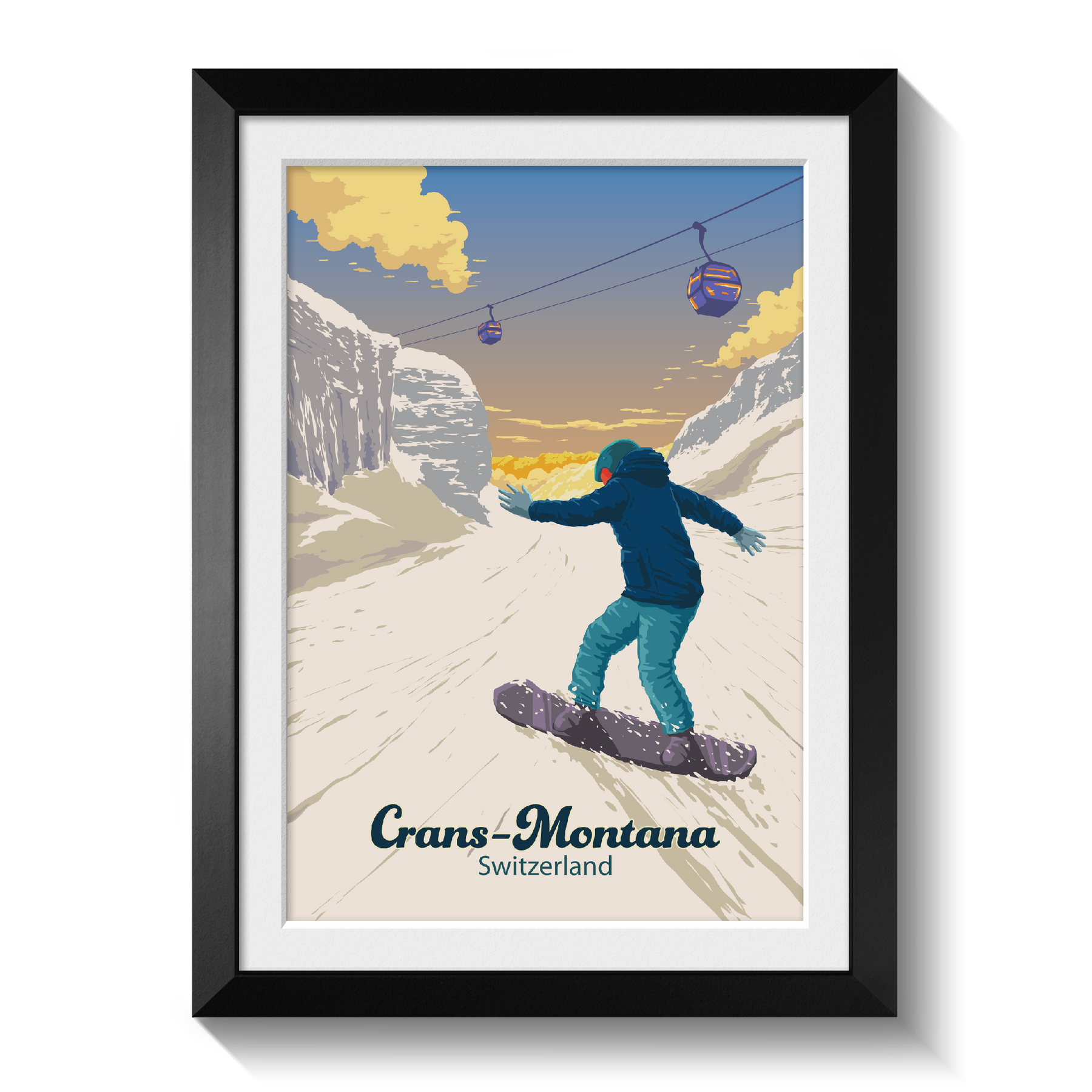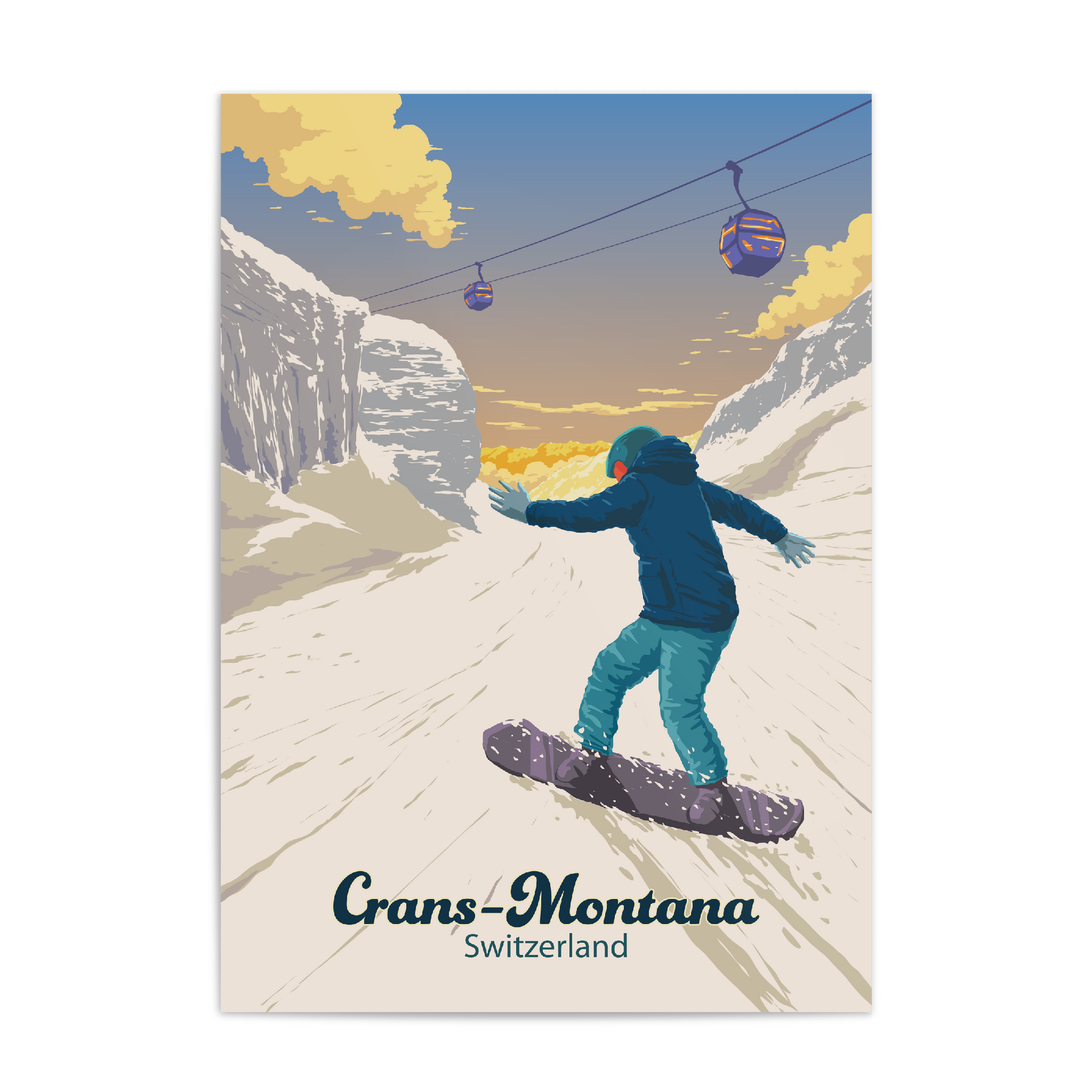 This is an original snowboarding specific travel poster featuring the Swiss ski resort of Crans Montana in the Valais area of the Swiss Alps.