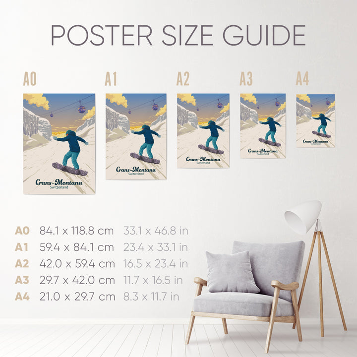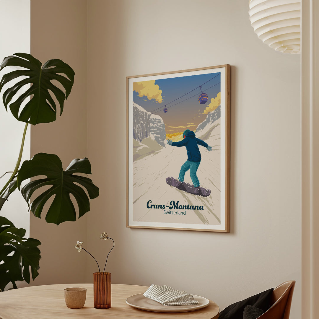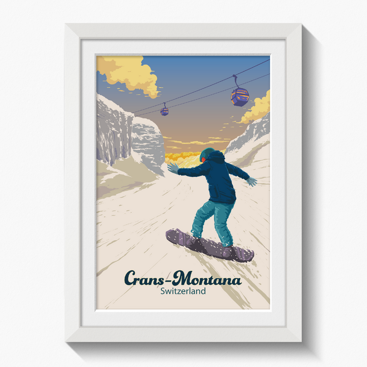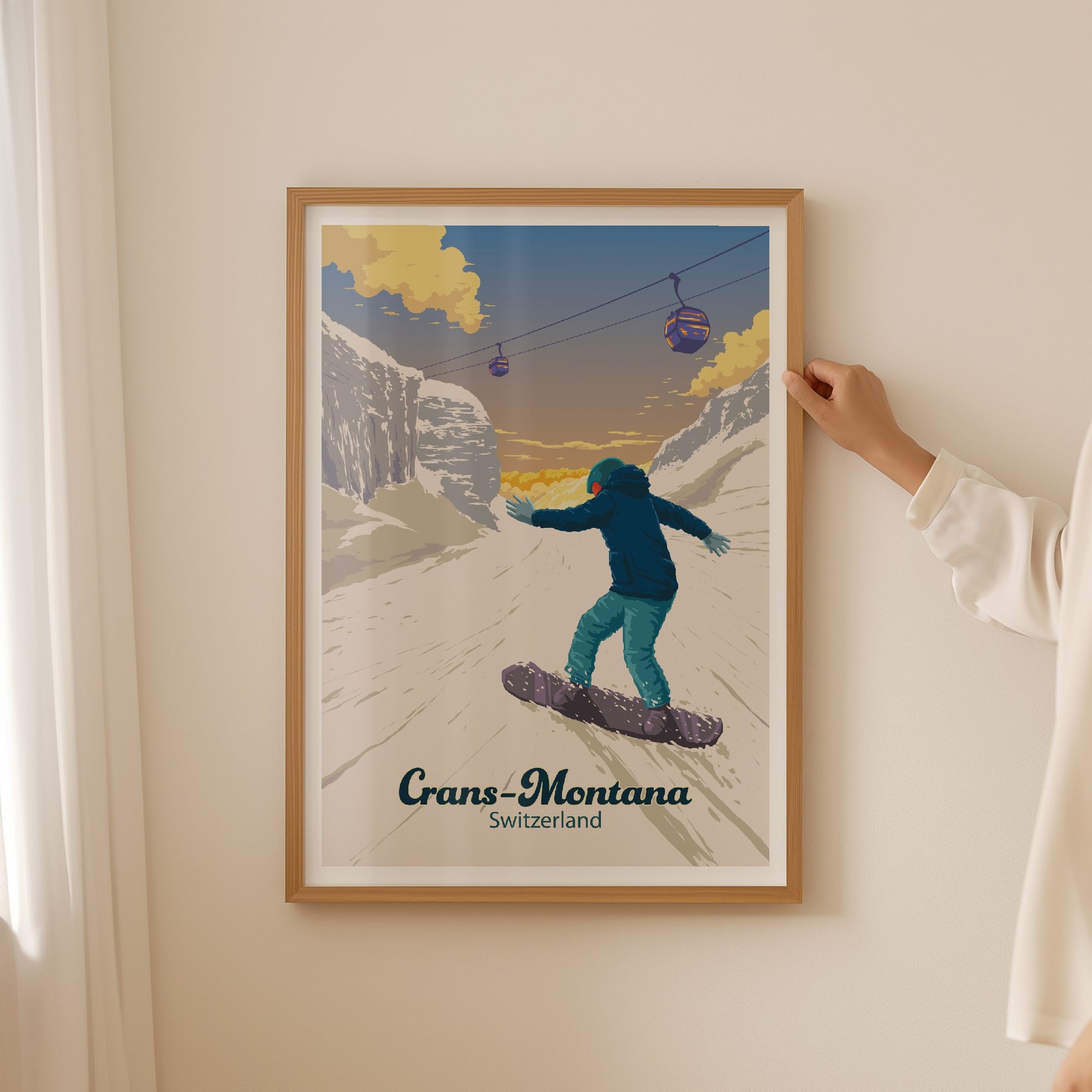 This is an original snowboarding specific travel poster featuring the Swiss ski resort of Crans Montana in the Valais area of the Swiss Alps.