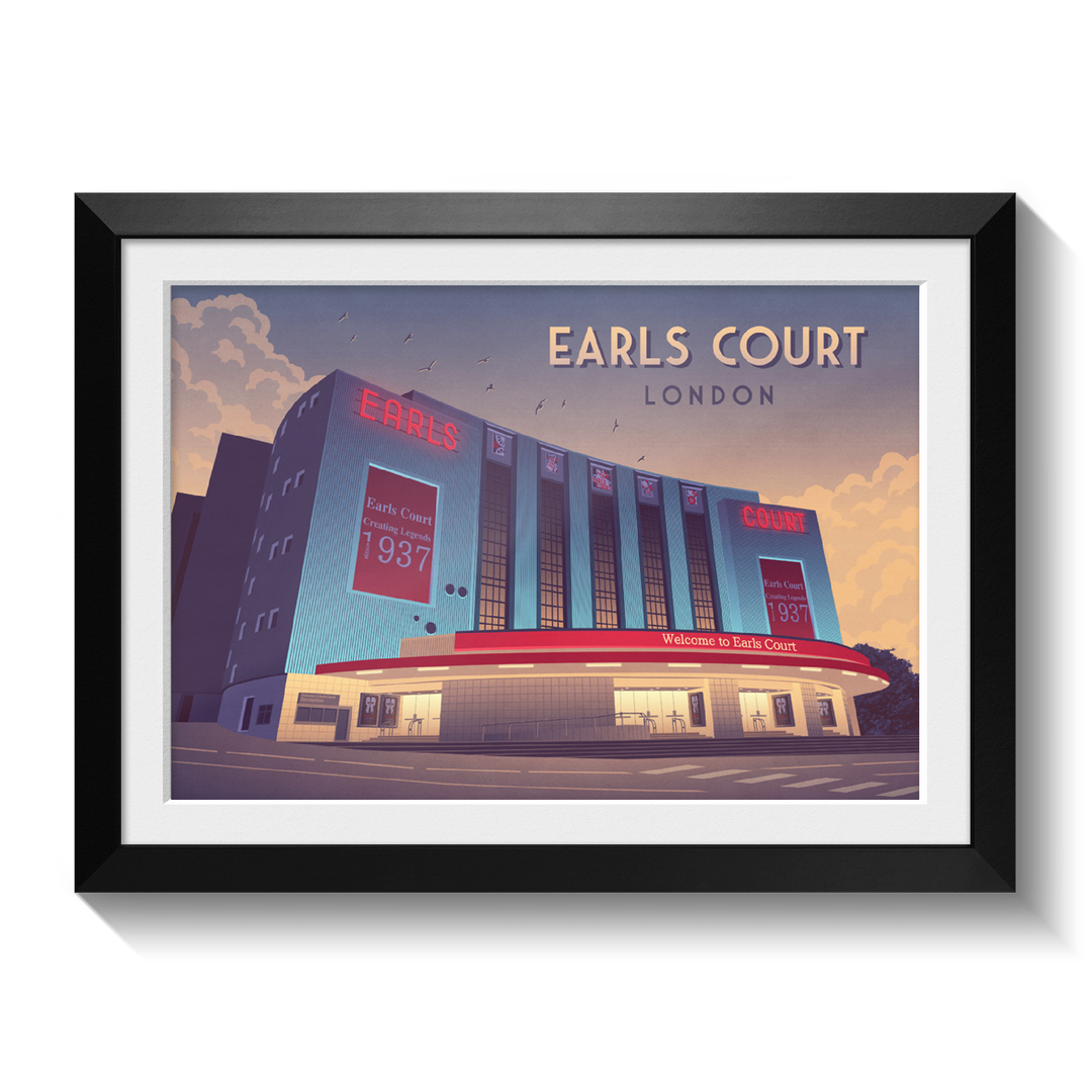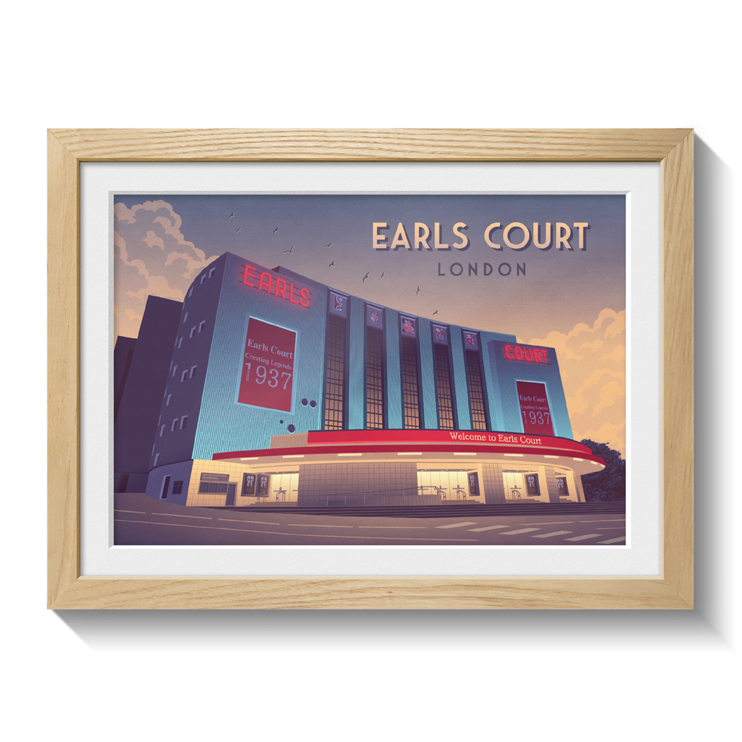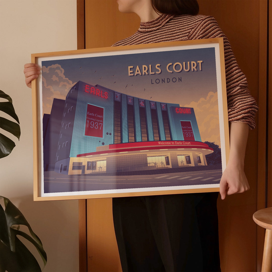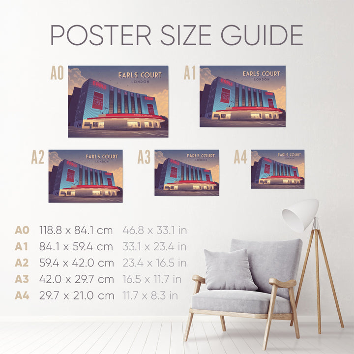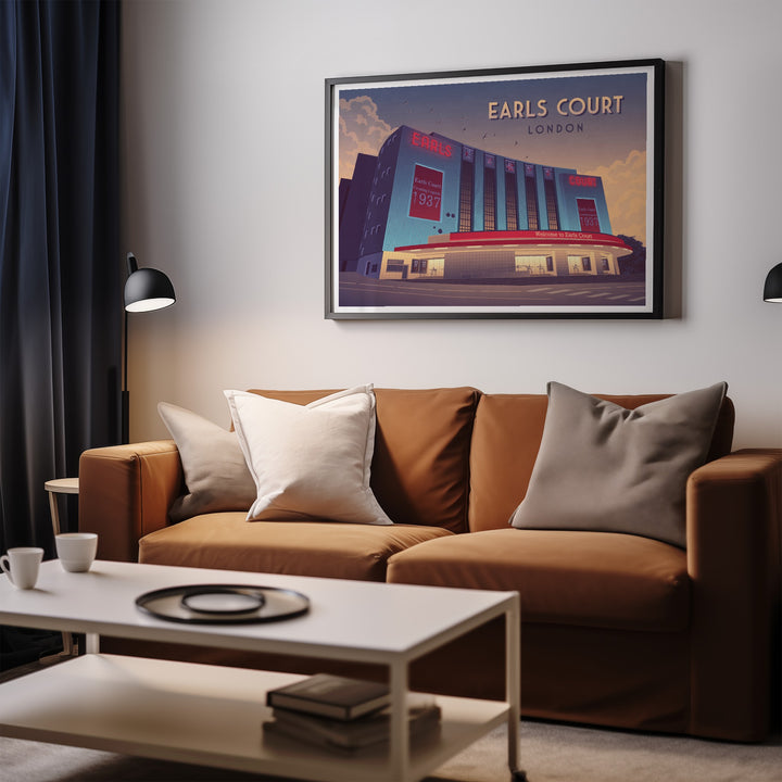 An original poster featuring London's Earls Court Exhibition Centre. Once the largest venue of its kind in the capital, Earls Court was sadly demolished in 2017 after a failed bid for heritage status. For many years it was home to some huge events such as the Royal Tournament, Crufts and the Brit Awards.