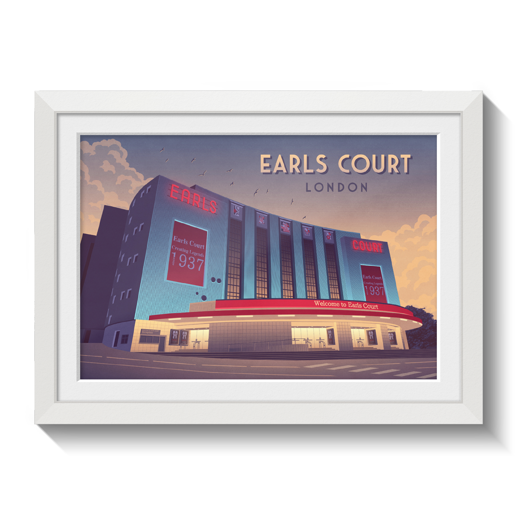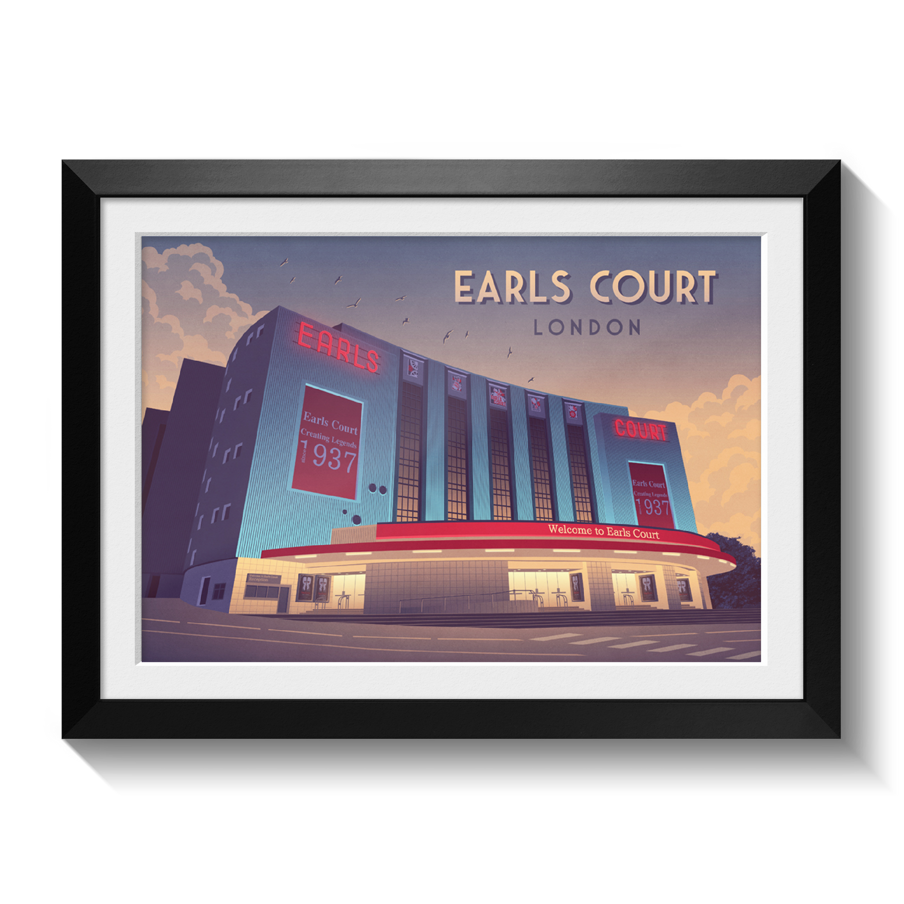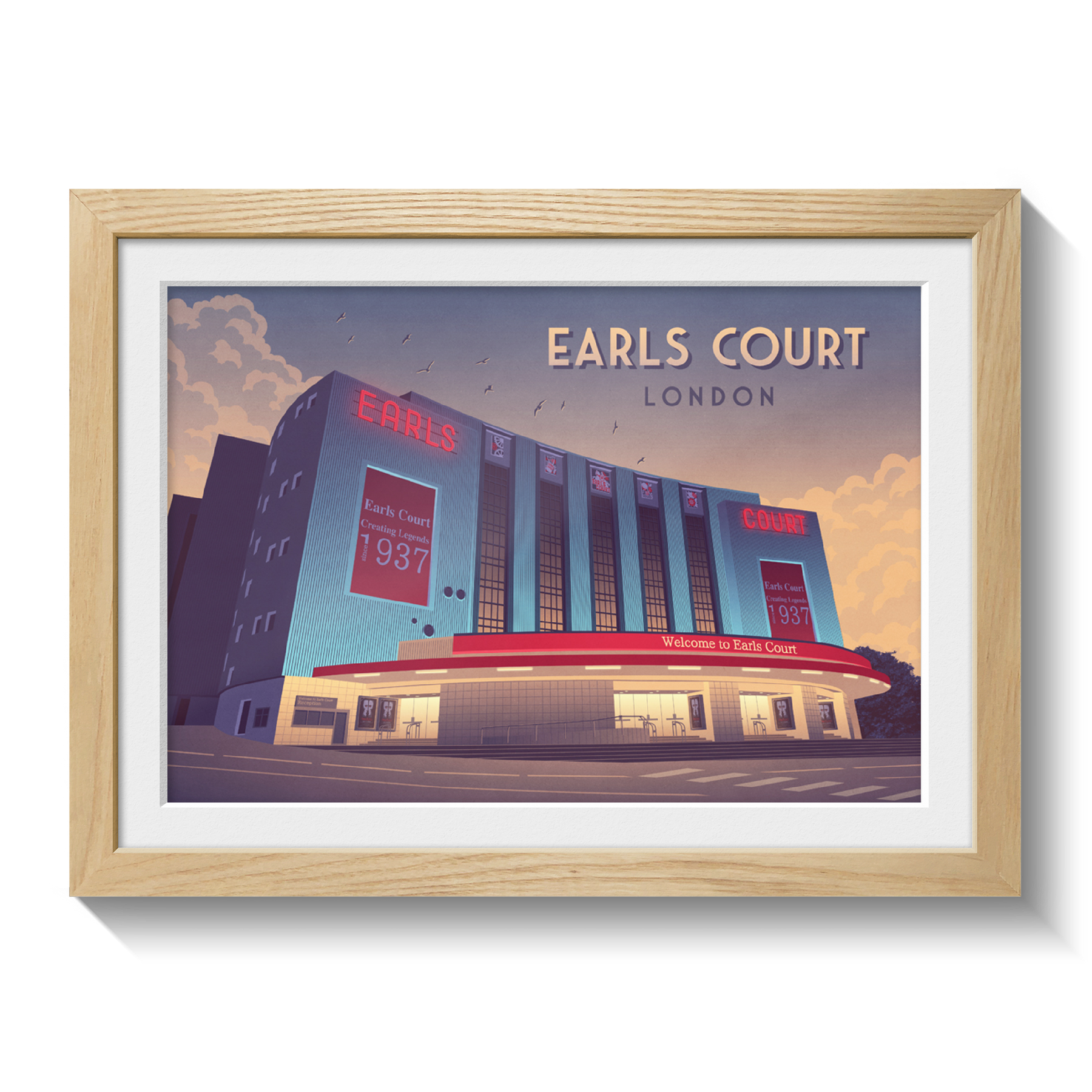 An original poster featuring London's Earls Court Exhibition Centre. Once the largest venue of its kind in the capital, Earls Court was sadly demolished in 2017 after a failed bid for heritage status. For many years it was home to some huge events such as the Royal Tournament, Crufts and the Brit Awards.