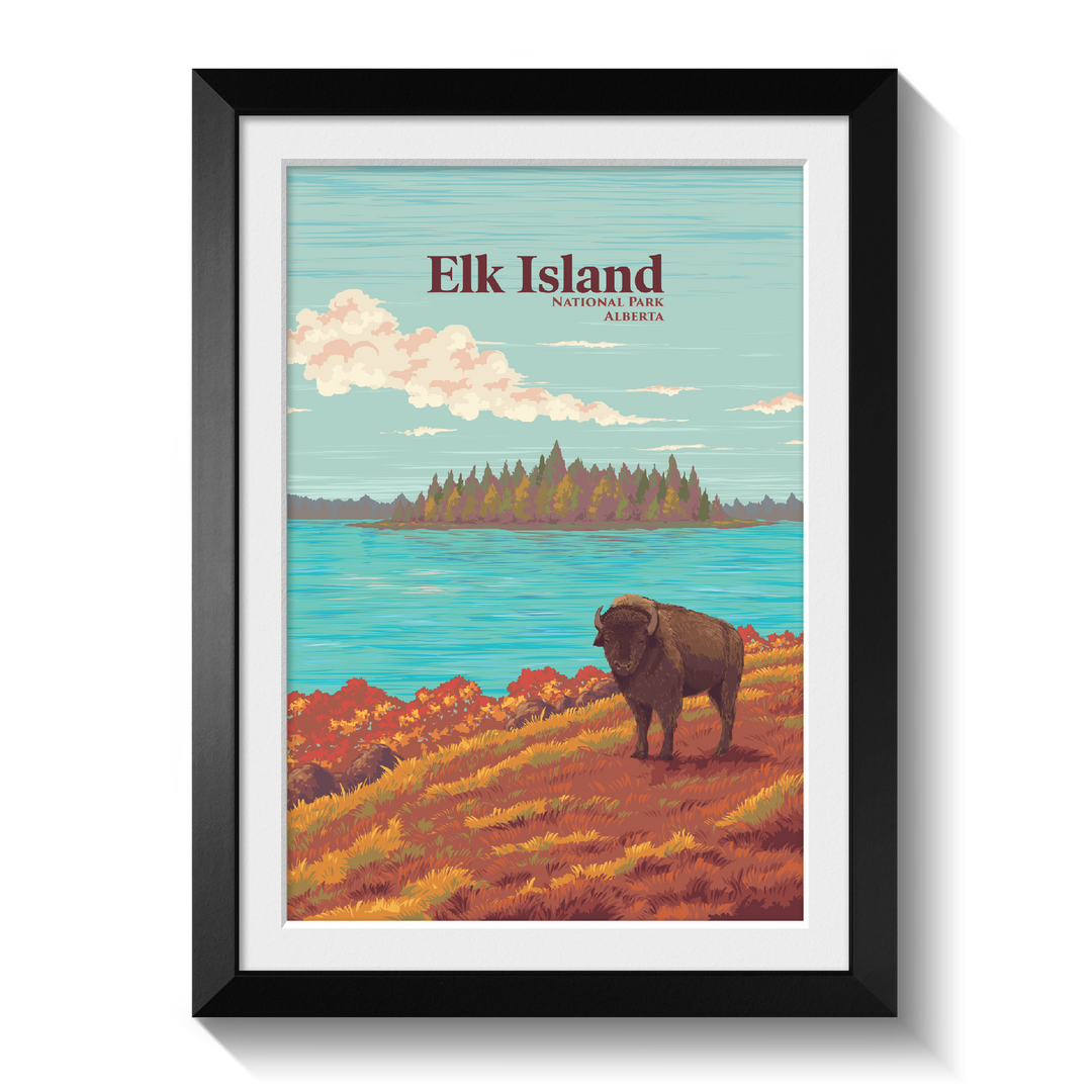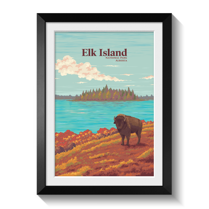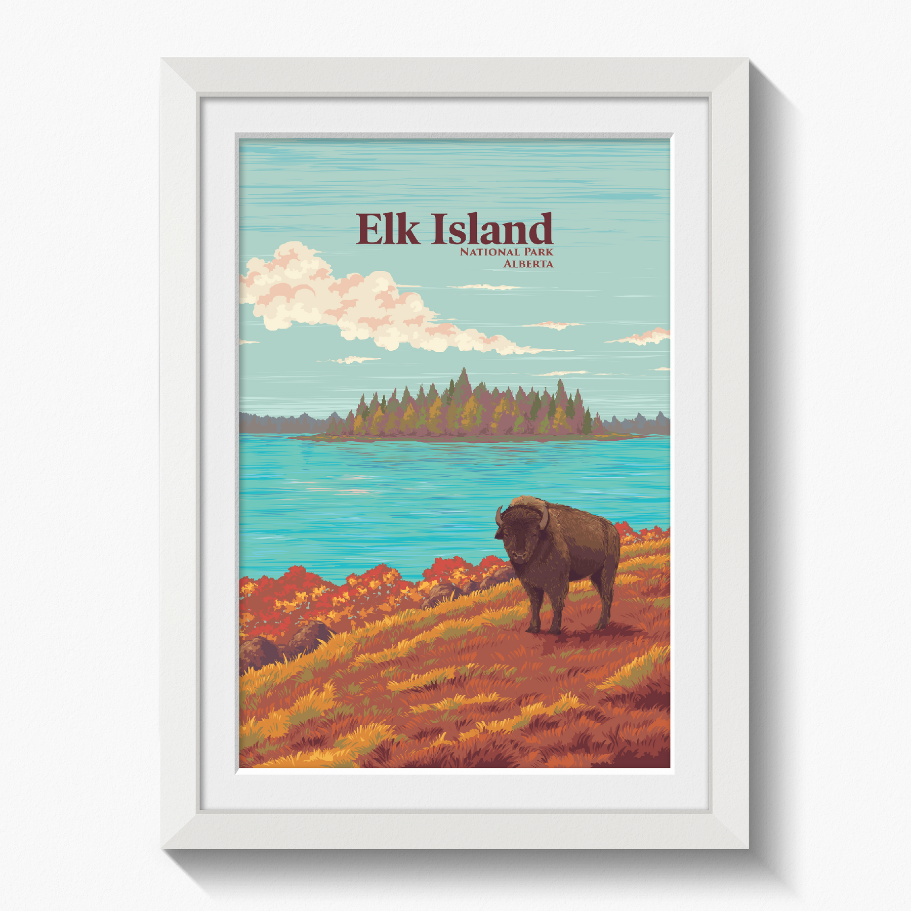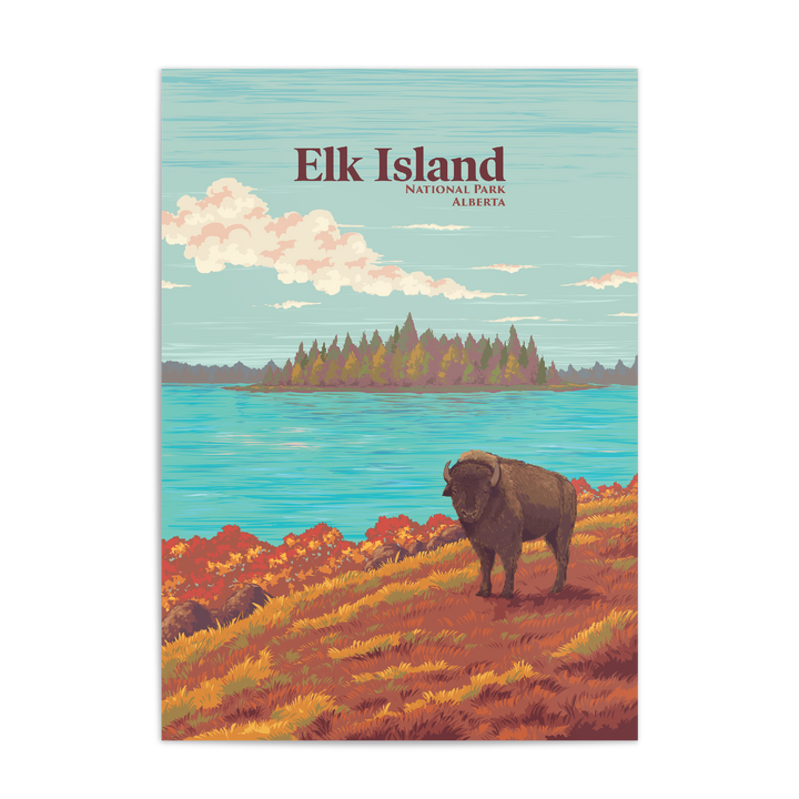 An original travel poster featuring Elk Island National Park in Alberta, Canada. This National Park has been important in the conservation of Plains Bison, one of which can be seen in this poster.