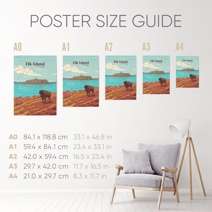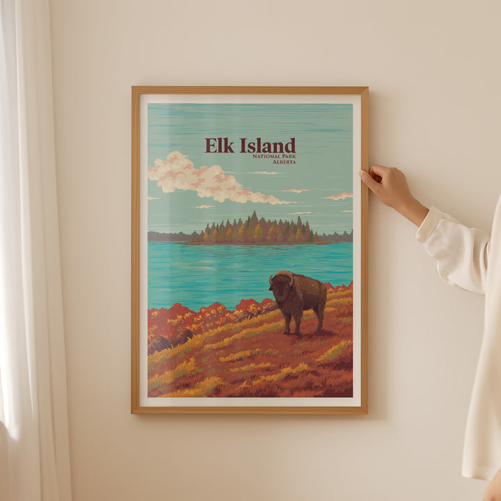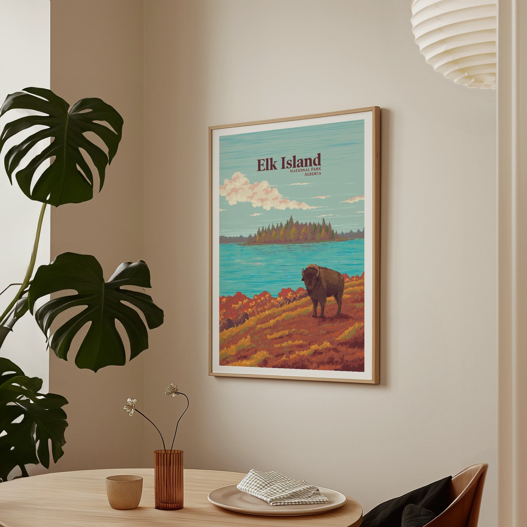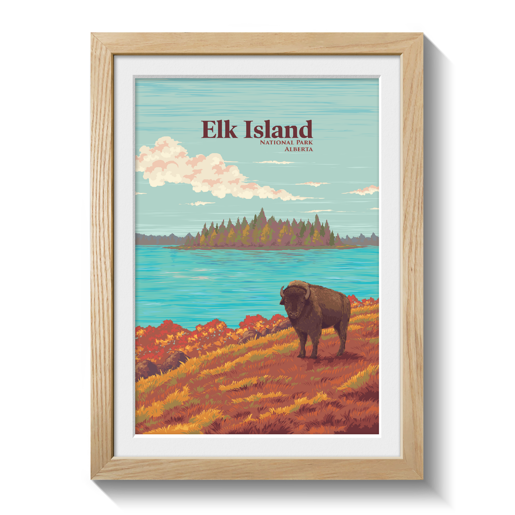 An original travel poster featuring Elk Island National Park in Alberta, Canada. This National Park has been important in the conservation of Plains Bison, one of which can be seen in this poster.