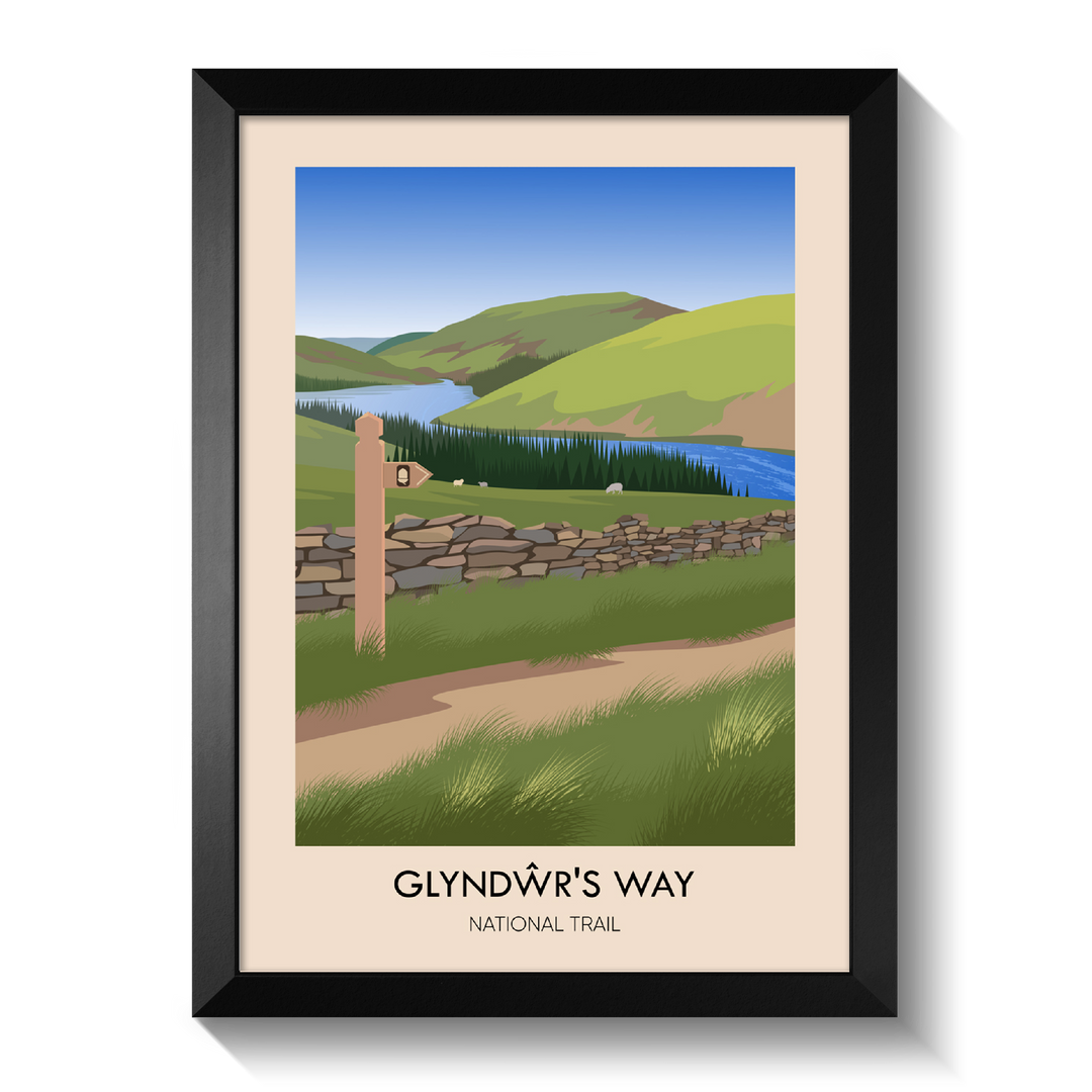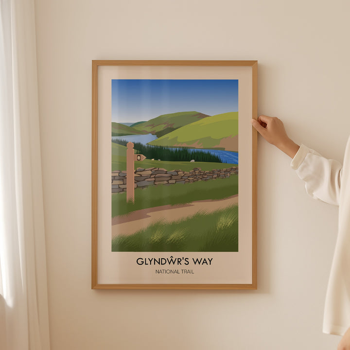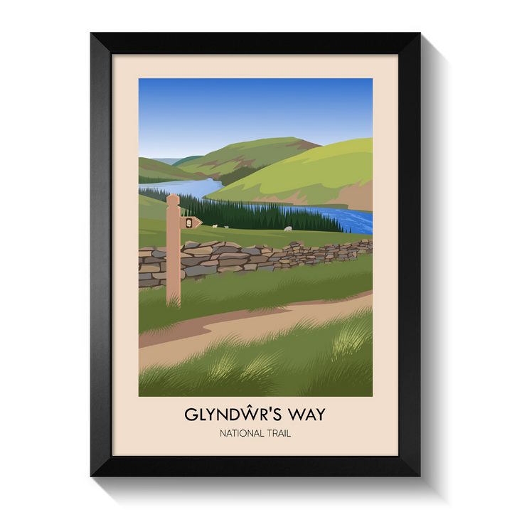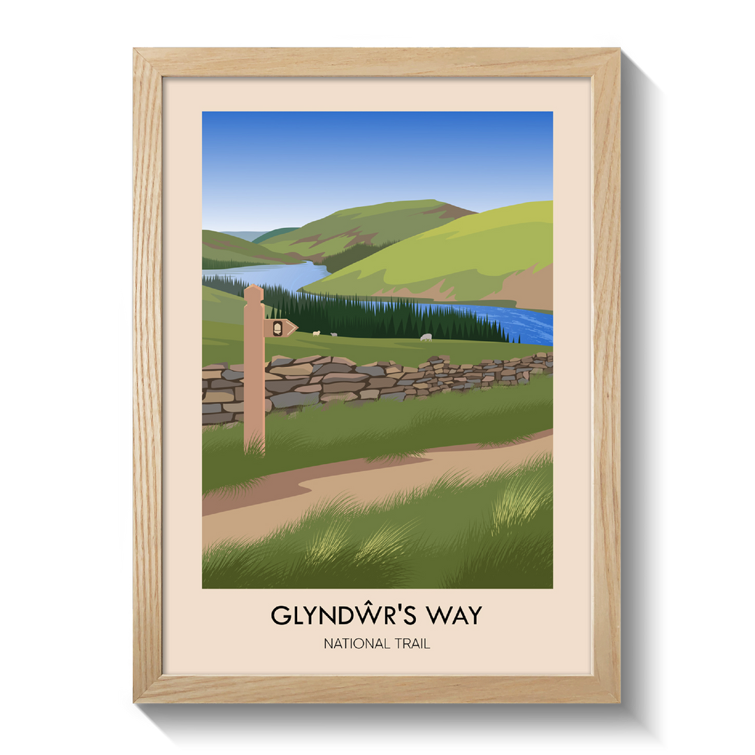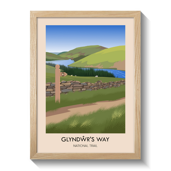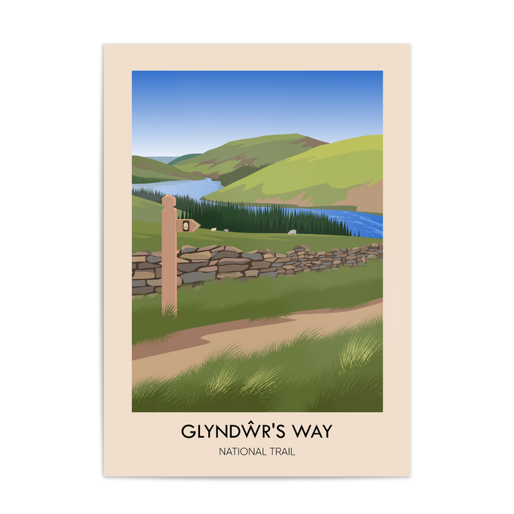 Glyndwr's Way National Trail travel poster featuring a picturesque scene from the Welsh National Trail that stretches 135 miles from Knighton to Welshpool via Machynlleth.