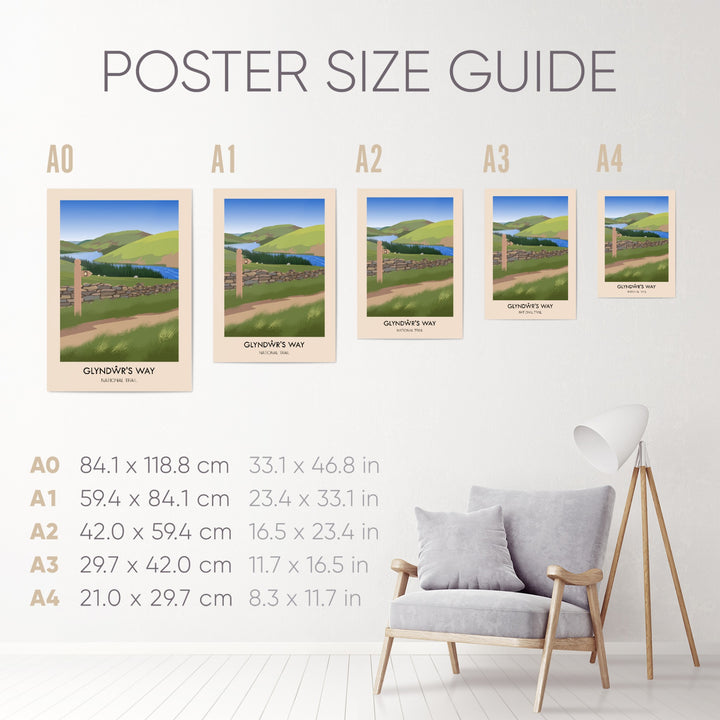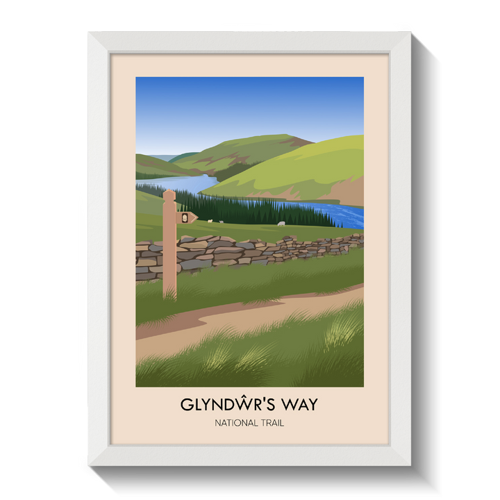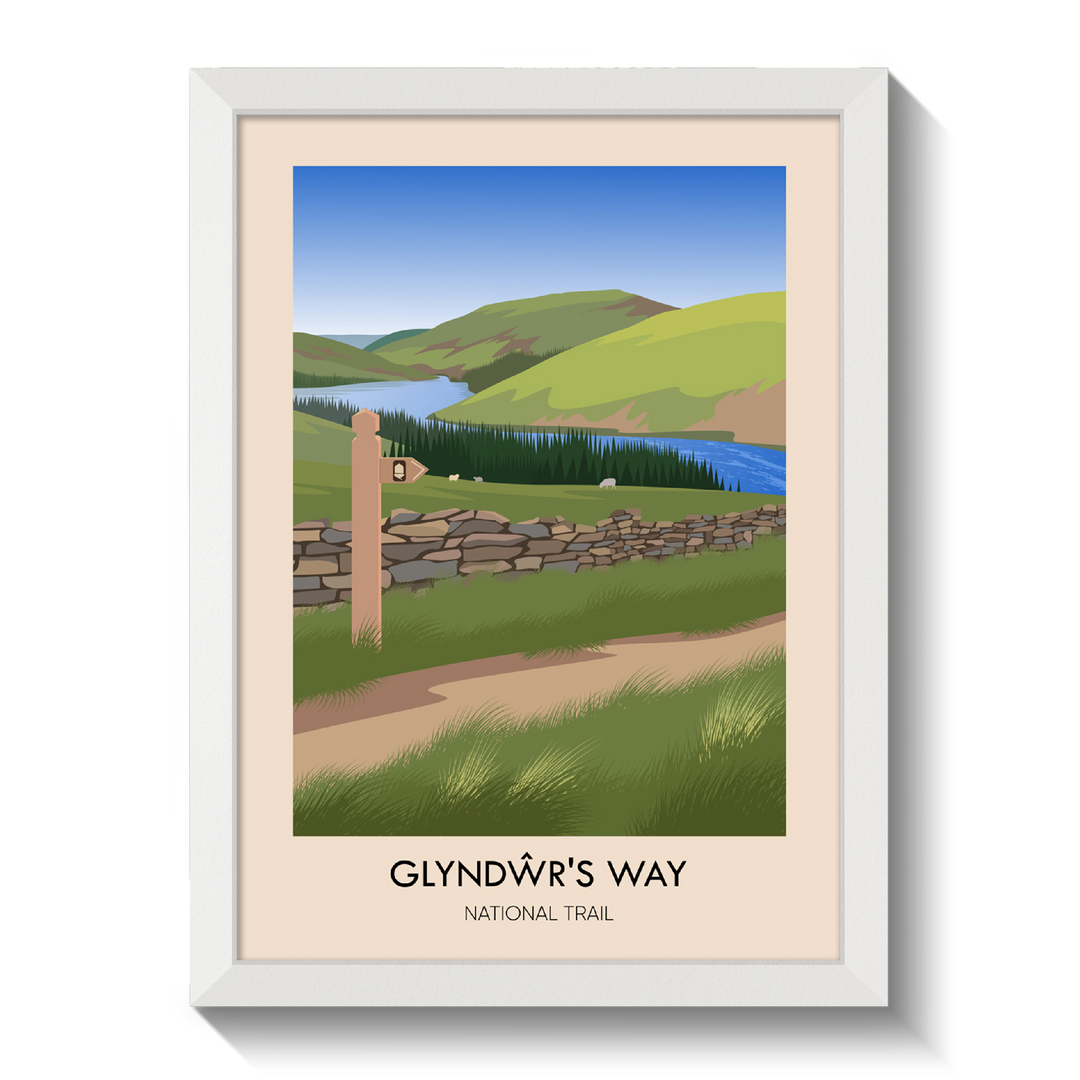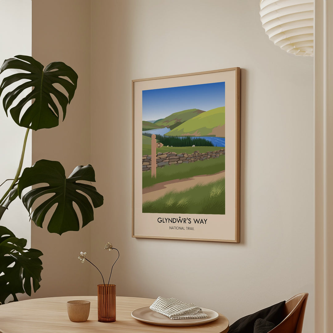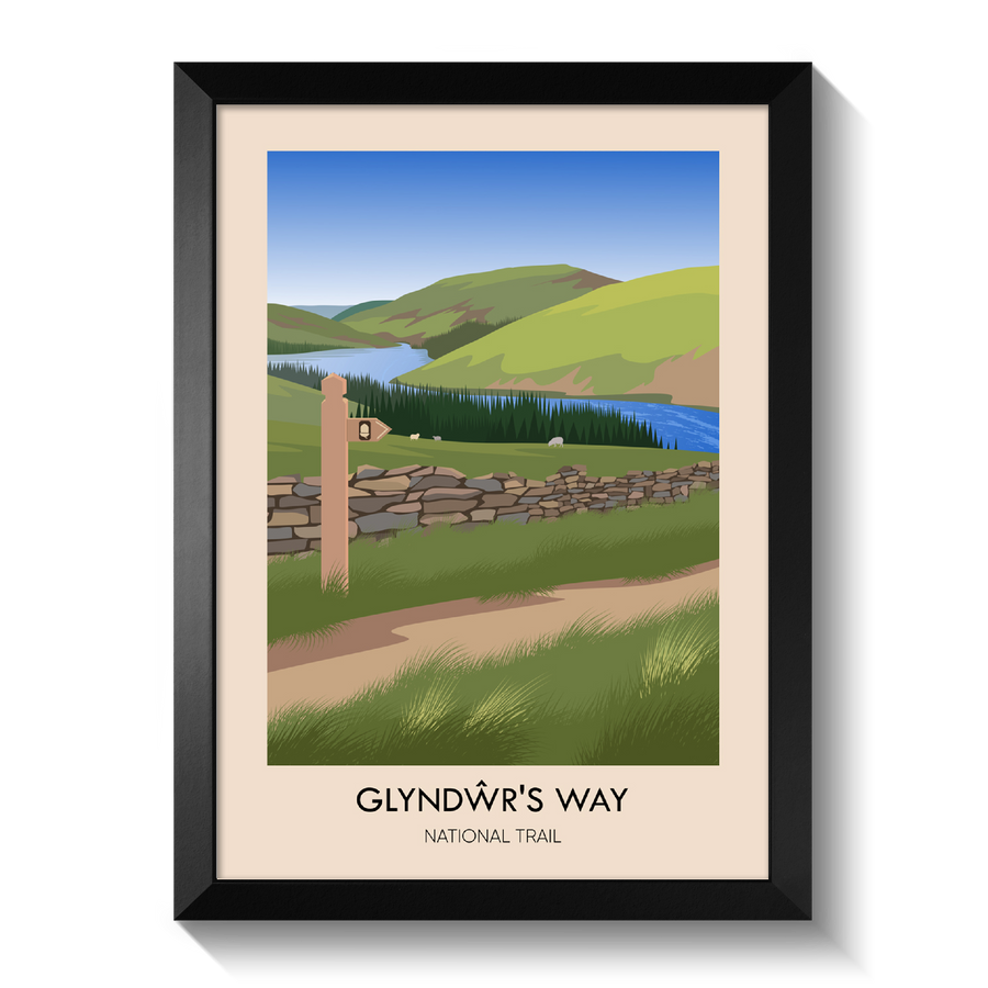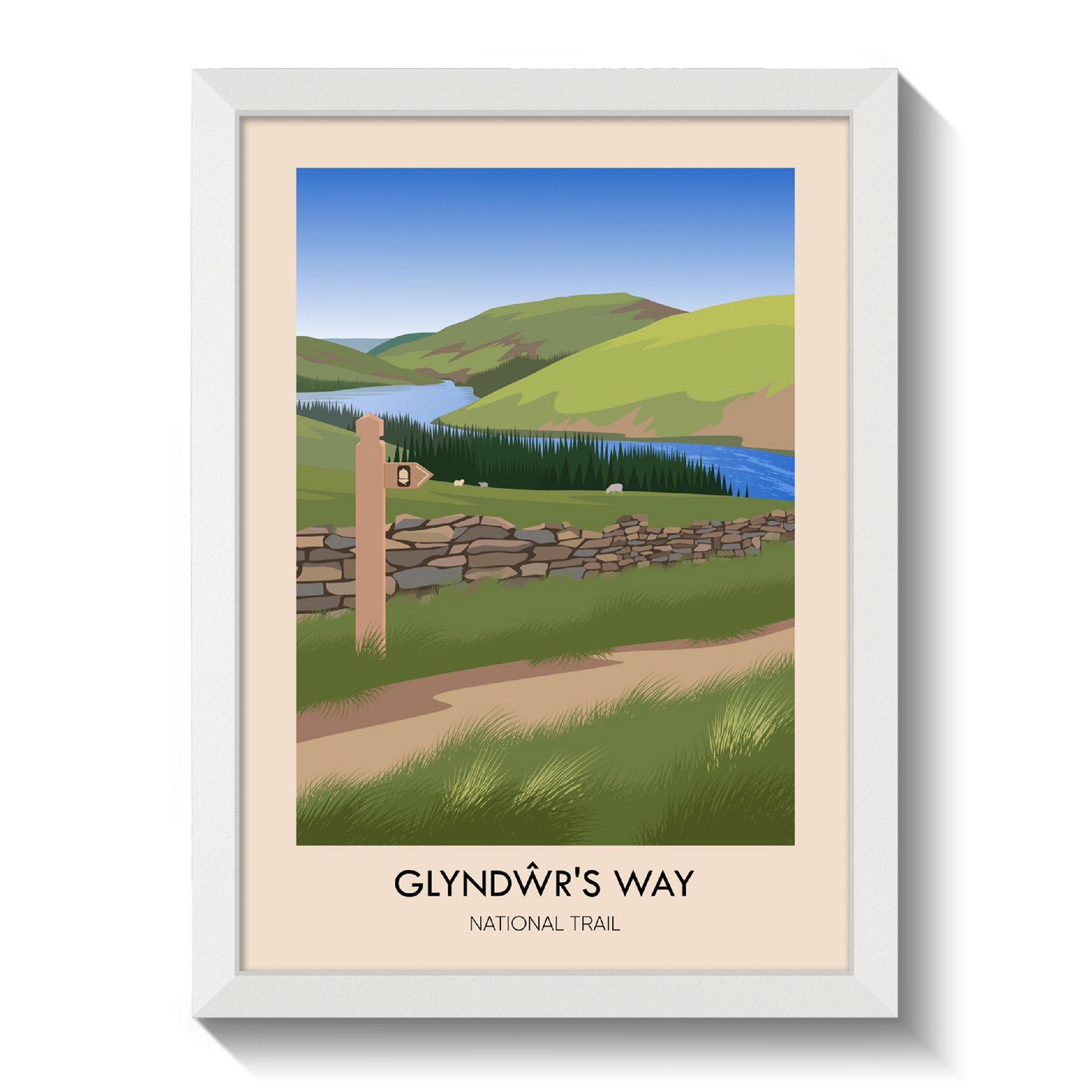 Glyndwr's Way National Trail travel poster featuring a picturesque scene from the Welsh National Trail that stretches 135 miles from Knighton to Welshpool via Machynlleth.