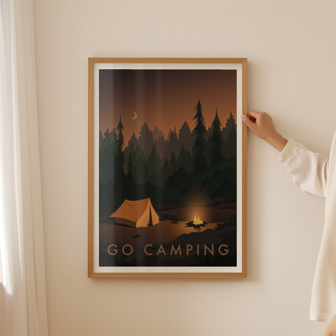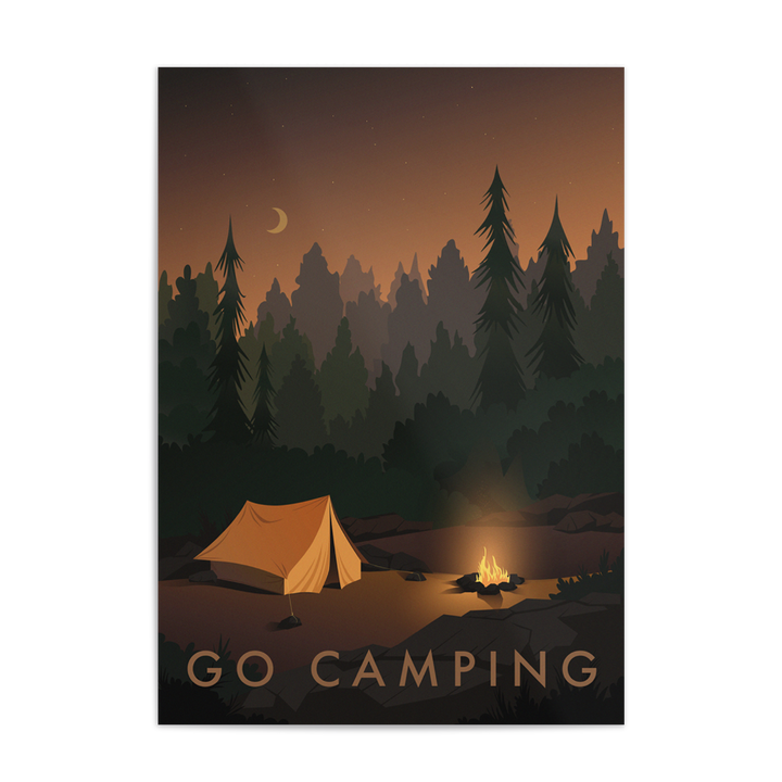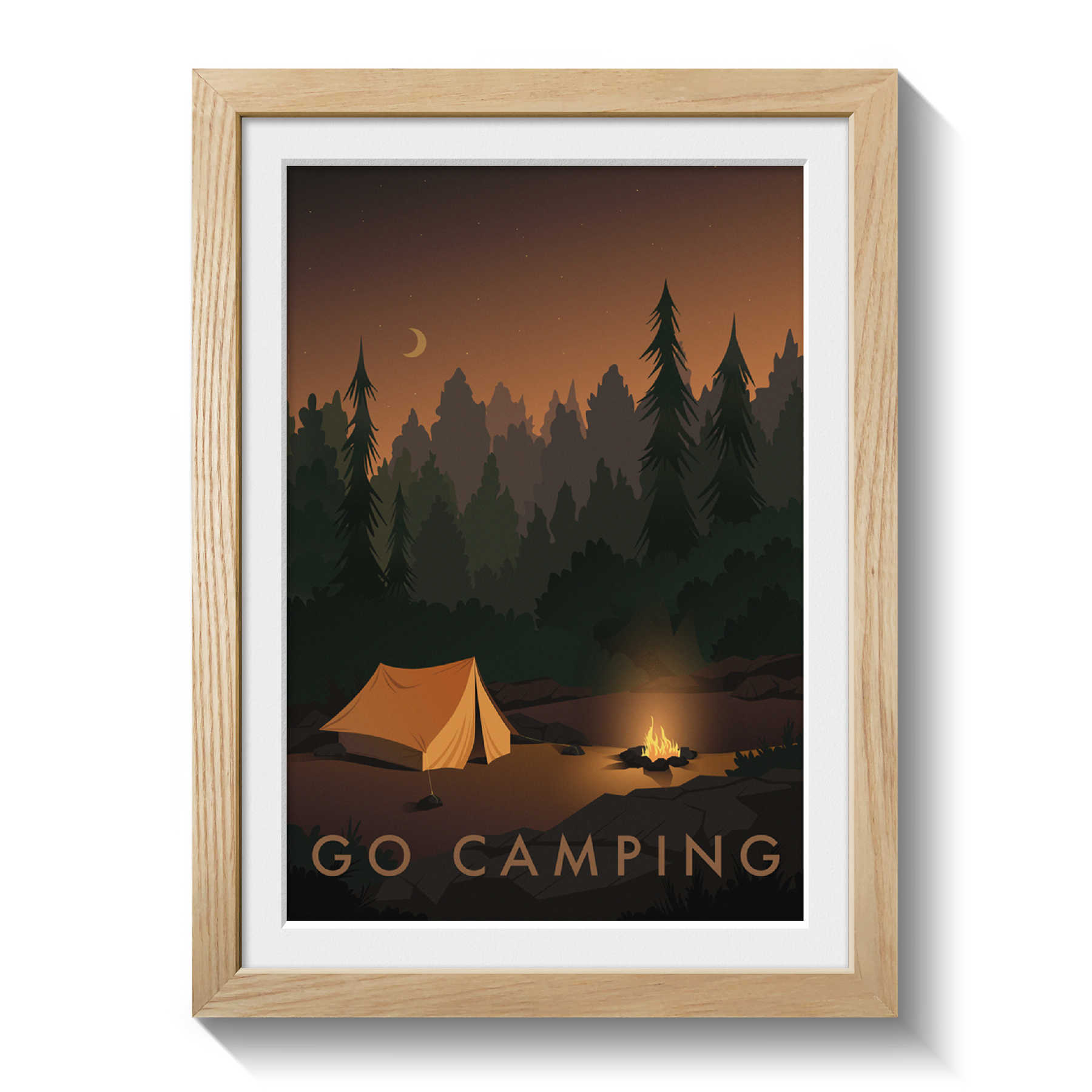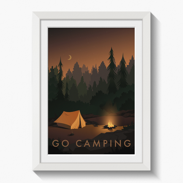 This is an original travel poster celebrating the popular outdoor hobby of Camping. A perfect gift for the adventurous wild camper in your life or a great way to celebrate your love of your favourite adventurous pursuit.