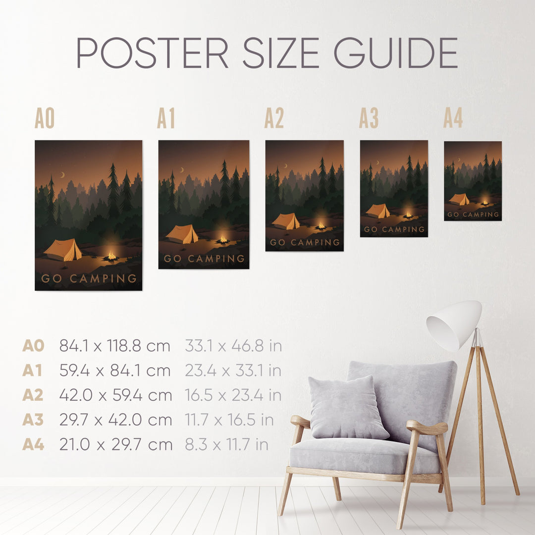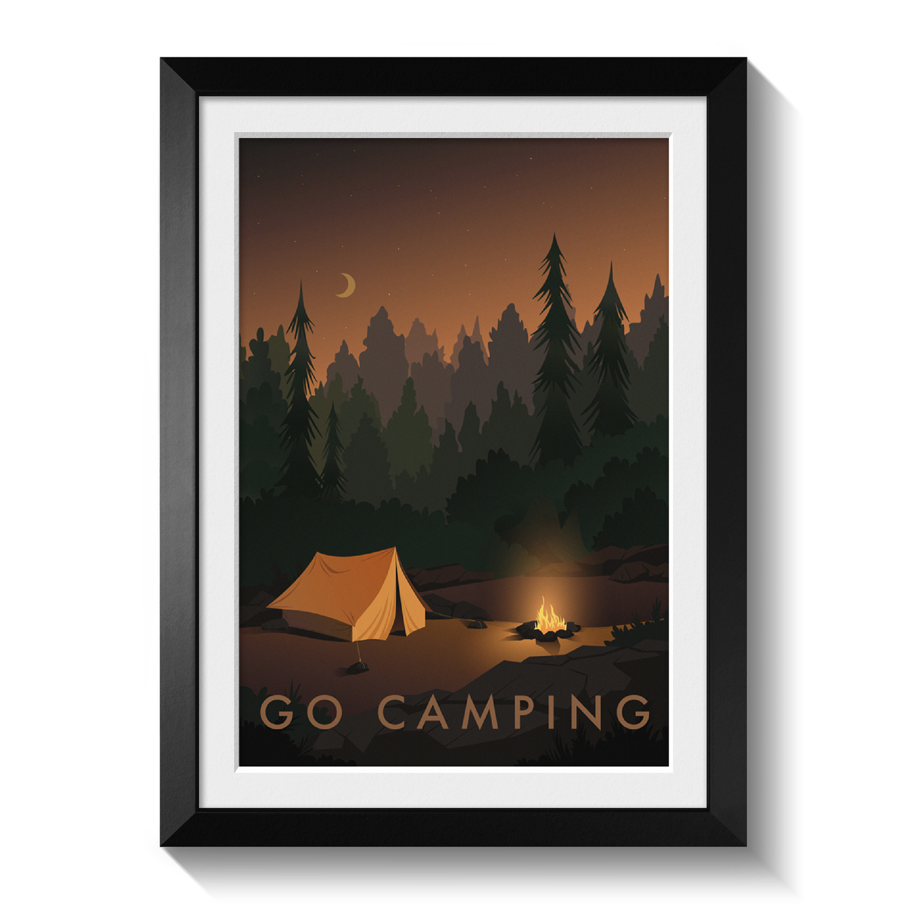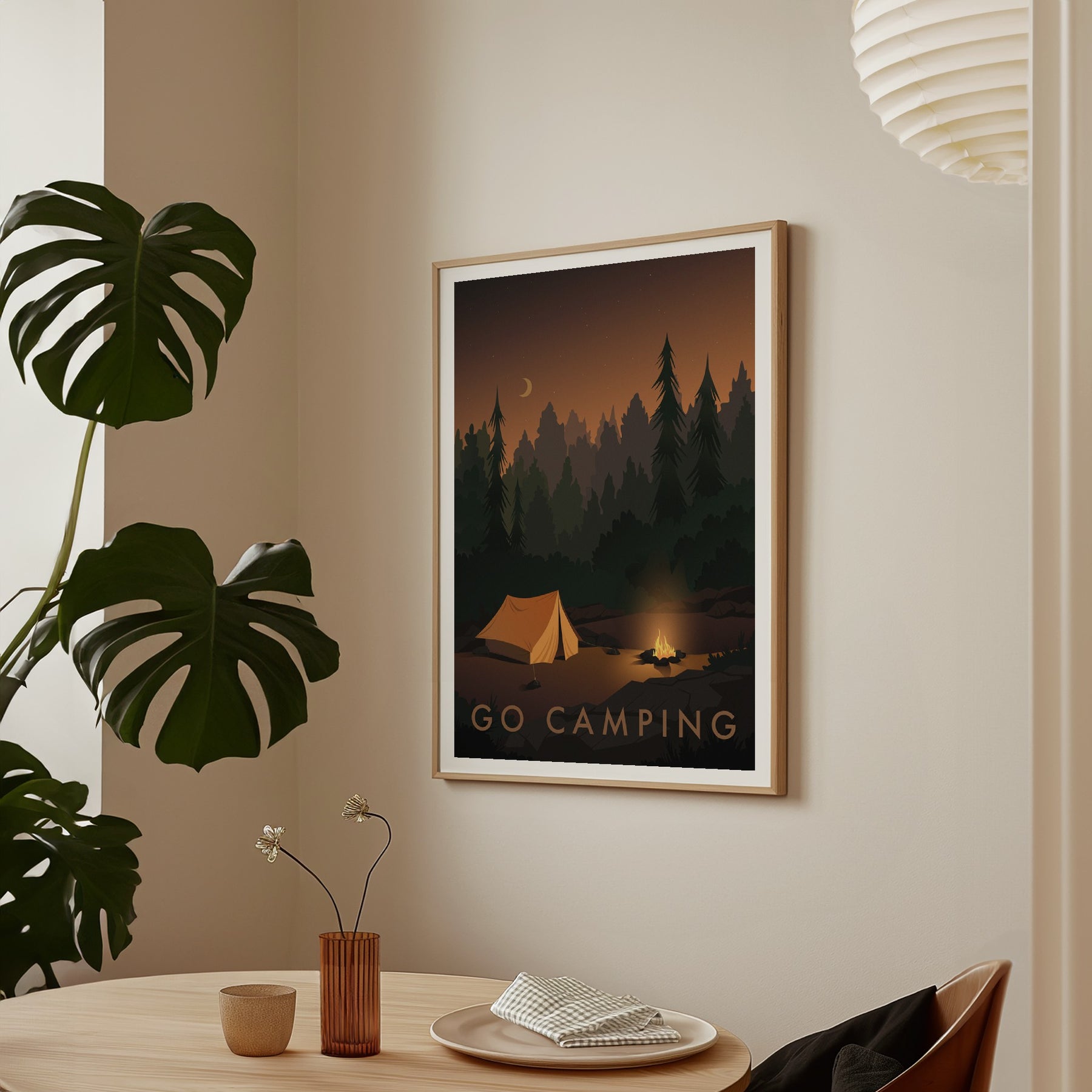 This is an original travel poster celebrating the popular outdoor hobby of Camping. A perfect gift for the adventurous wild camper in your life or a great way to celebrate your love of your favourite adventurous pursuit.