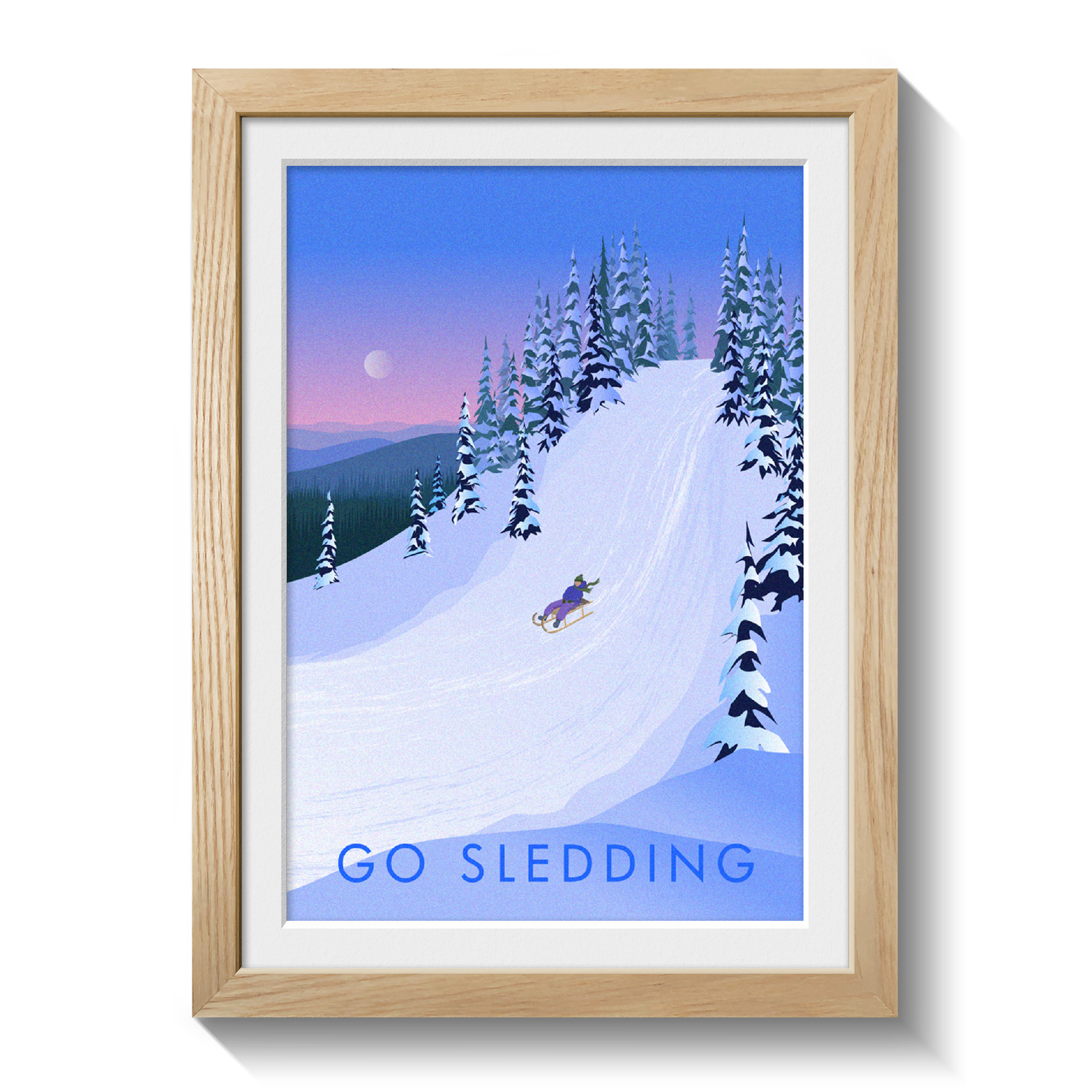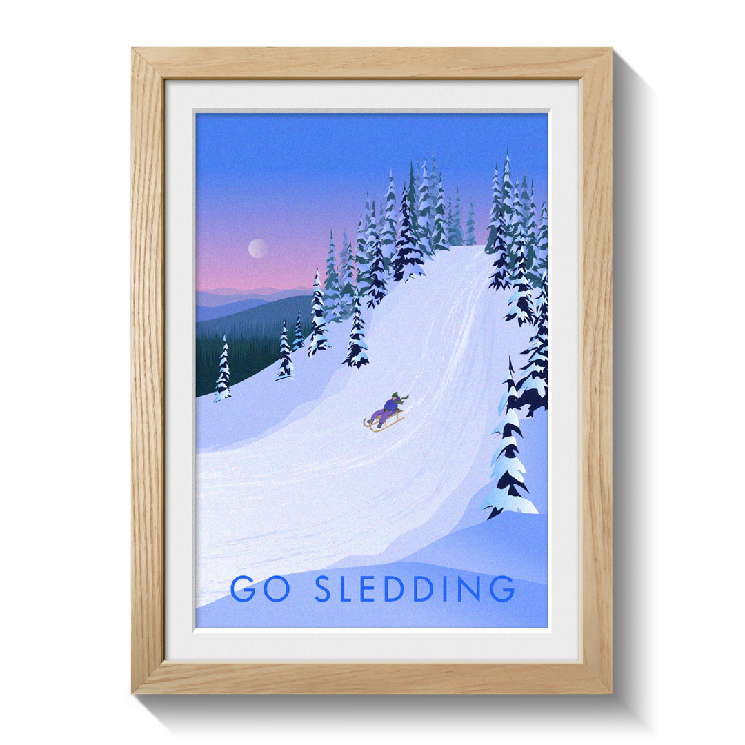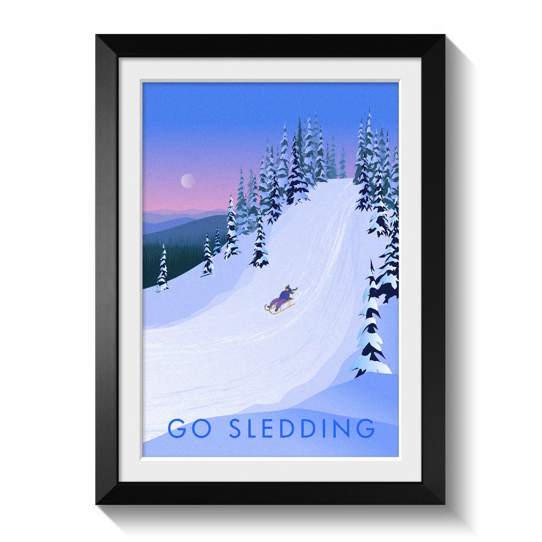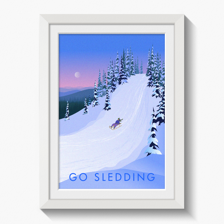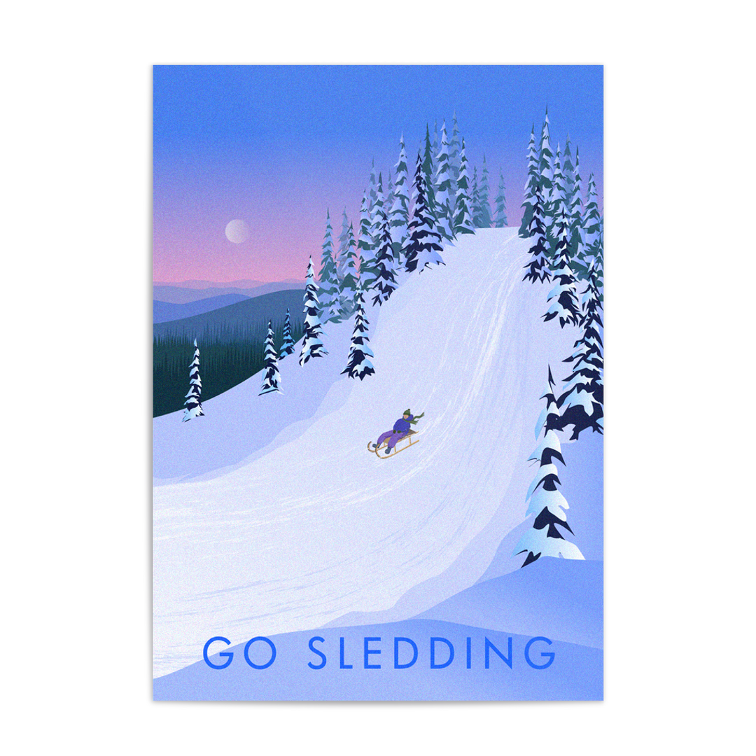 This is an original travel poster celebrating the joy of sledging. What better way to spend a winter snow day than grabbing a sled and throwing yourself down the nearest big hill!?