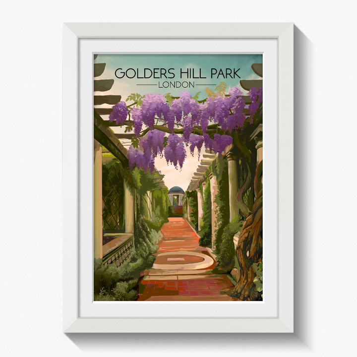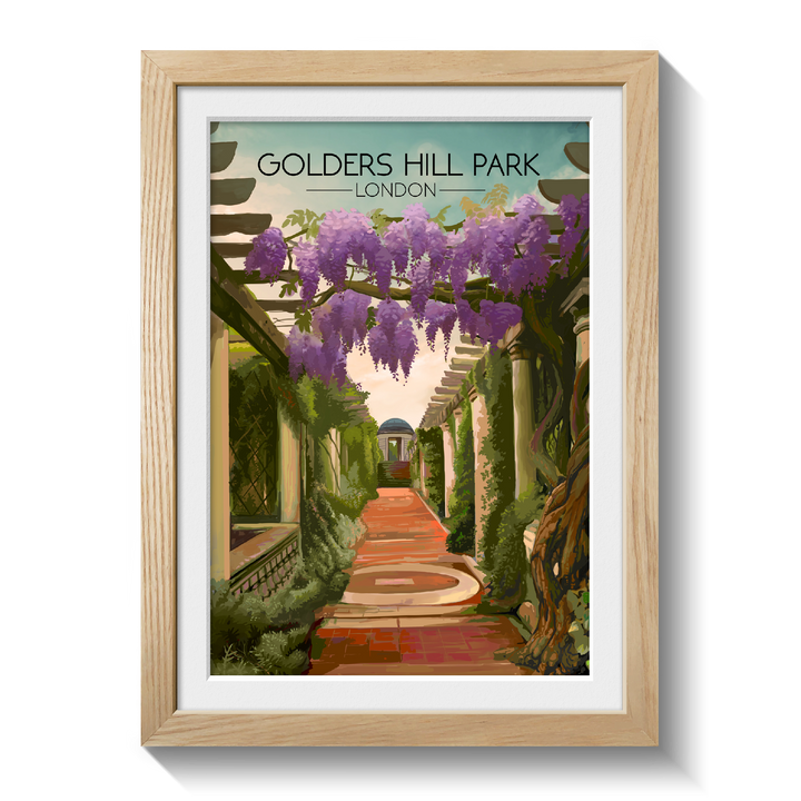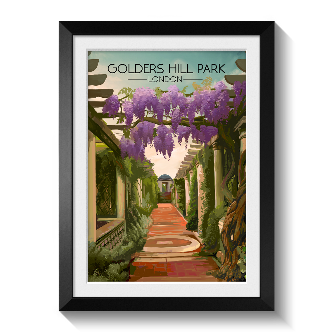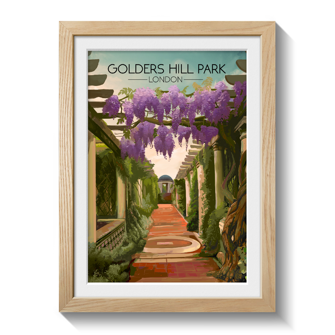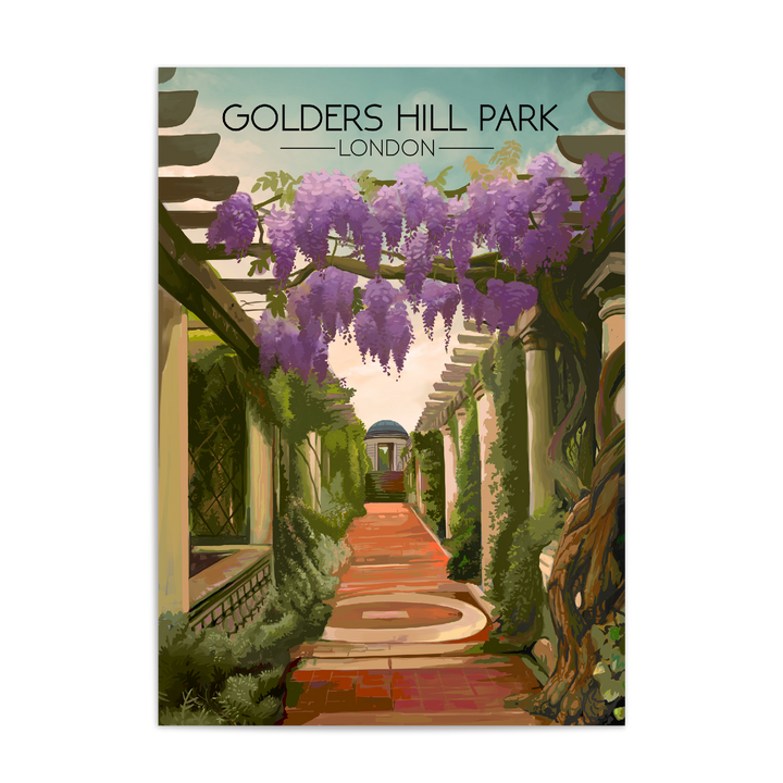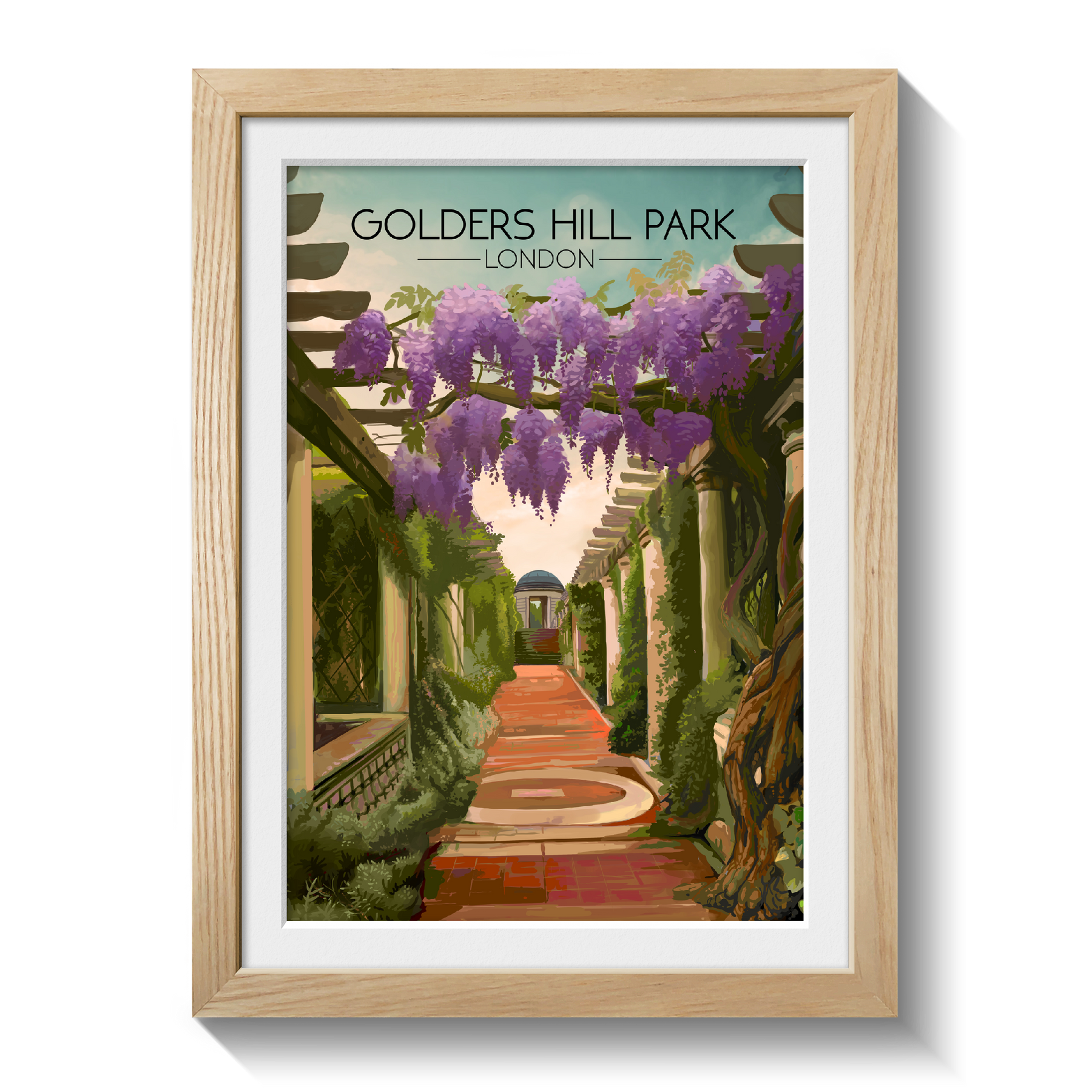 An original travel poster print featuring the Pergola at Golders Hill Park, Golders Green, Northwest London. Golders Hill Park is adjacent to Hampstead Heath and is home to tennis courts, a butterfly house and a mini zoo.