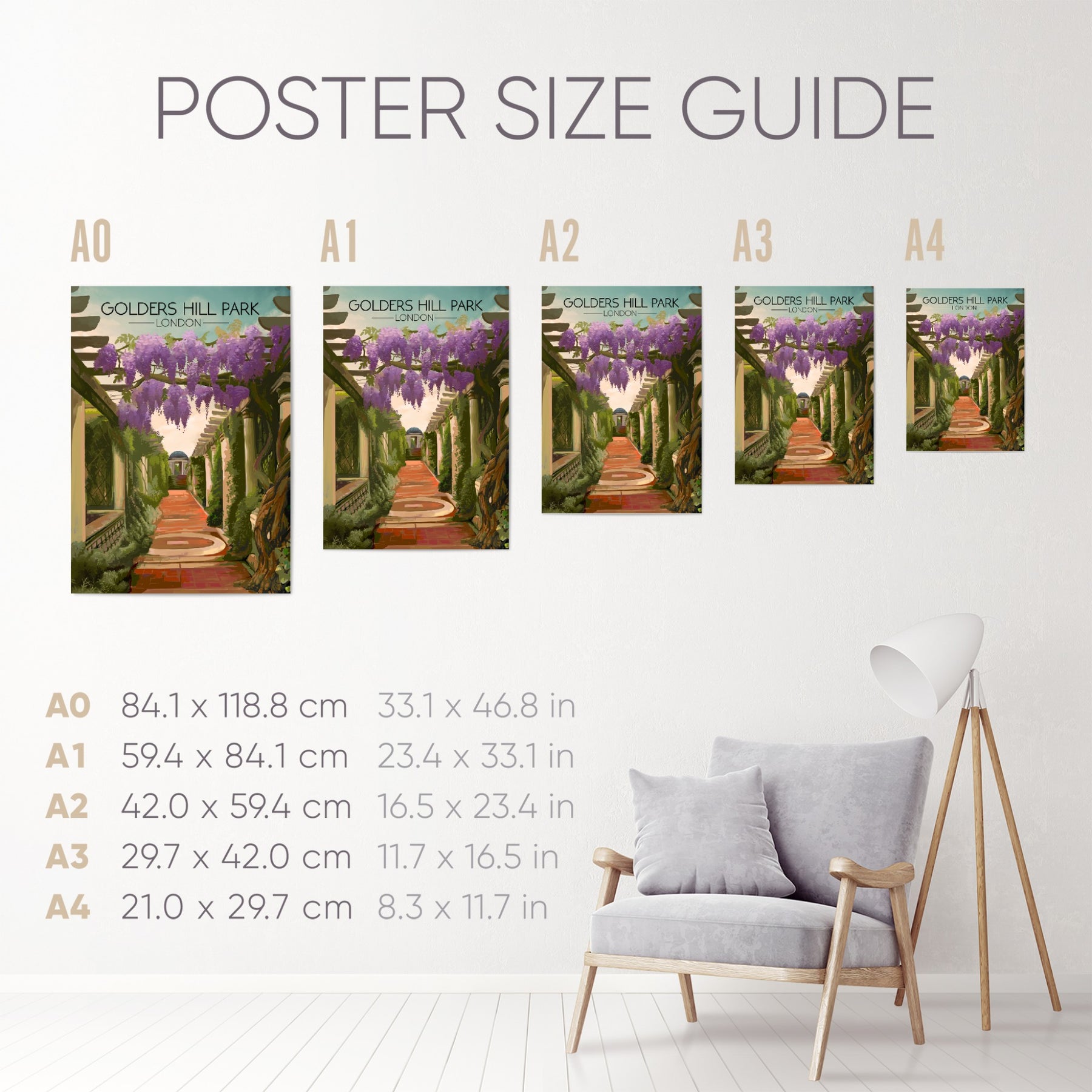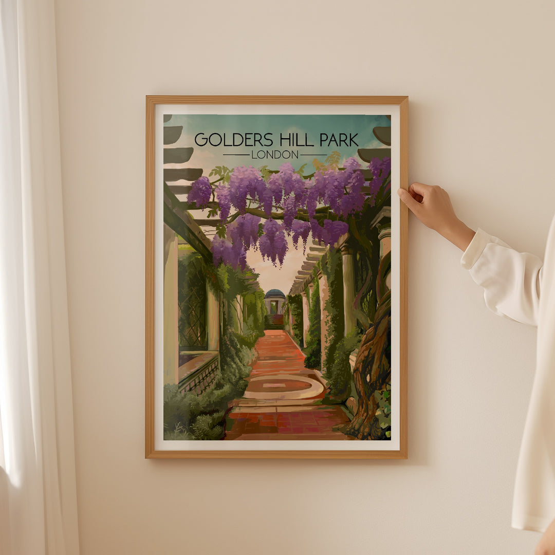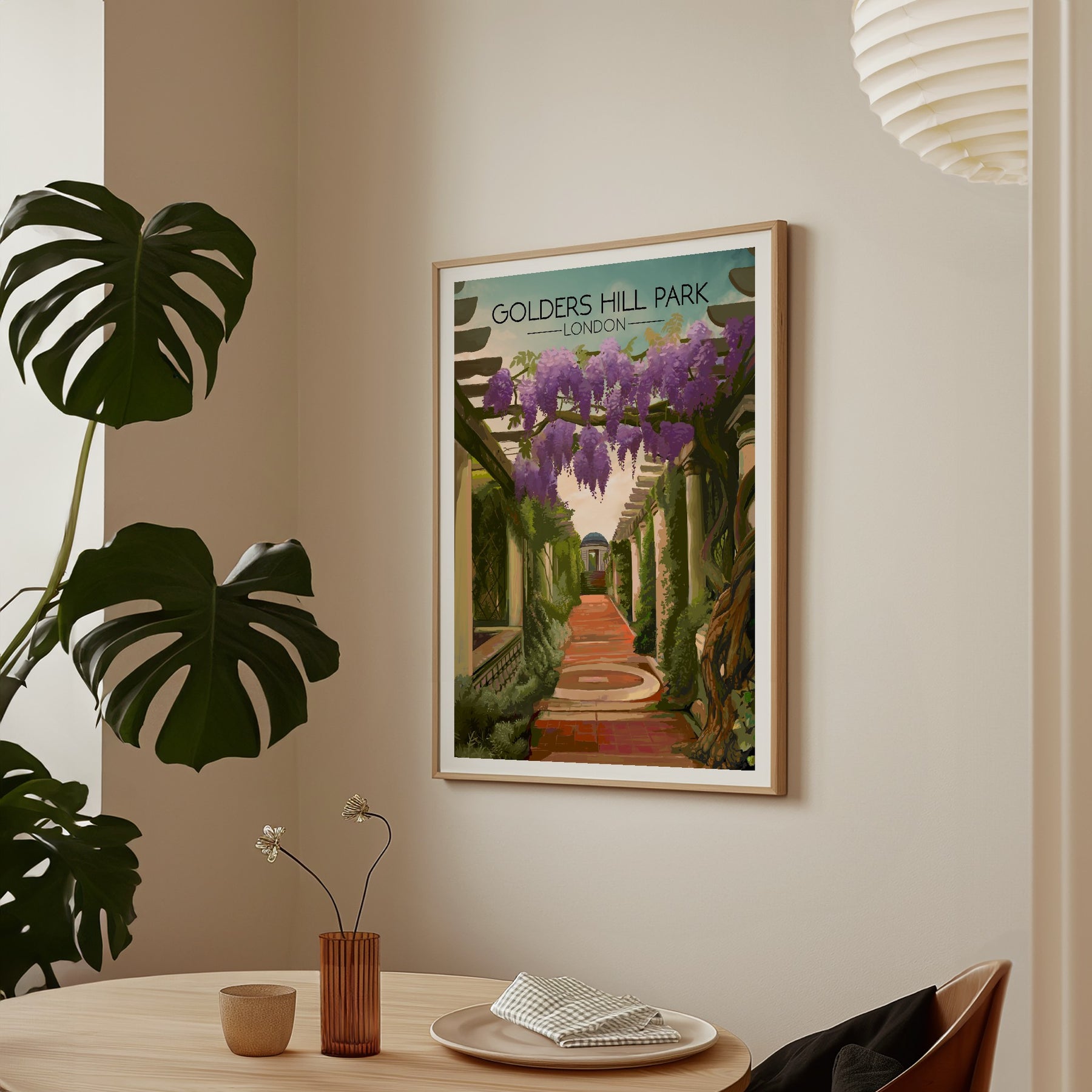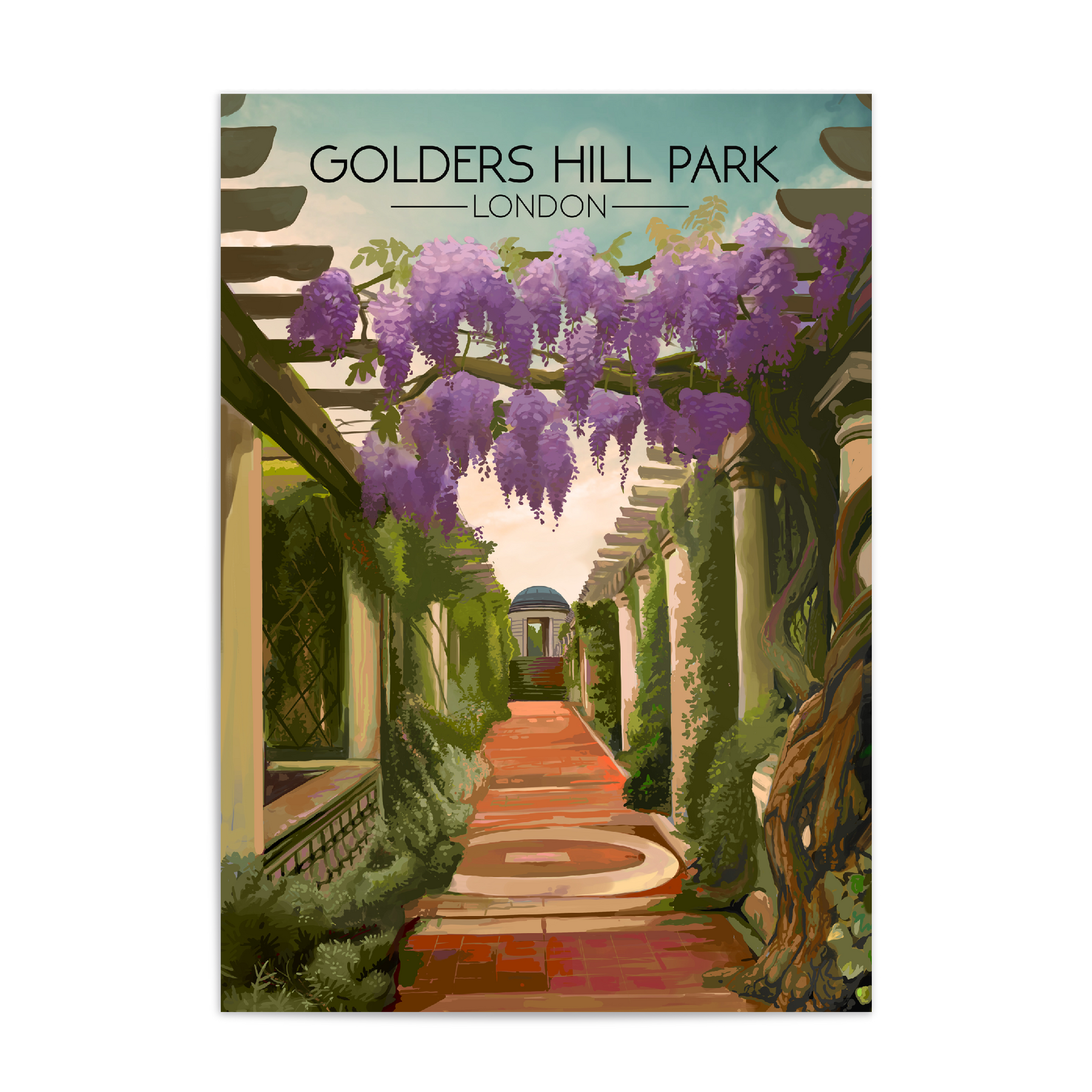 An original travel poster print featuring the Pergola at Golders Hill Park, Golders Green, Northwest London. Golders Hill Park is adjacent to Hampstead Heath and is home to tennis courts, a butterfly house and a mini zoo.