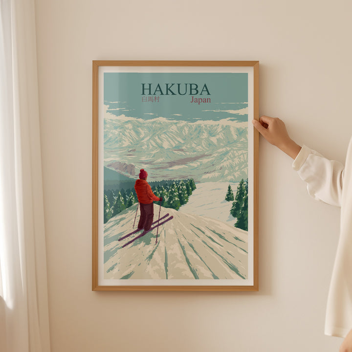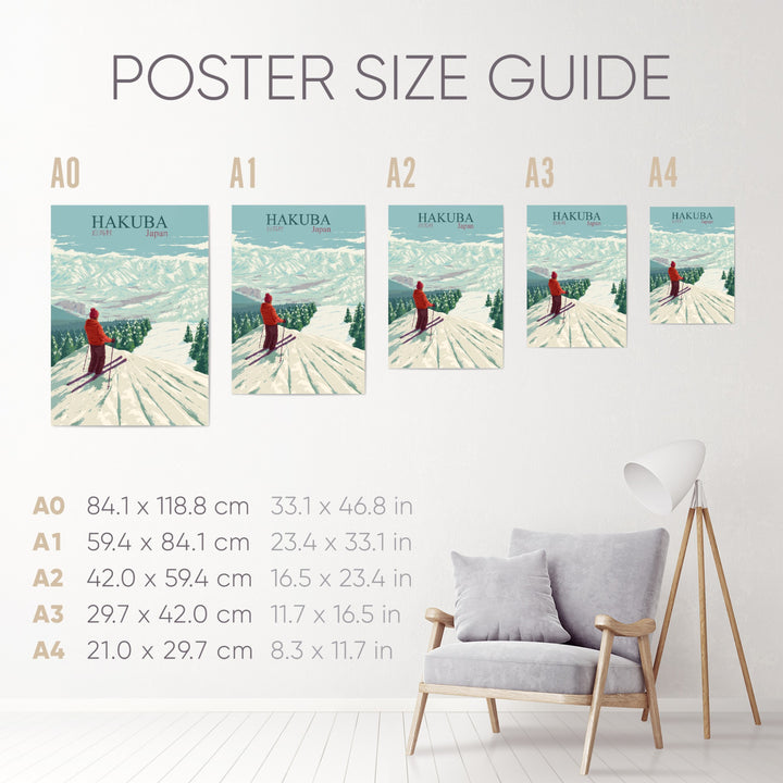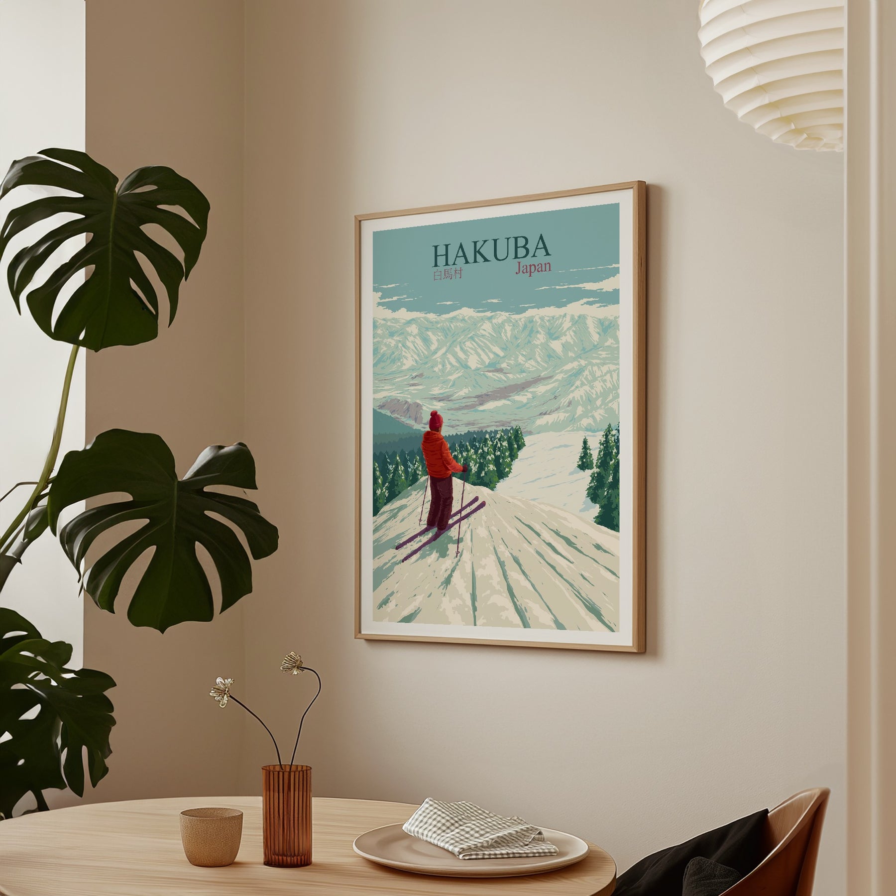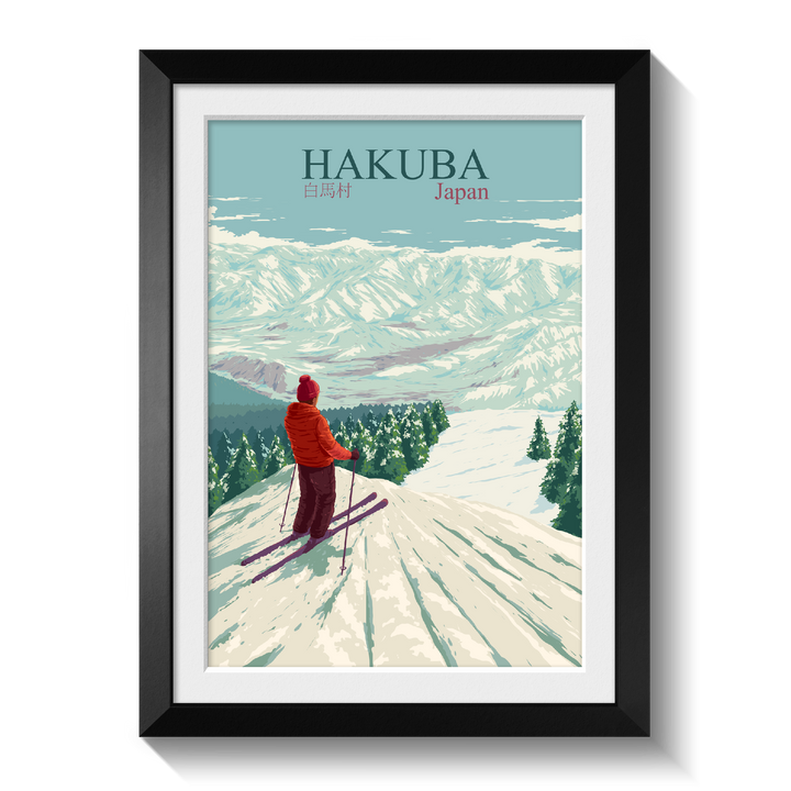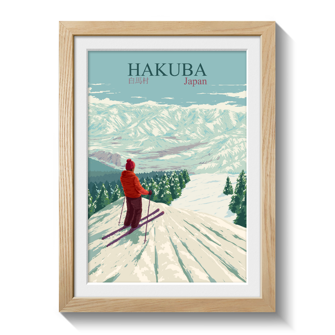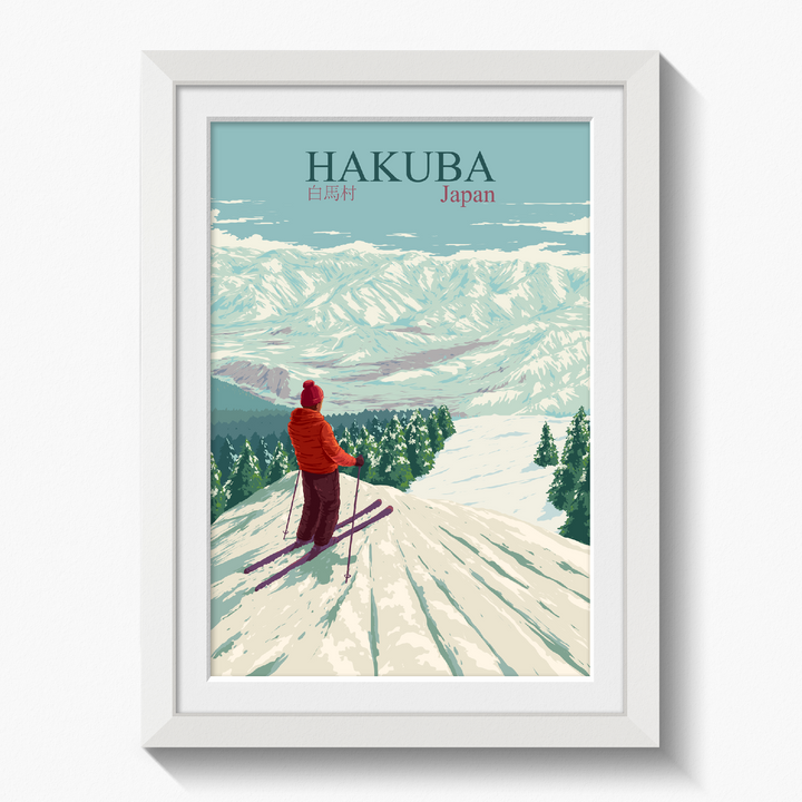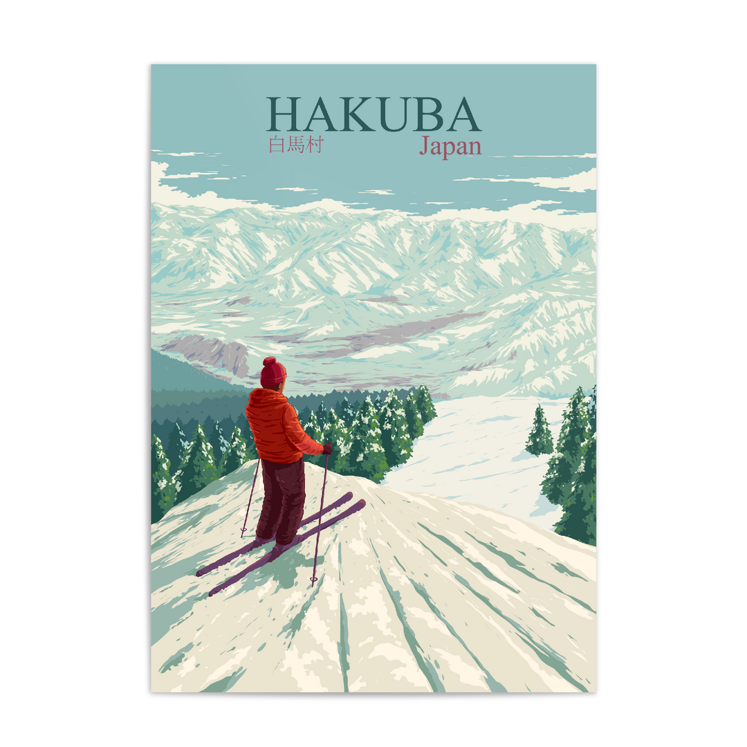 This is an original travel poster featuring the ski resort of Hakuba in the Japanese Alps. Hakuba was the host of the 1998 Winter Olympics and remains one of the most popular skiing and snowboarding destinations in Japan.