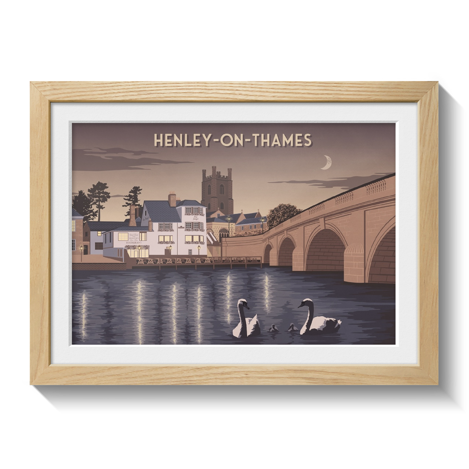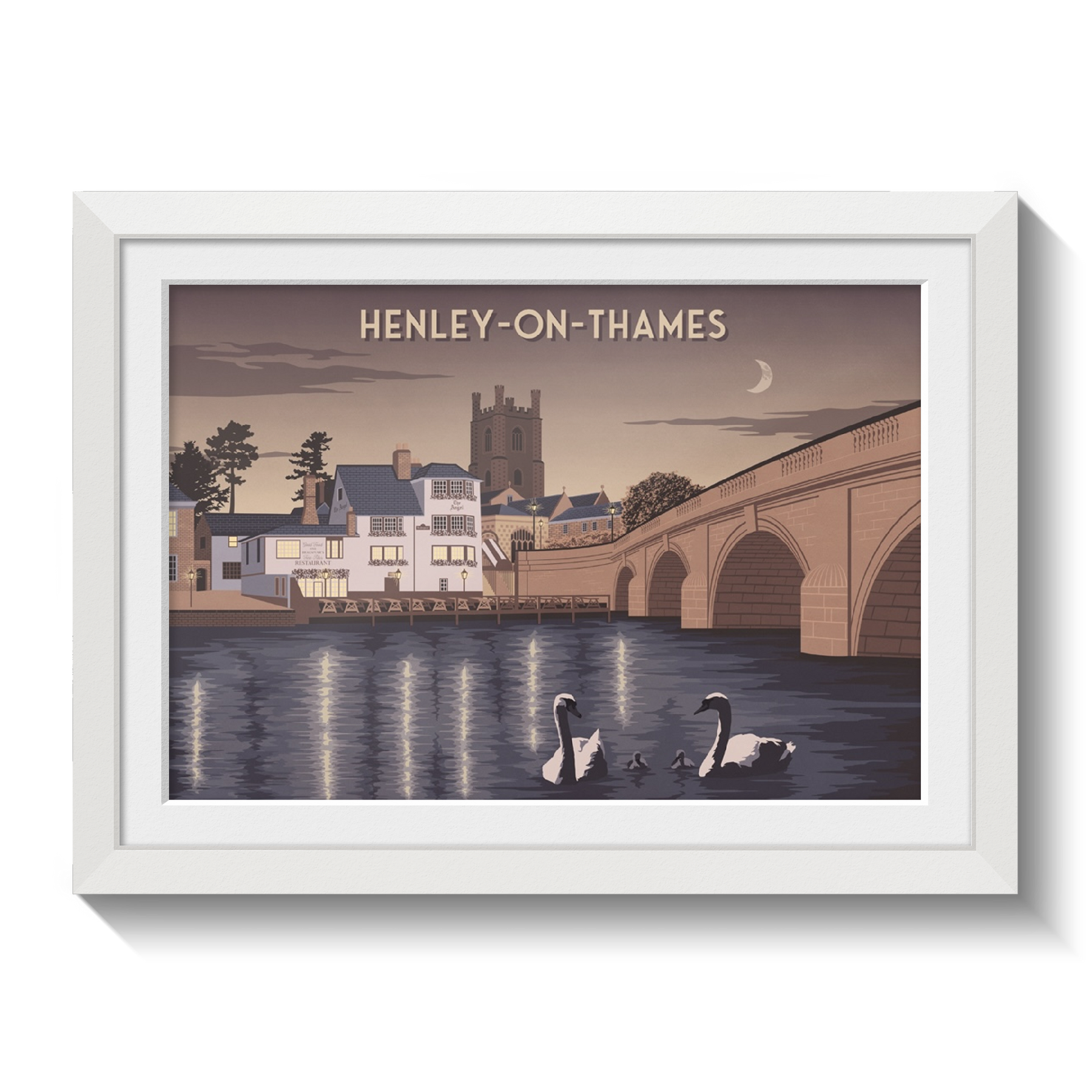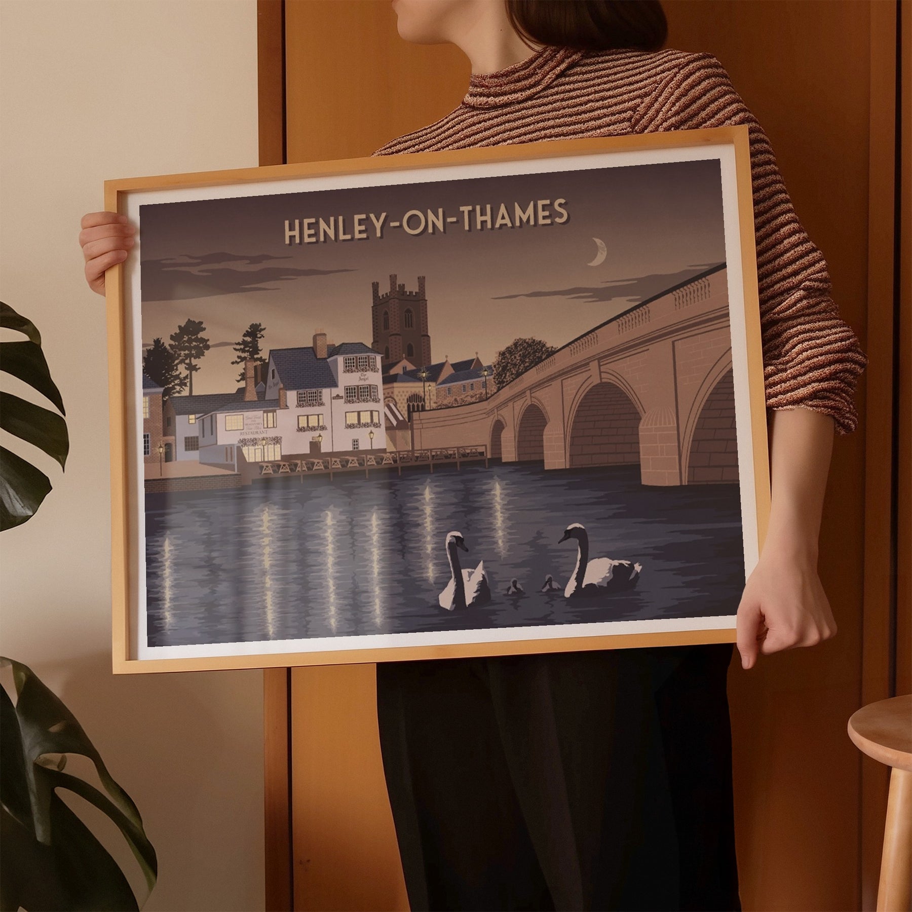 An original travel poster featuring Henley on Thames in Oxfordshire, England home to the famous annual rowing race , the Henley Royal Regatta.