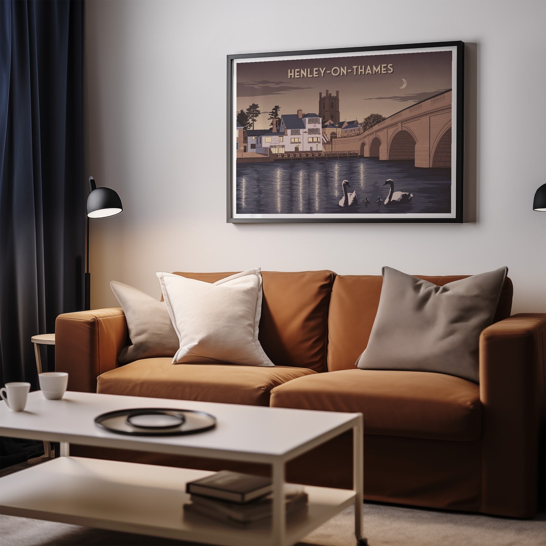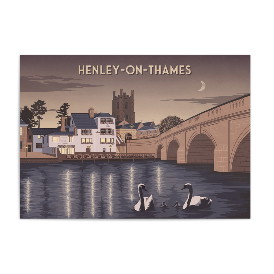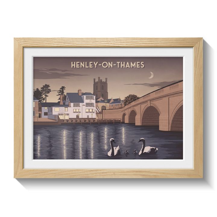 An original travel poster featuring Henley on Thames in Oxfordshire, England home to the famous annual rowing race , the Henley Royal Regatta.