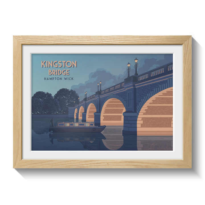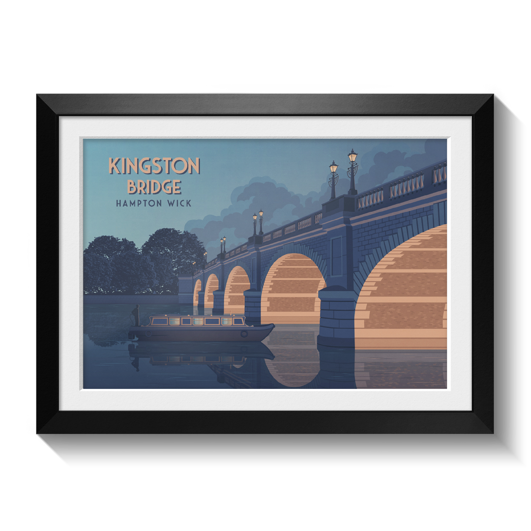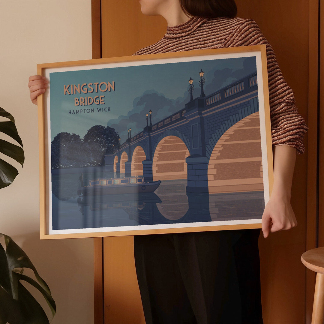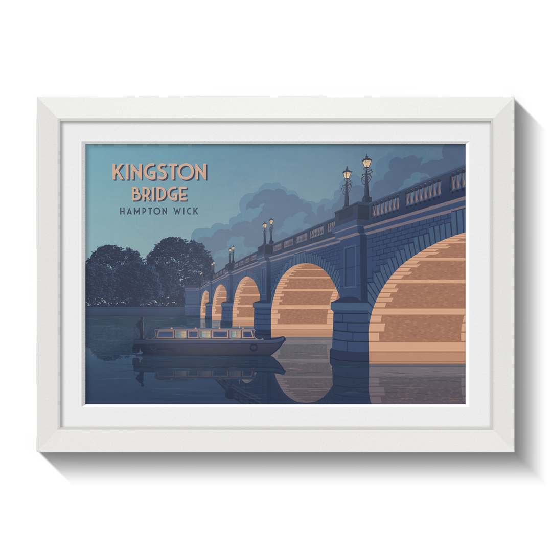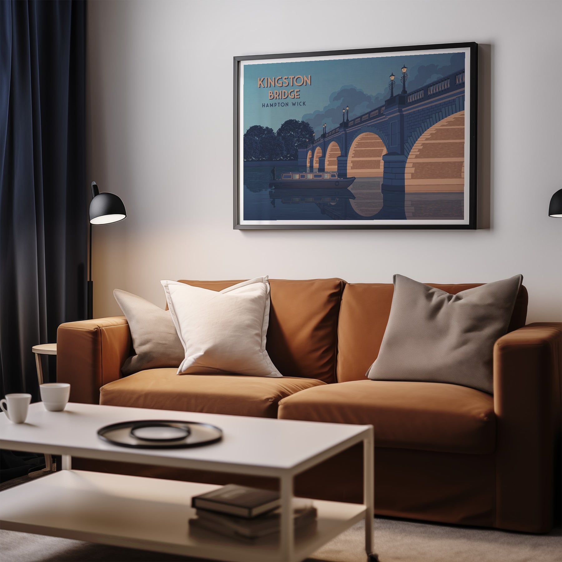 This vintage style travel poster features London's Kingston Bridge which spans the River Thames at Kingston upon Thames.