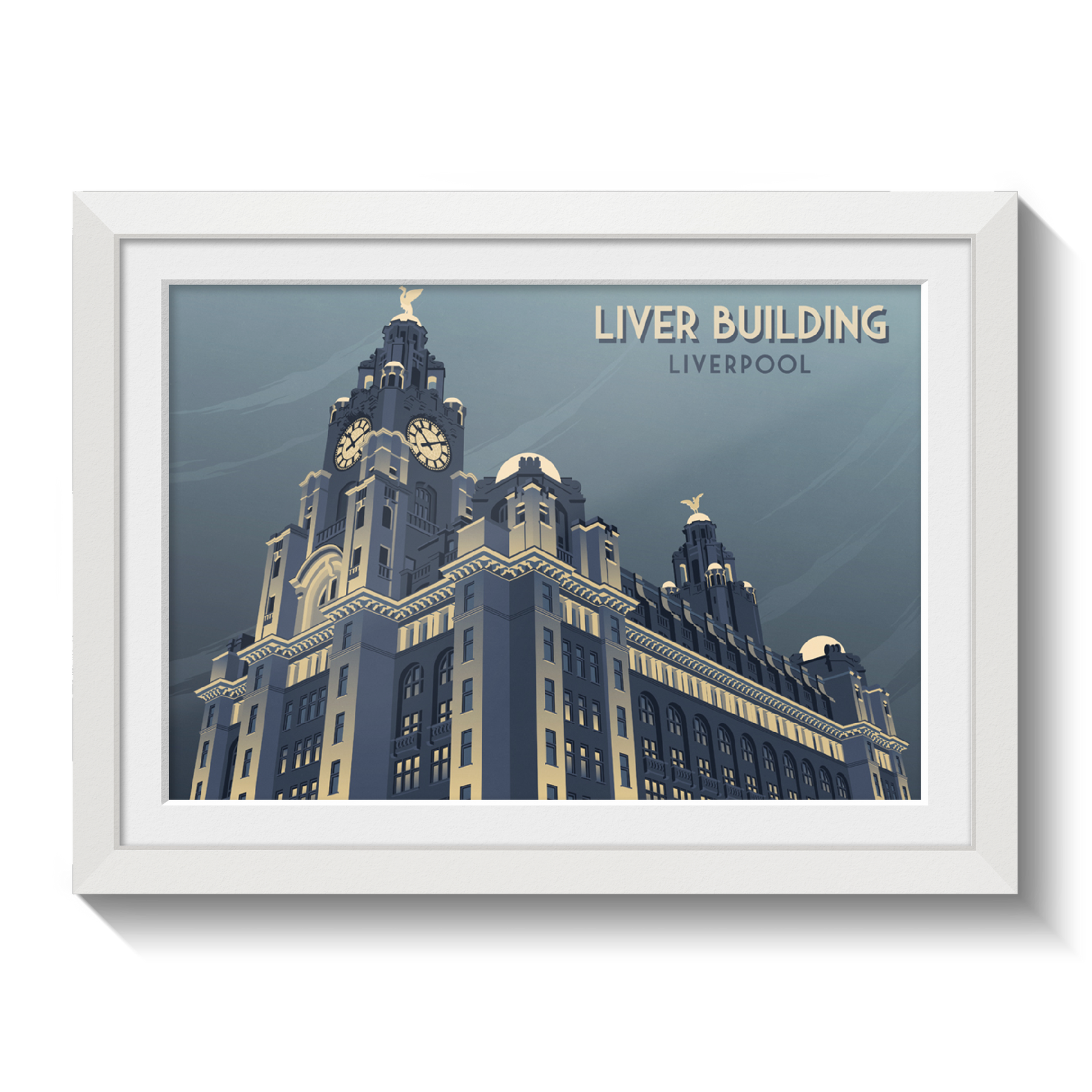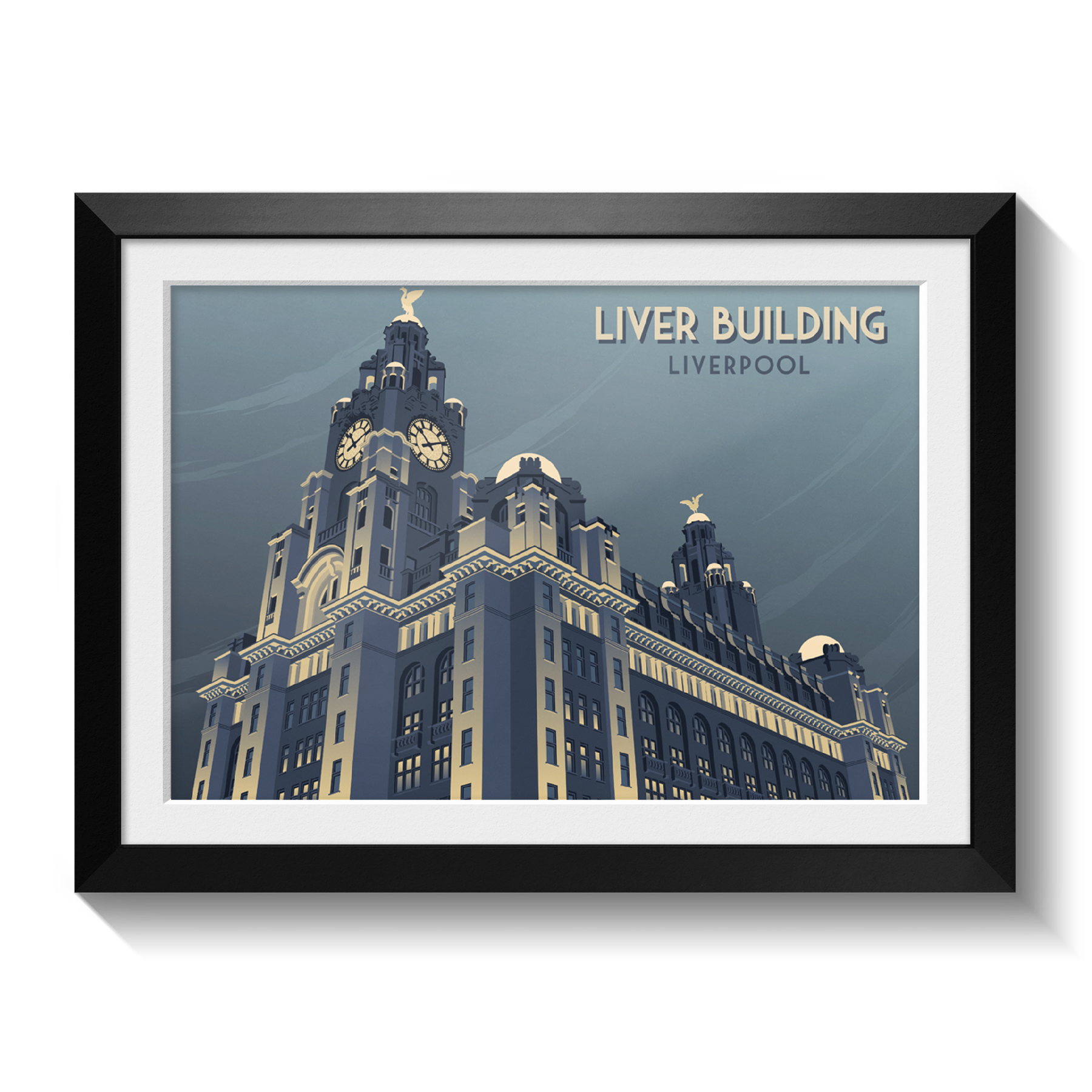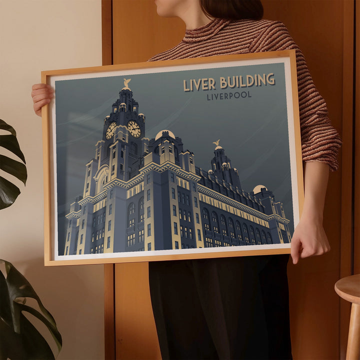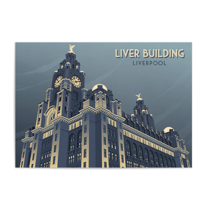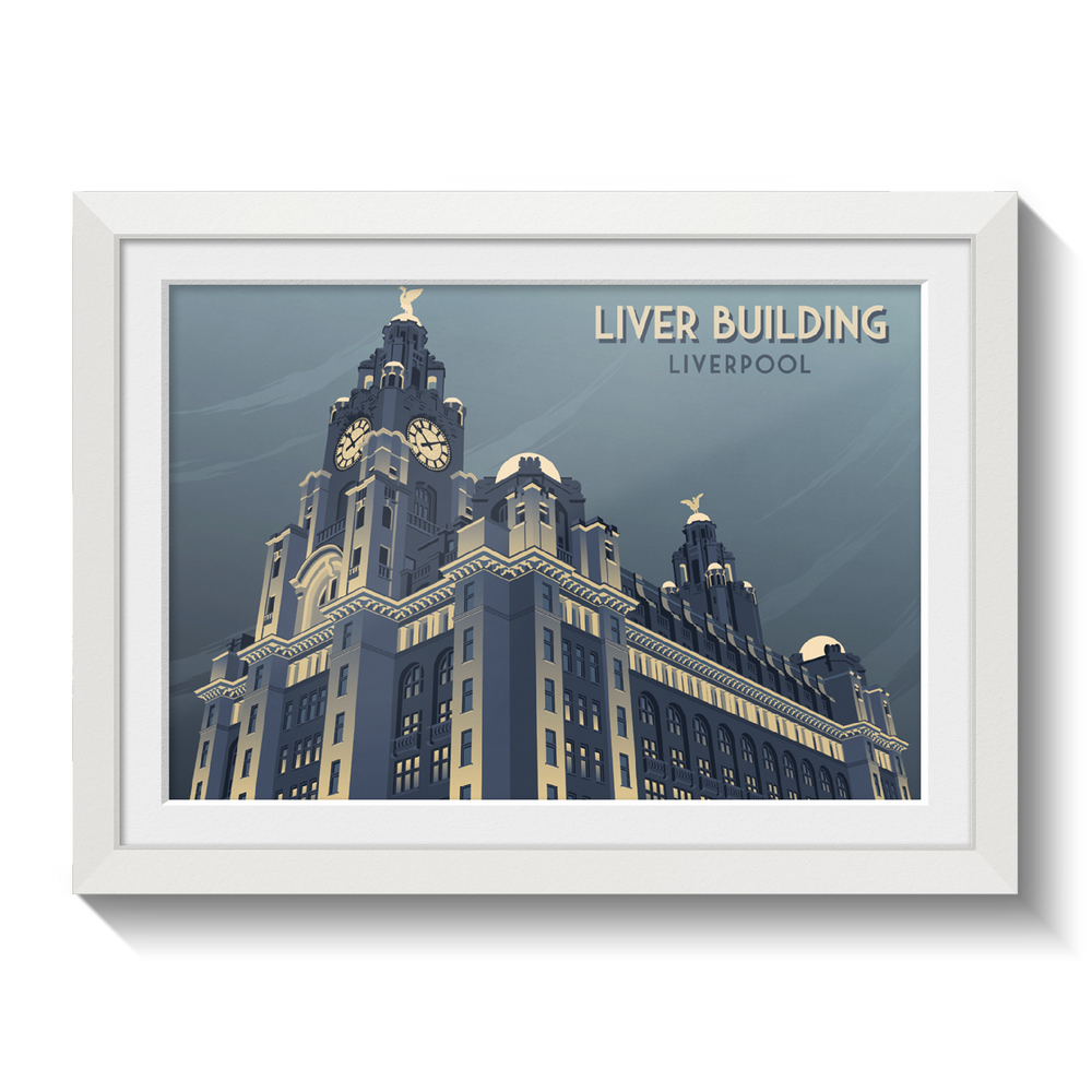 This is an original travel poster featuring one of Liverpool's most iconic buildings, The Liver Building. Located at the Pier Head, the Liver Building is one of Liverpool's 'Three Graces', along with the Cunard Building and Port of Liverpool Building.