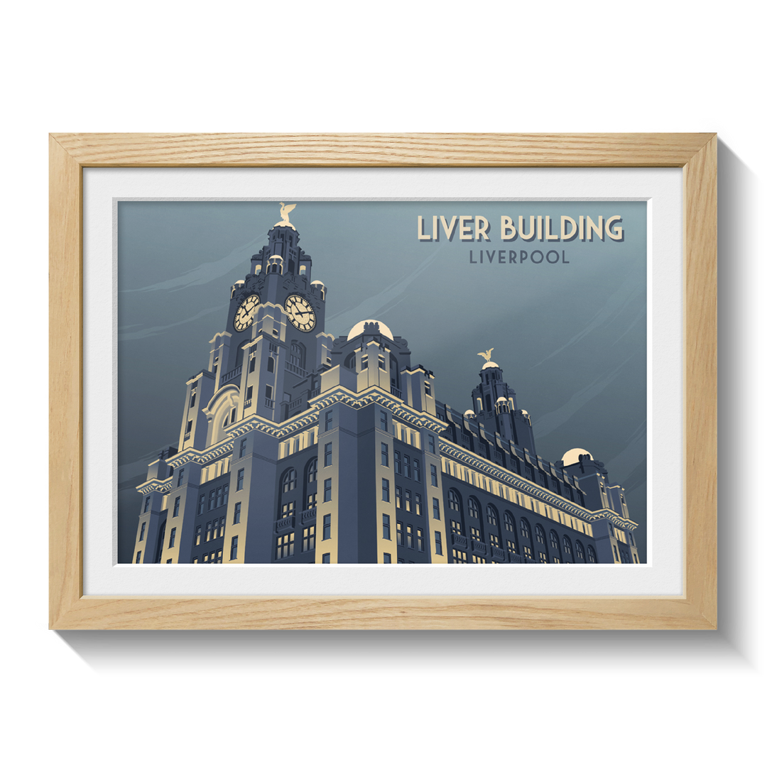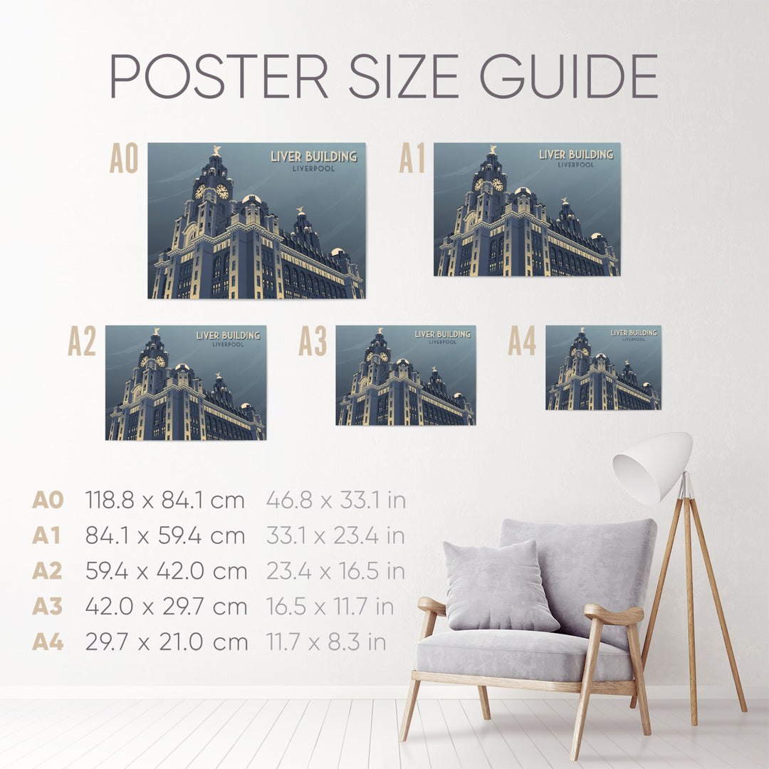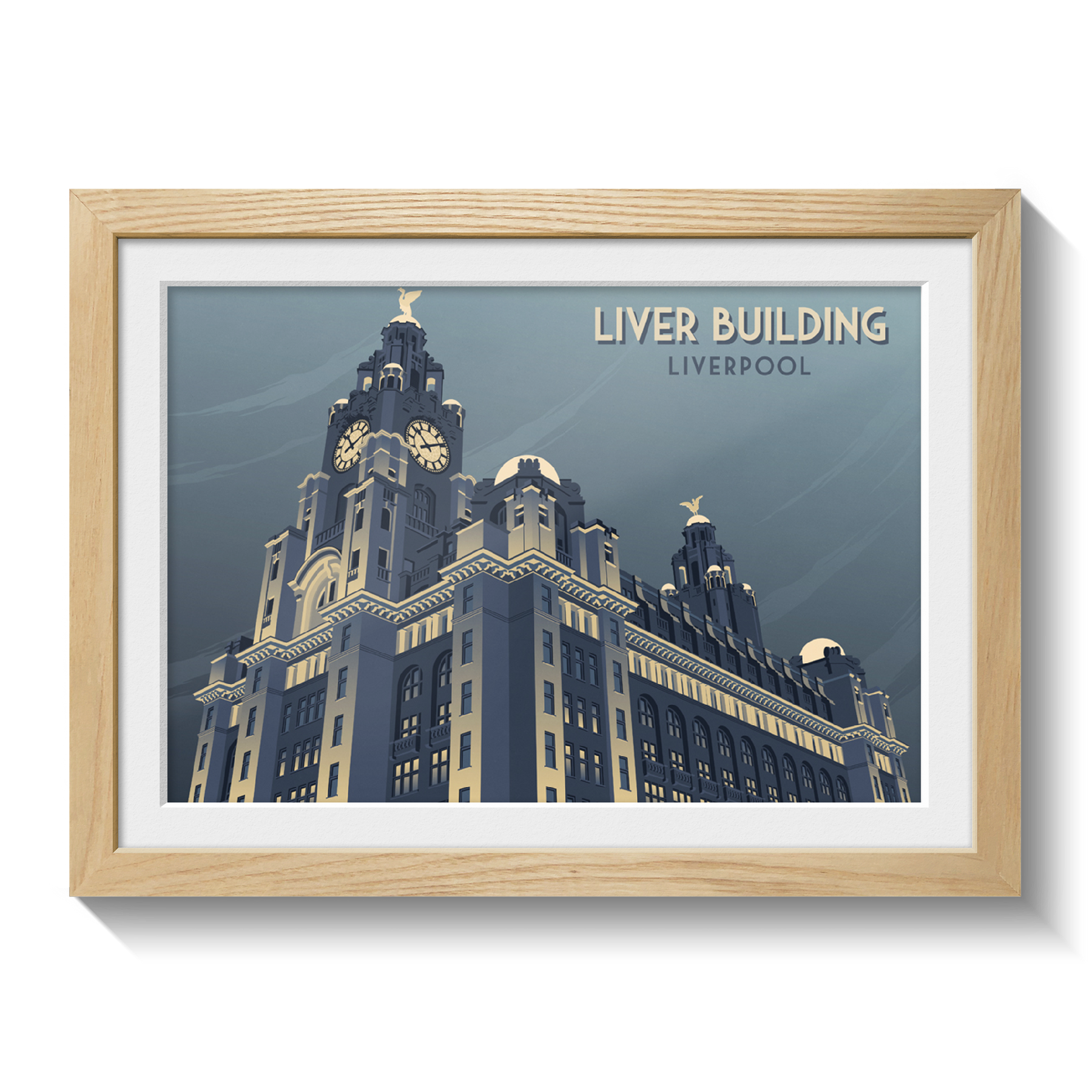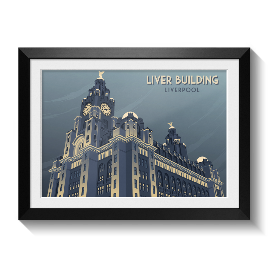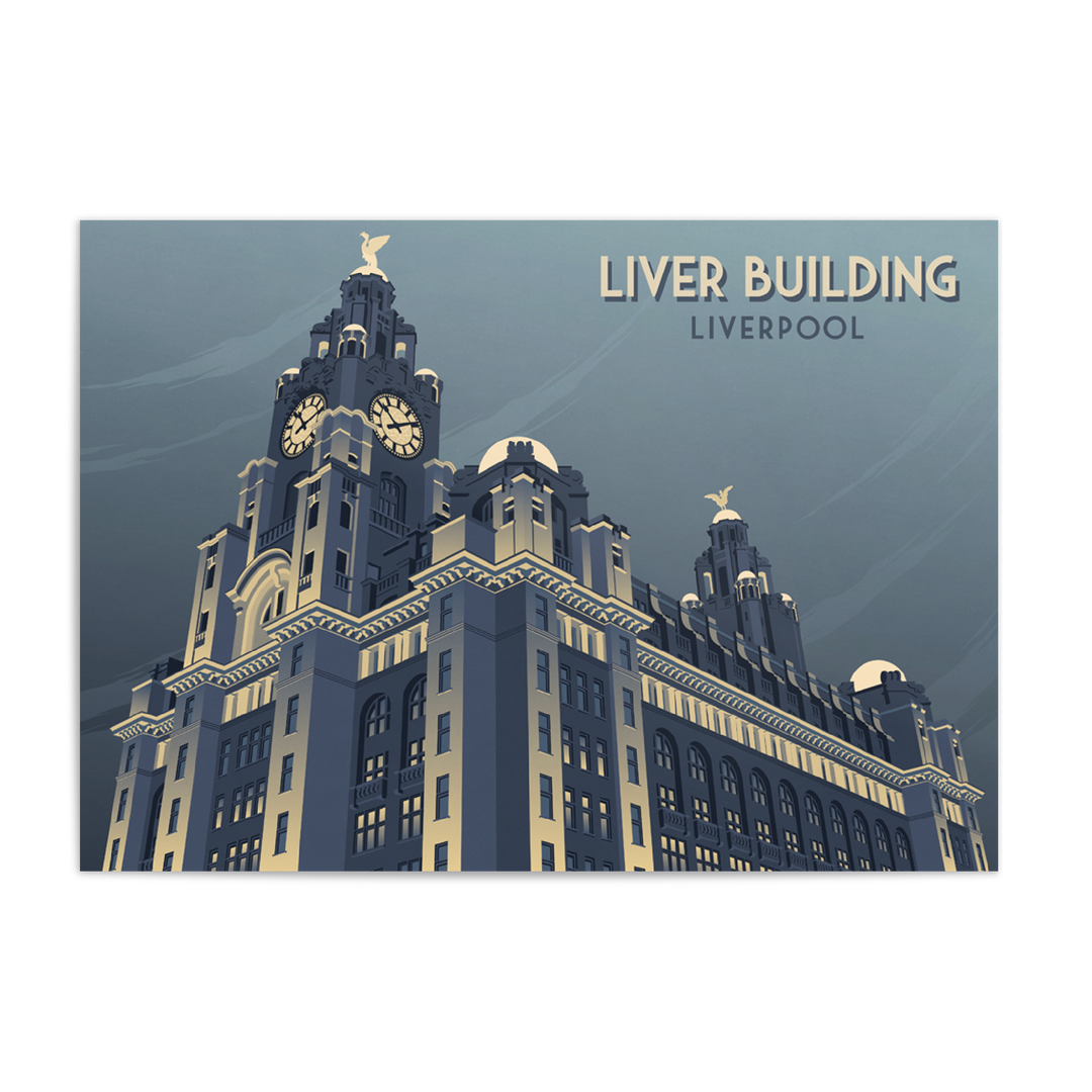 This is an original travel poster featuring one of Liverpool's most iconic buildings, The Liver Building. Located at the Pier Head, the Liver Building is one of Liverpool's 'Three Graces', along with the Cunard Building and Port of Liverpool Building.